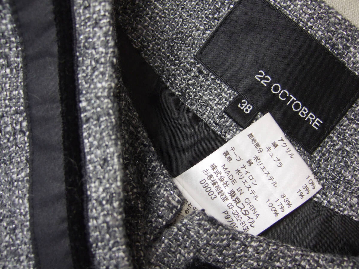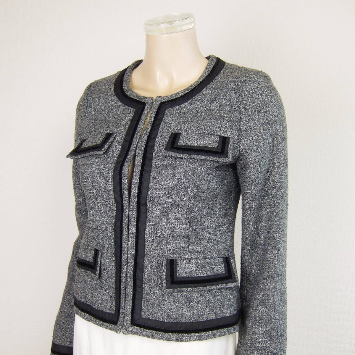 美品★ヴァンドゥーオクトーブル*22OCTOBRE*シルク混*ベロアトリム*ノーカラーツイードジャケット*38.9号.Mサイズ