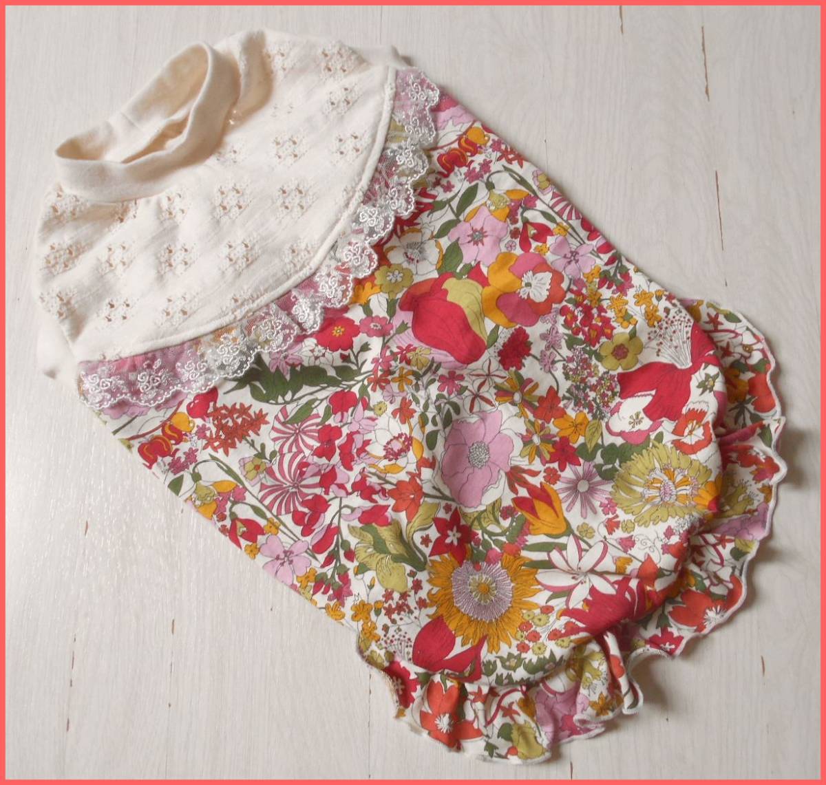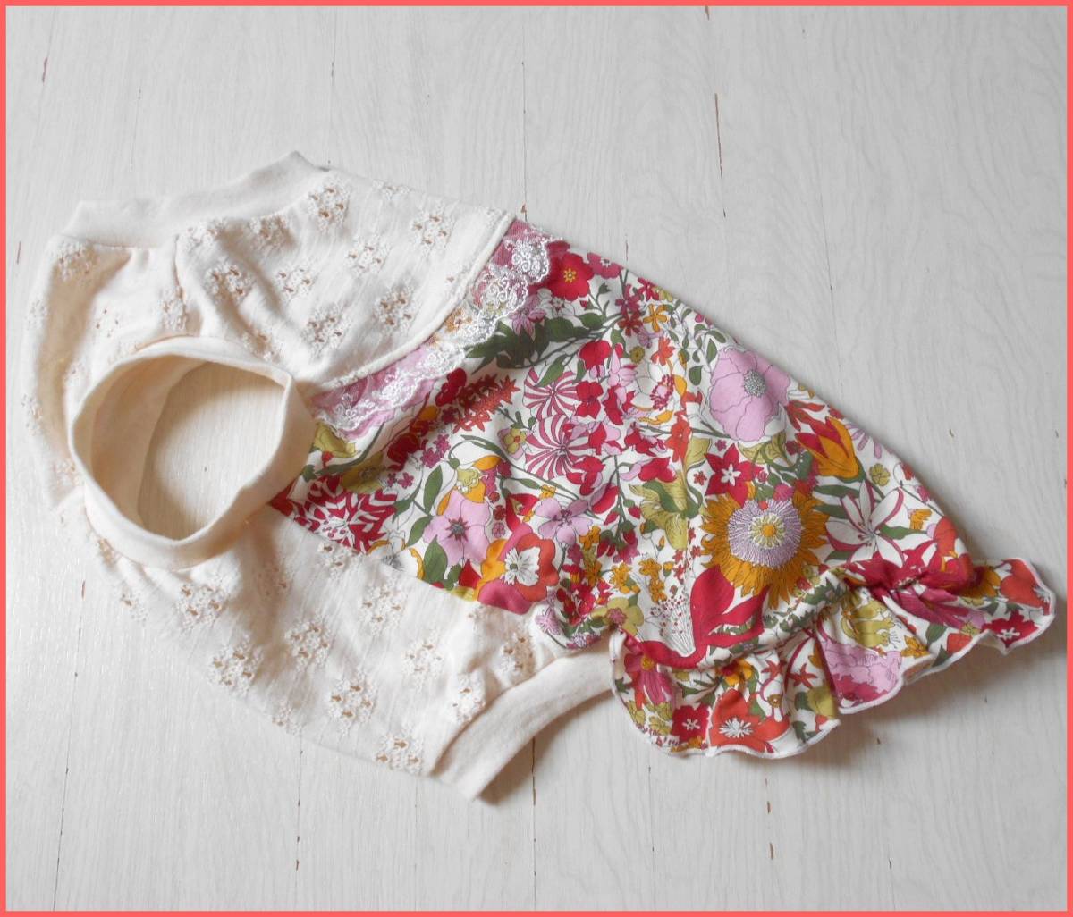 | ★リバティさんの天竺ニットとレースニットを合わせ、裾にはフリルを付けてみました。 | ||