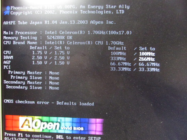 AOpen AX4PE Tube TubeSound Technology Celeron1.7GHz 512MBメモリ BIOS確認済みの出品になります。