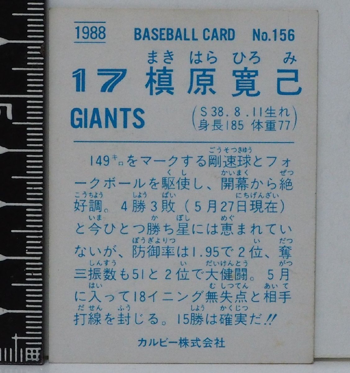 88年 カルビー プロ野球カード No.156【槇原 寛己 読売ジャイアンツ巨人】昭和63年 1988年 当時物 Calbeeおまけ食玩BASEBALL【中古】送料込