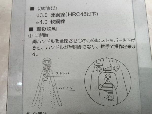 切断能力 φ3.0 硬鋼線(HRC48以下) φ4.0 軟鋼線 全長:約270mm |