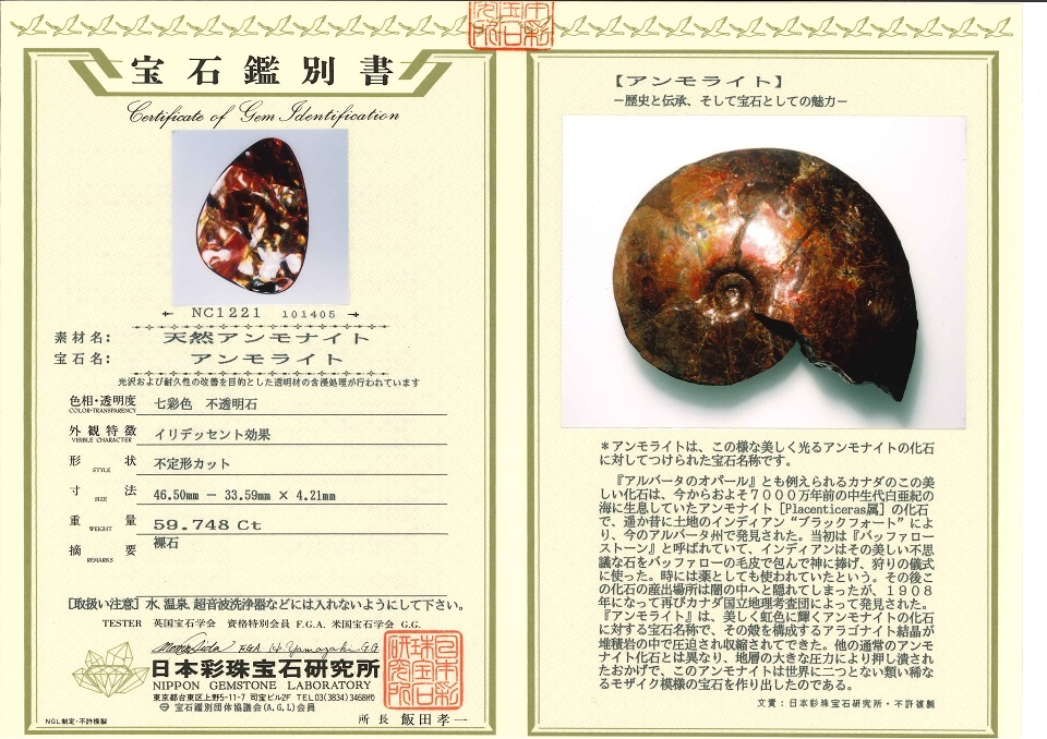 解説 | 果てしない時空を超え、化石化したアンモライトは、カナダのアルバータという限定された地域からしか採取されない稀少石。天然の業とは思えない鮮烈なグリーンとオレンジの遊色が角度によってドラマチックに変幻!壮大な夢とロマンが凝縮された神秘の光彩へのリスペクトを感じさせる秀逸品。 |