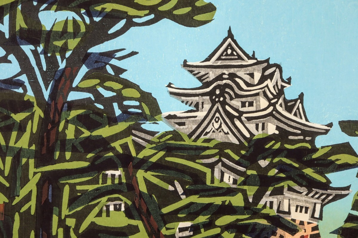 真作 橋本興家 1976年木版画「姫路城早春」画 40×30cm 鳥取県出身 平塚運一に師事 城の版画家 伝統的木版技法に大胆構図と豊かな色彩 9067