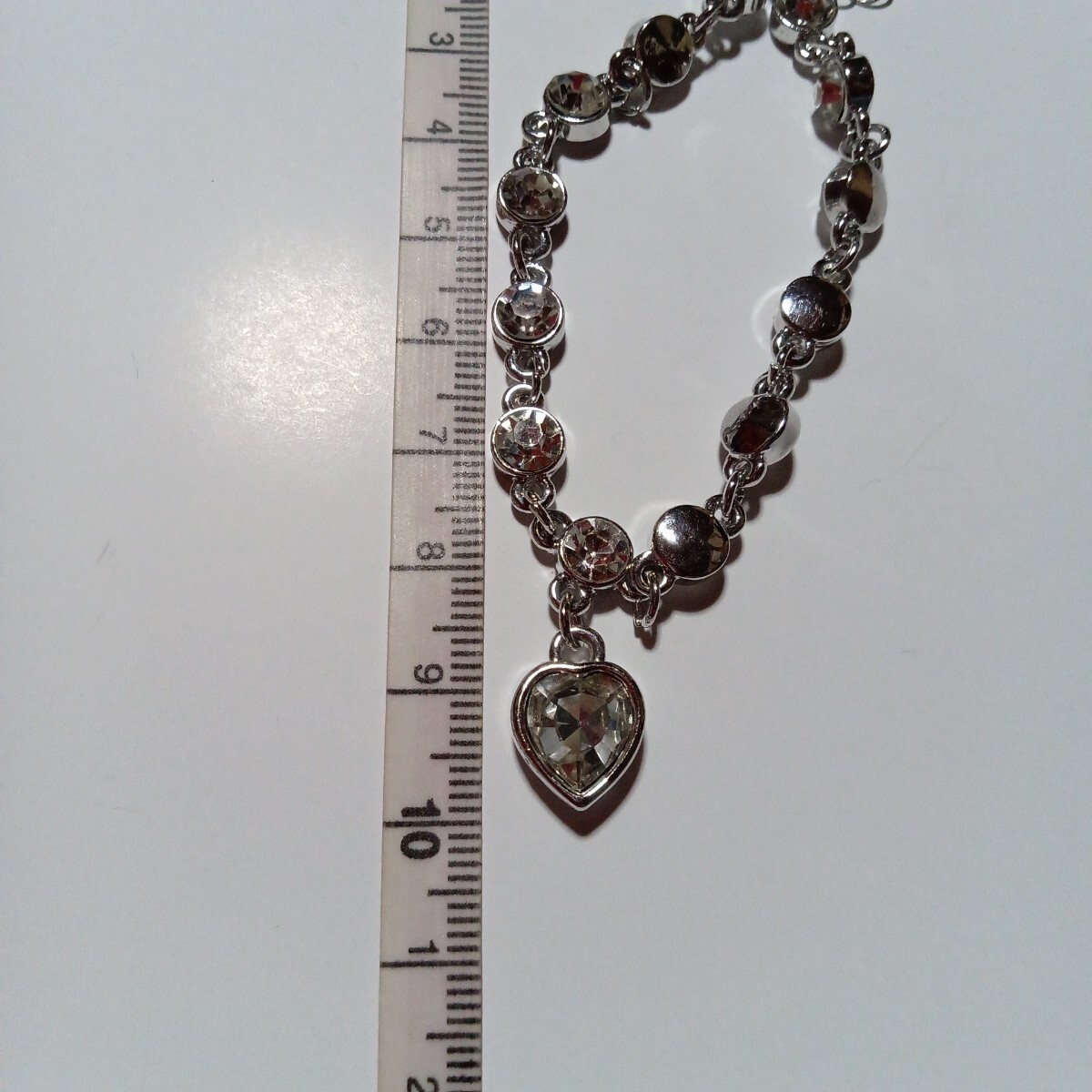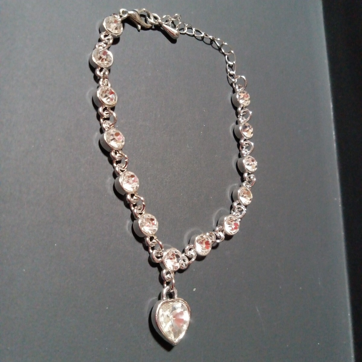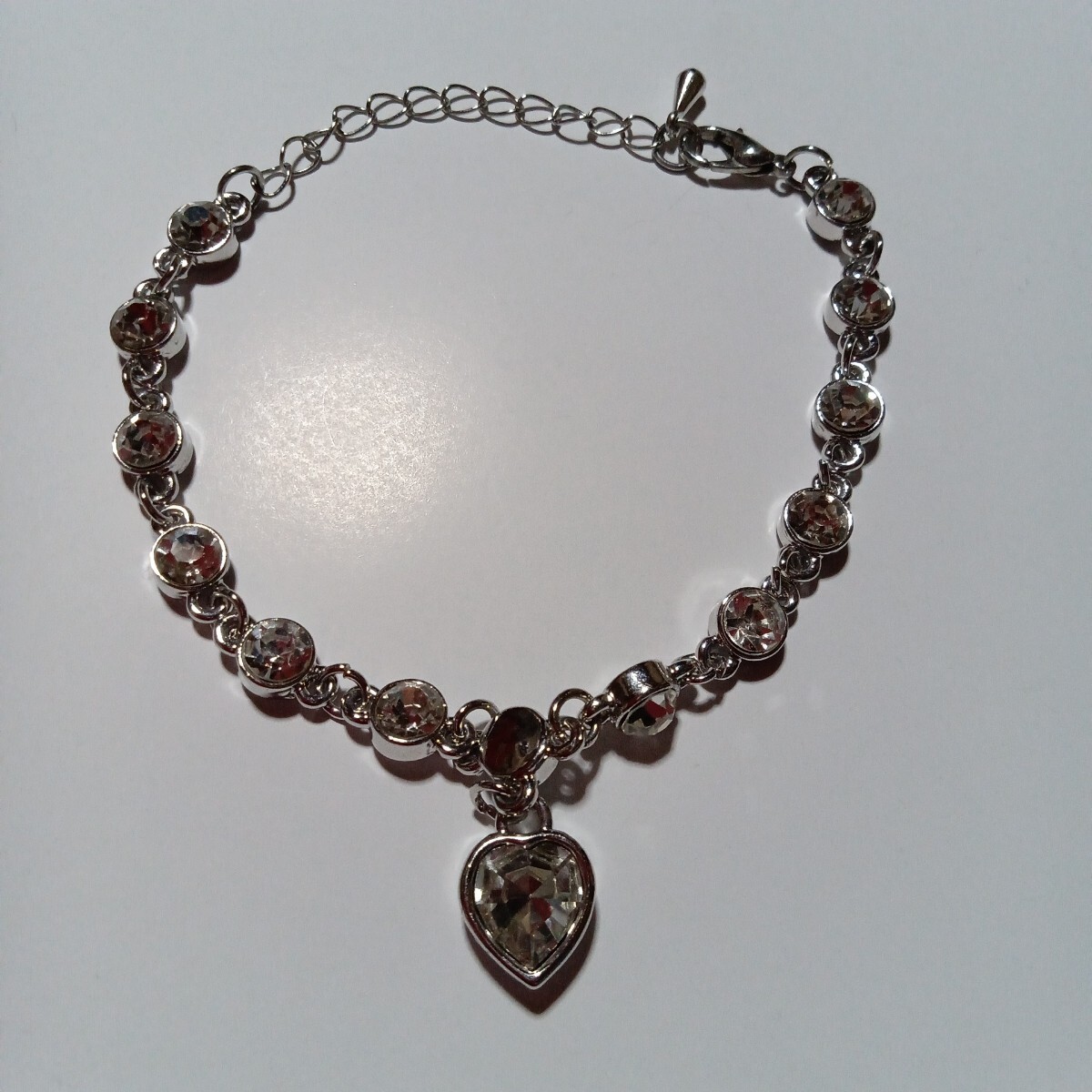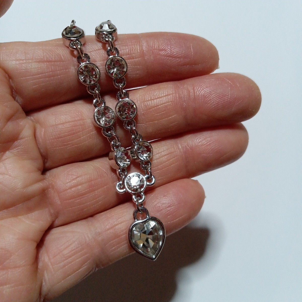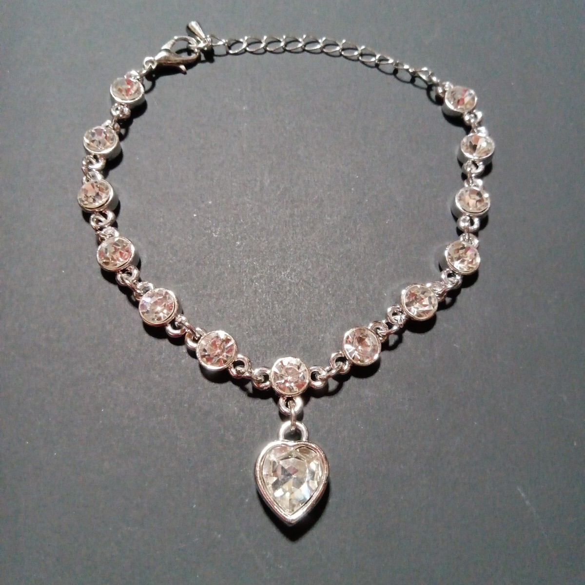 透明感の有るラインストーンの粒たちが美しい素敵なブレスレットです。チェーンの部分にはラウンド型のストーンが用いられ、アクセントに一粒のハートがスイングする愛らしいデザインです。細かなカットで、光やライトが当たるとキラキラと輝いてとても綺麗です。単品でも素敵ですが、他のブレスレットや、リストウォッチとの重ね付けにもおすすめです。プレゼントにも。。。