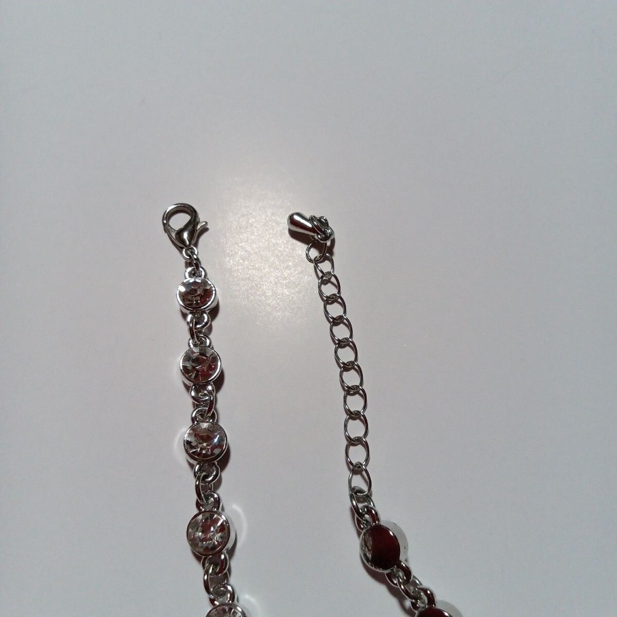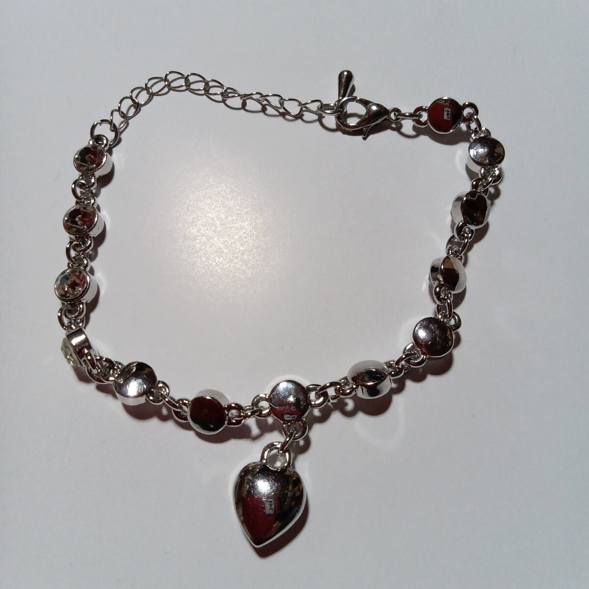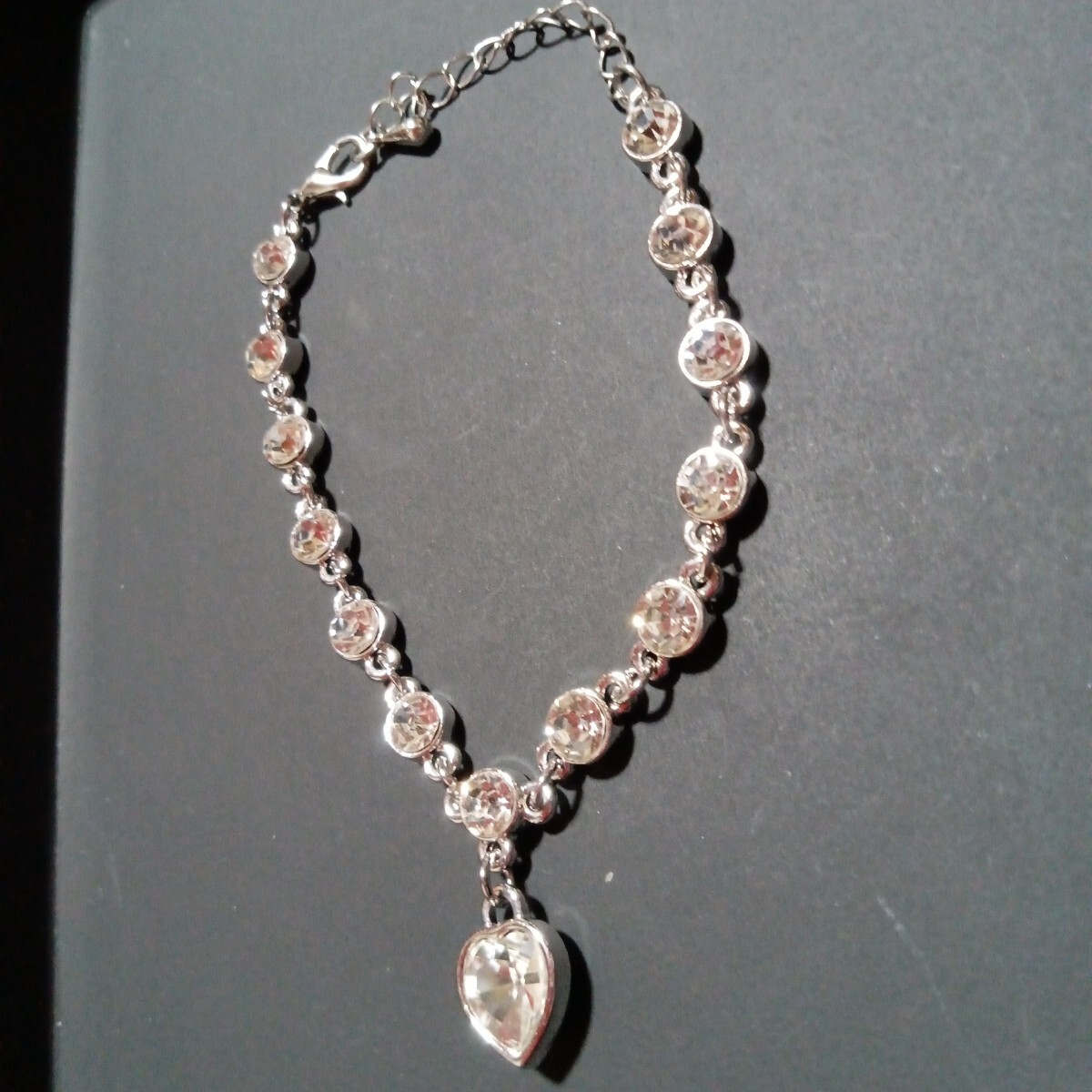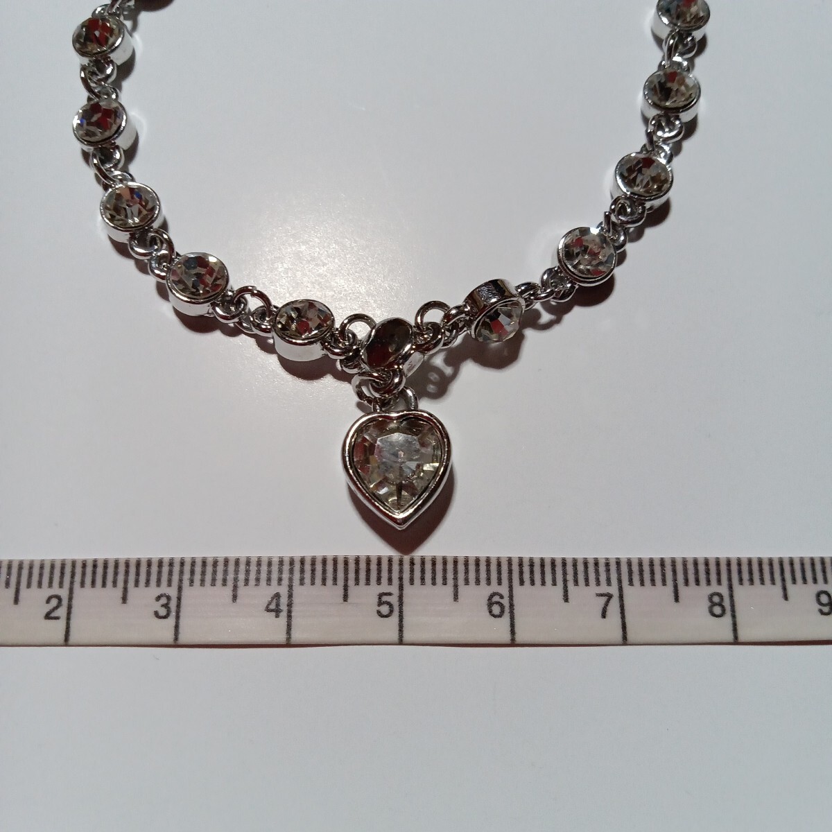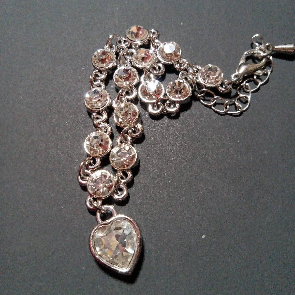 透明感の有るラインストーンの粒たちが美しい素敵なブレスレットです。チェーンの部分にはラウンド型のストーンが用いられ、アクセントに一粒のハートがスイングする愛らしいデザインです。細かなカットで、光やライトが当たるとキラキラと輝いてとても綺麗です。単品でも素敵ですが、他のブレスレットや、リストウォッチとの重ね付けにもおすすめです。プレゼントにも。。。