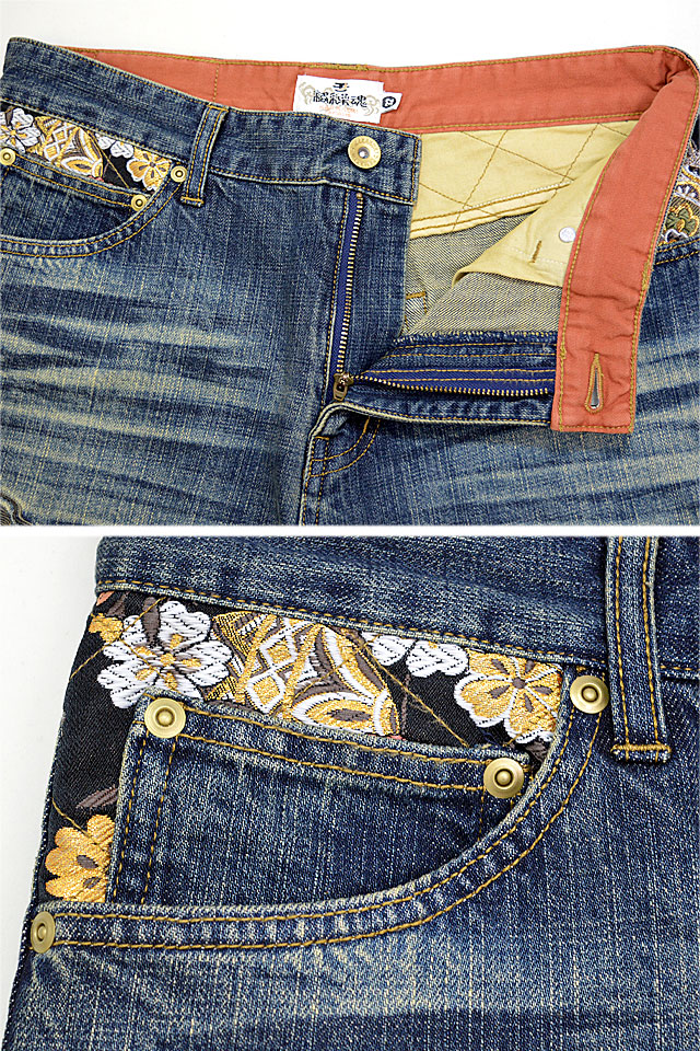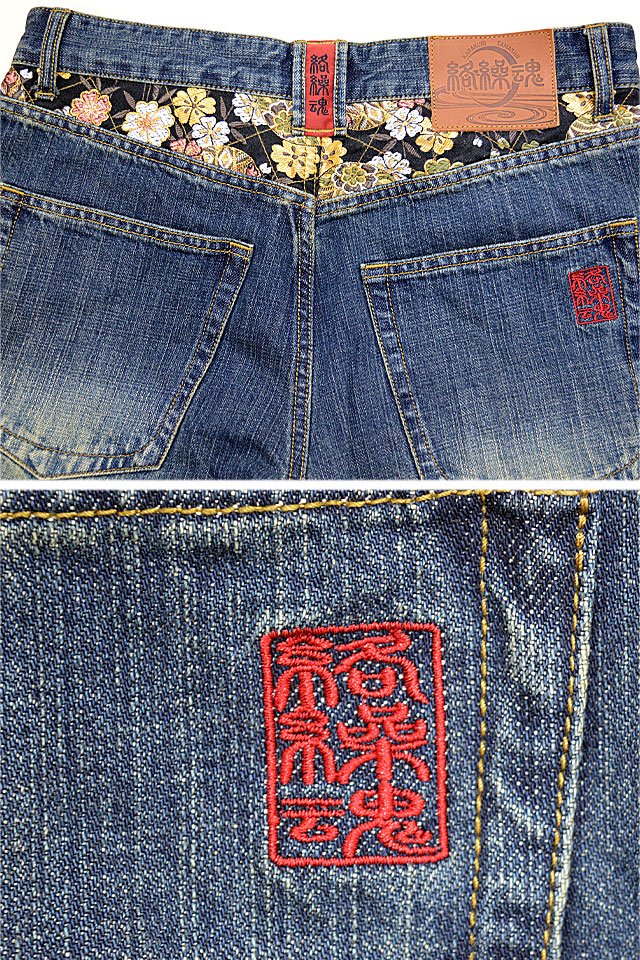 絡繰魂さんから「桜昇龍刺繍デニムパンツ(232224)」のご紹介です。 フロント左腿に昇龍をダイナミックに刺繍しました。 背景には桜吹雪が散りばめられています。 花びら一枚一枚まで刺繍で表現されており、見るものを魅了すること間違いなしの逸品。 フロントポケット内側、バックヨークには金襴生地を切り替え、アクセントに。 バック右ポケットにはブランドロゴを印風に刺繍しました。 トップボタンには、ブランドロゴが刻印されたオリジナルのものを採用。 | |||||||||||||||||||||||||||||||||||