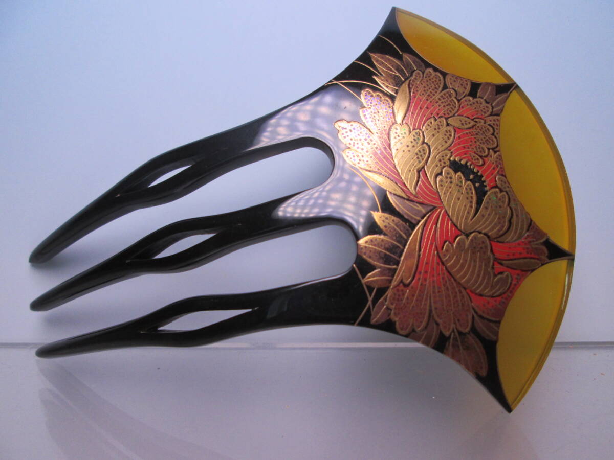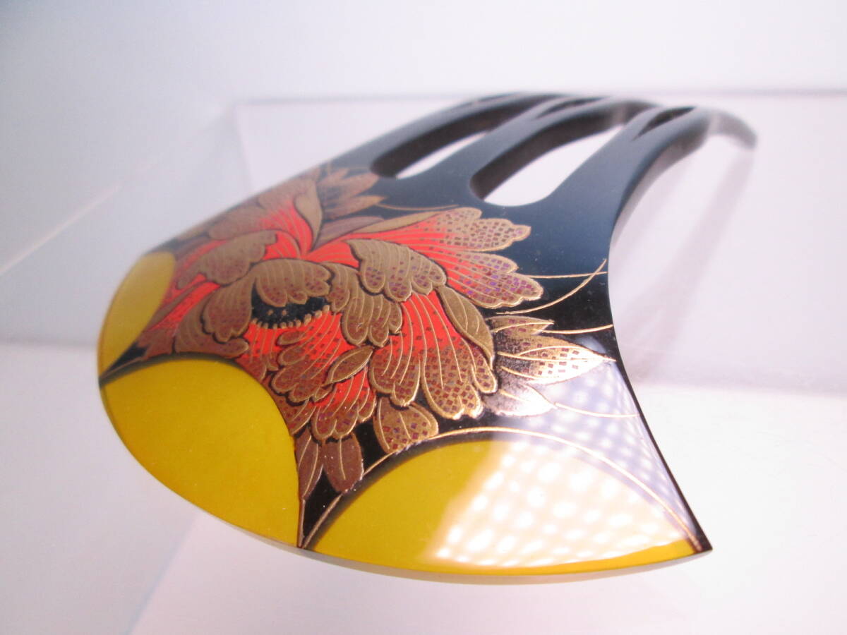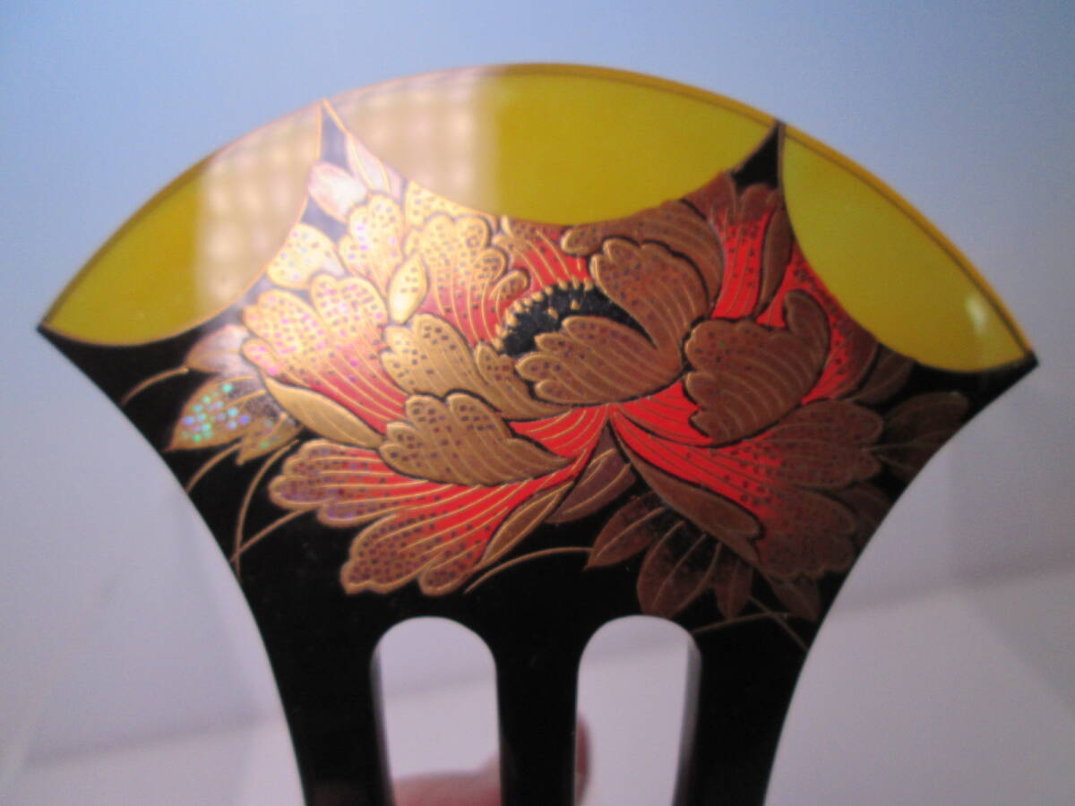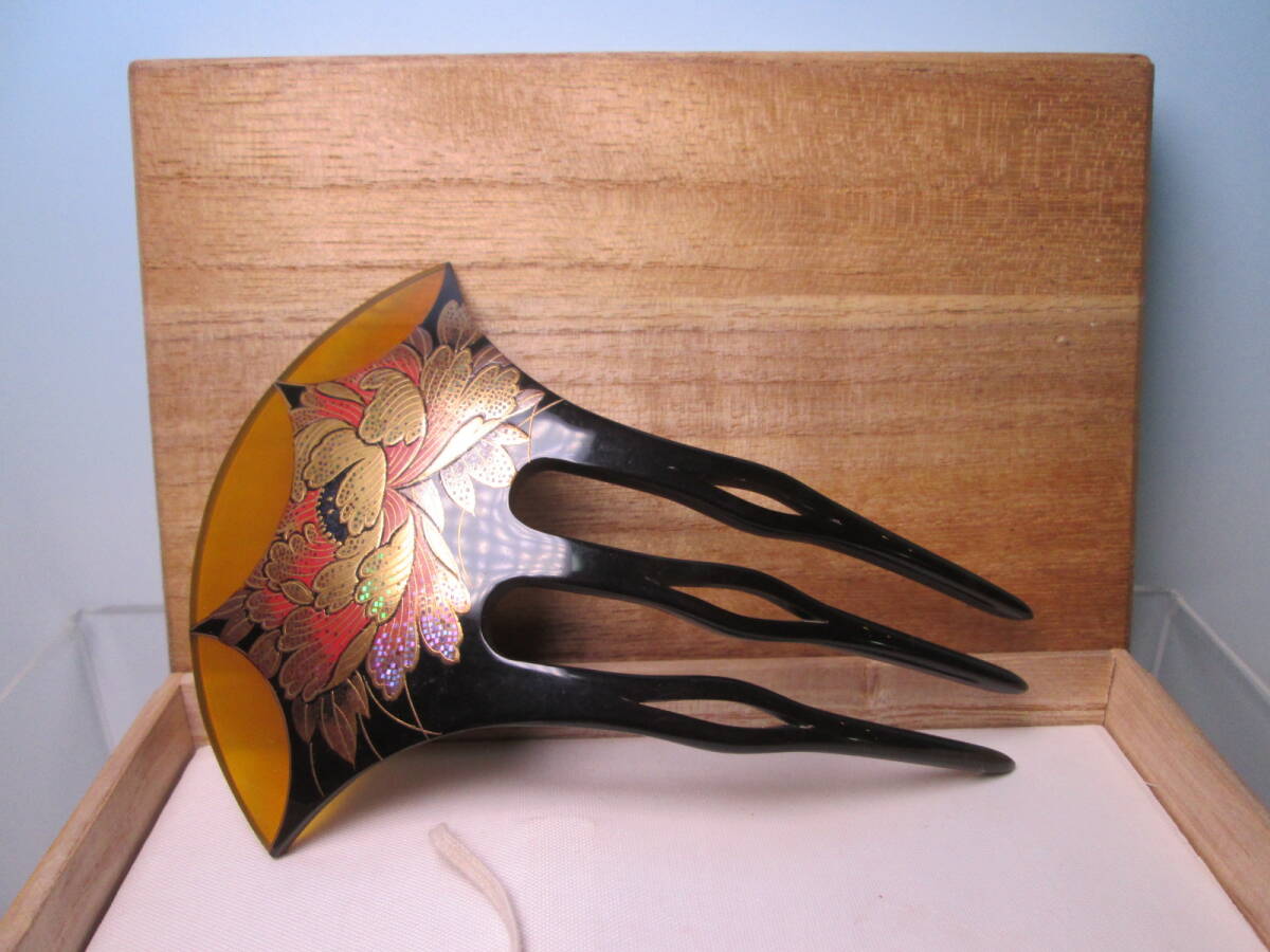 【江月】良生作 本鼈甲 螺鈿細工 金蒔絵 牡丹の花文 大振りなかんざし 木箱付