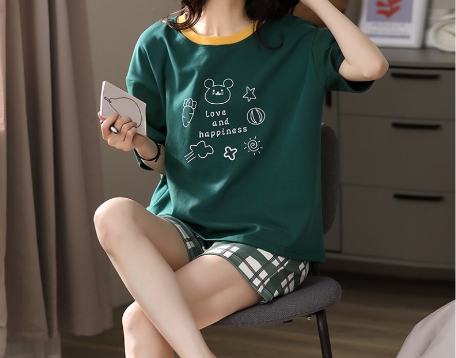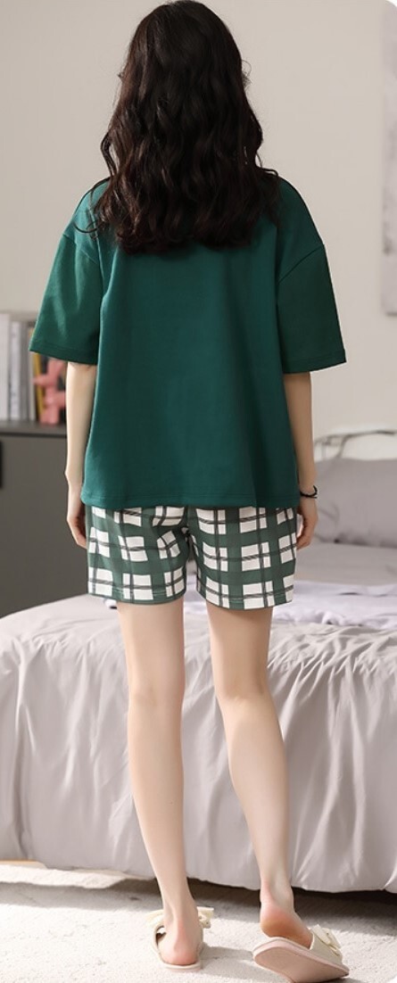 送料無料 部屋着 ルームウェア 半袖 上下セット グリーン×チェック サイズ XL 新品 【Pza】 ⑧