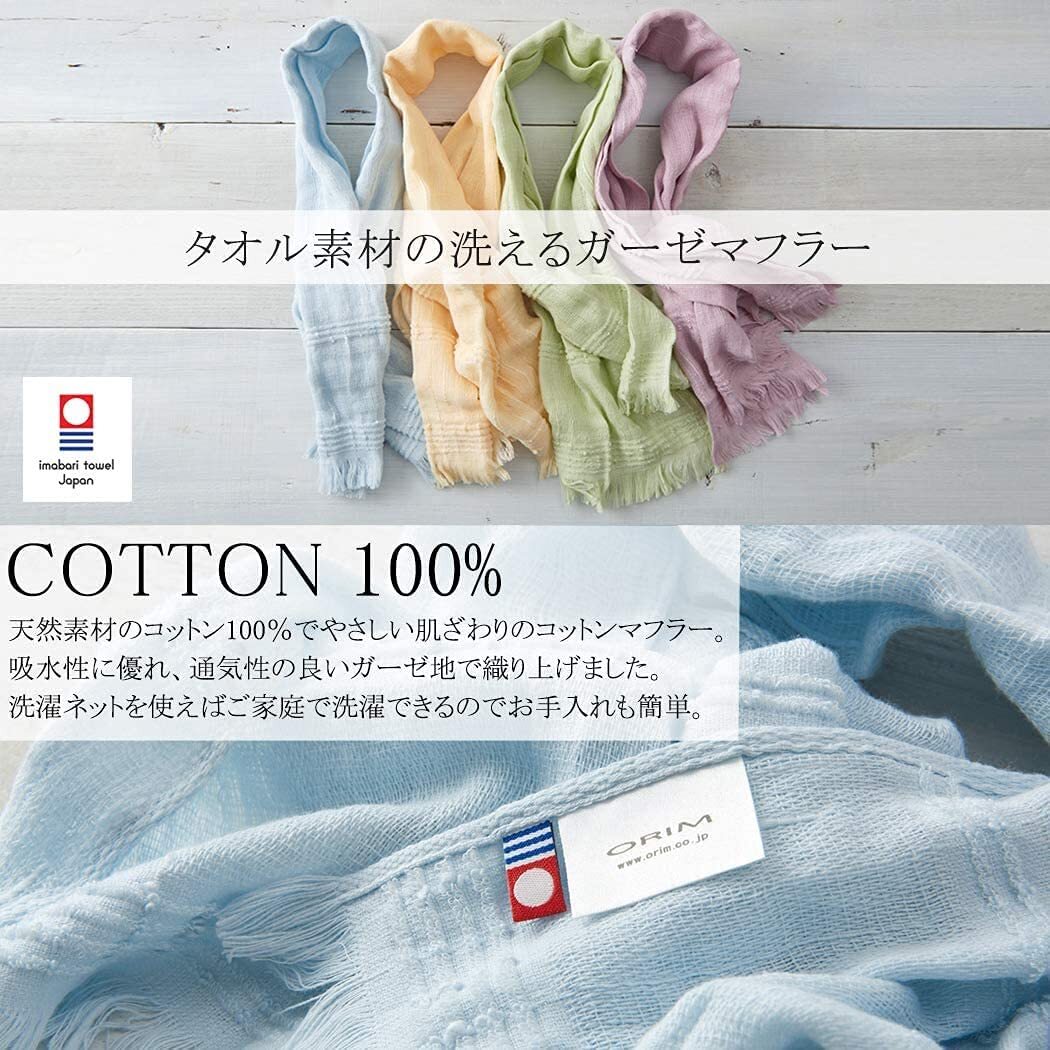 軽くて、ふんわりやさしい肌ざわりのコットン100%のマフラー。保湿性や通気性に優れるガーゼ地で織り上げ、オールシーズン使用できます。
