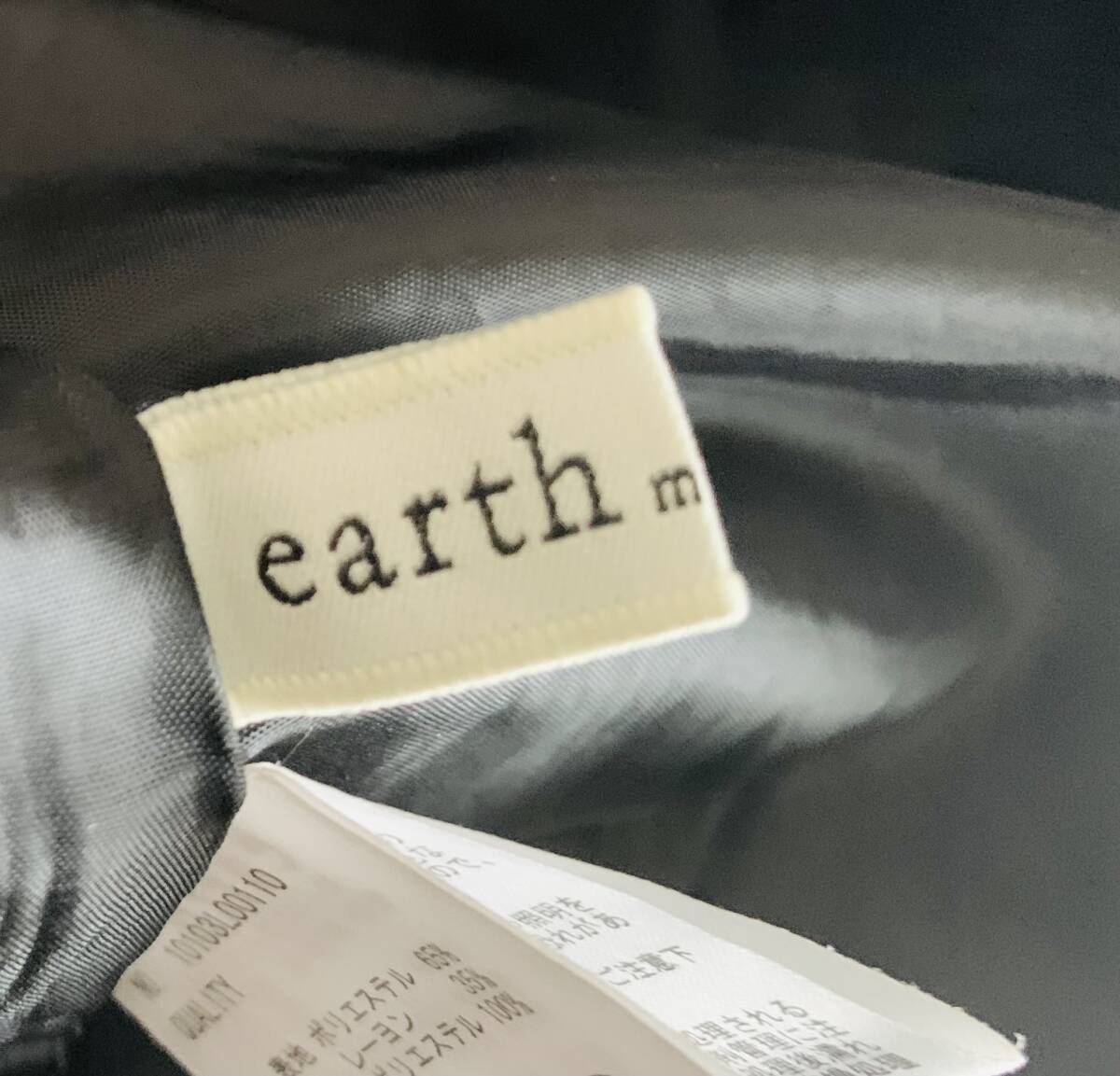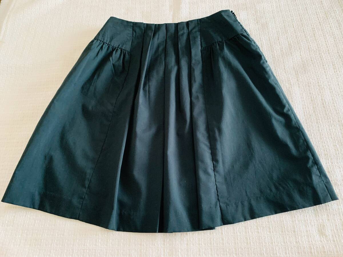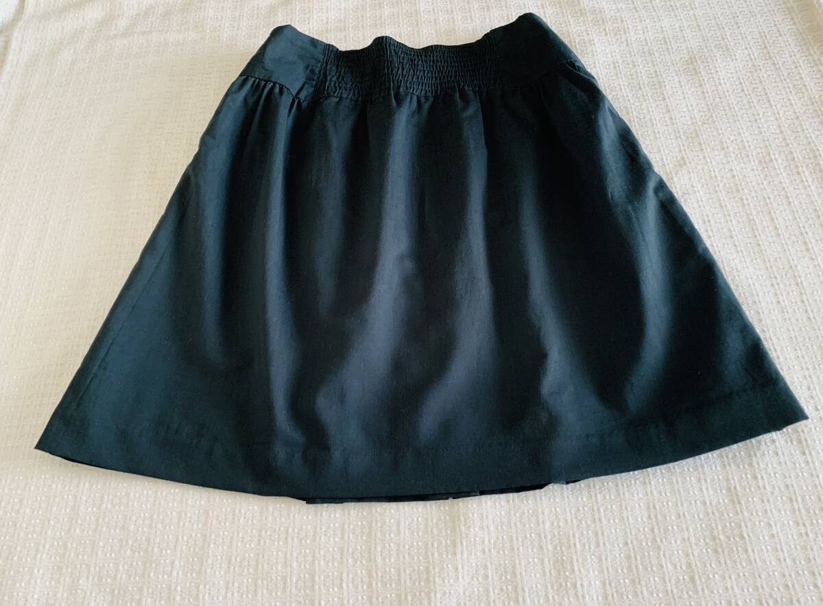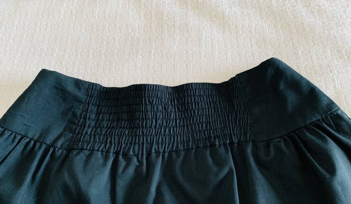 アースミュージックアンドエコロジーのスカートです。青味がかったダークグリーンで落ち着いた印象です。フロントはタックがとってあり、サイドはギャザー、バック中央はゴムのシャーリングで、デザインのポイントになっています。素材は表地がポリエステル65%、レーヨン35%、裏地はポリエステルです。丈約50㎝、ウエストは平置きで約33㎝ですが、バックがゴムのシャーリングの為、伸びます。MからLサイズの方向きです。アースミュージックアンドエコロジーの中では上品な感じの深いグリーンのお色味なので春から夏、秋口まで着用でき、落ち着いたデザインで幅広い年代の方が着用できると思います。