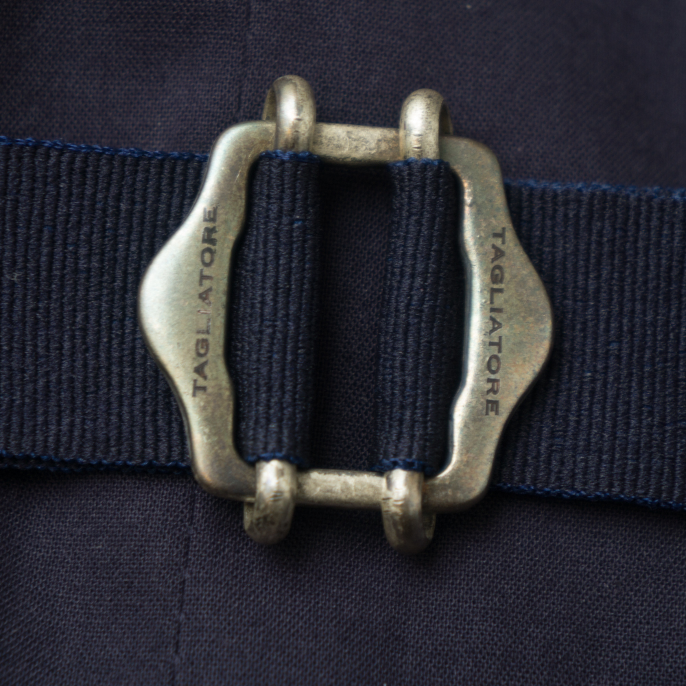 仕立て方にもTAGLIATOREらしい哲学が感じられ、後ろ身頃を裏地で整えたクラシカルなバックベルト付スタイルとなっております。バックベルトは伸縮性があり着心地に配慮されています。