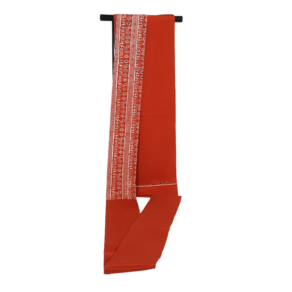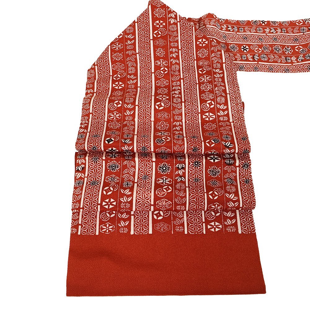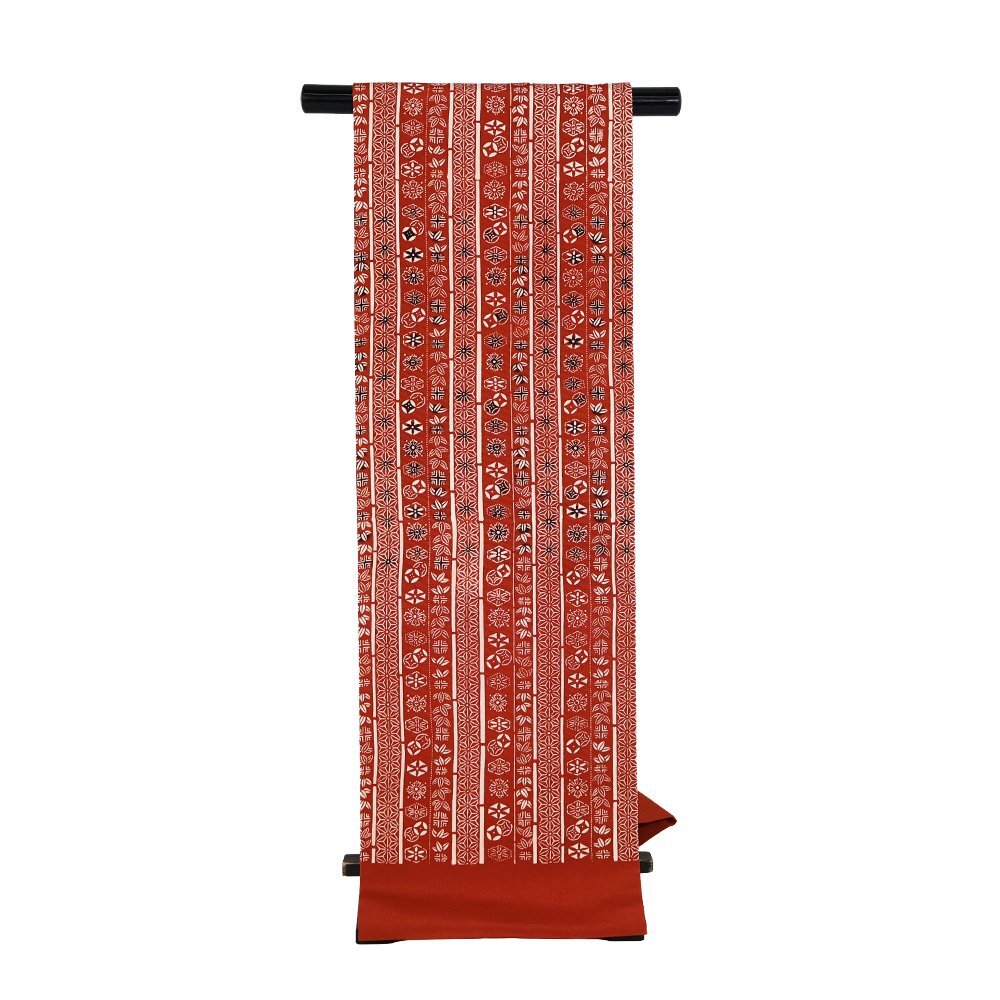| 縮緬名古屋帯 草木染 赤茶地 型染・笹・麻の葉・花文様・縦縞 新品 仕立て上がり | |