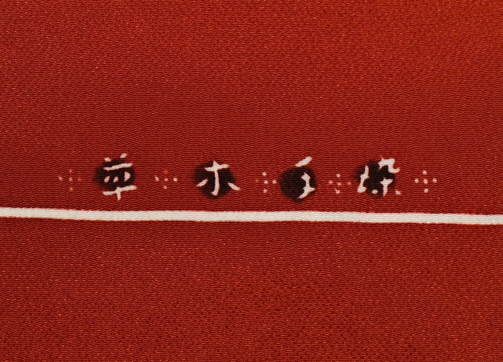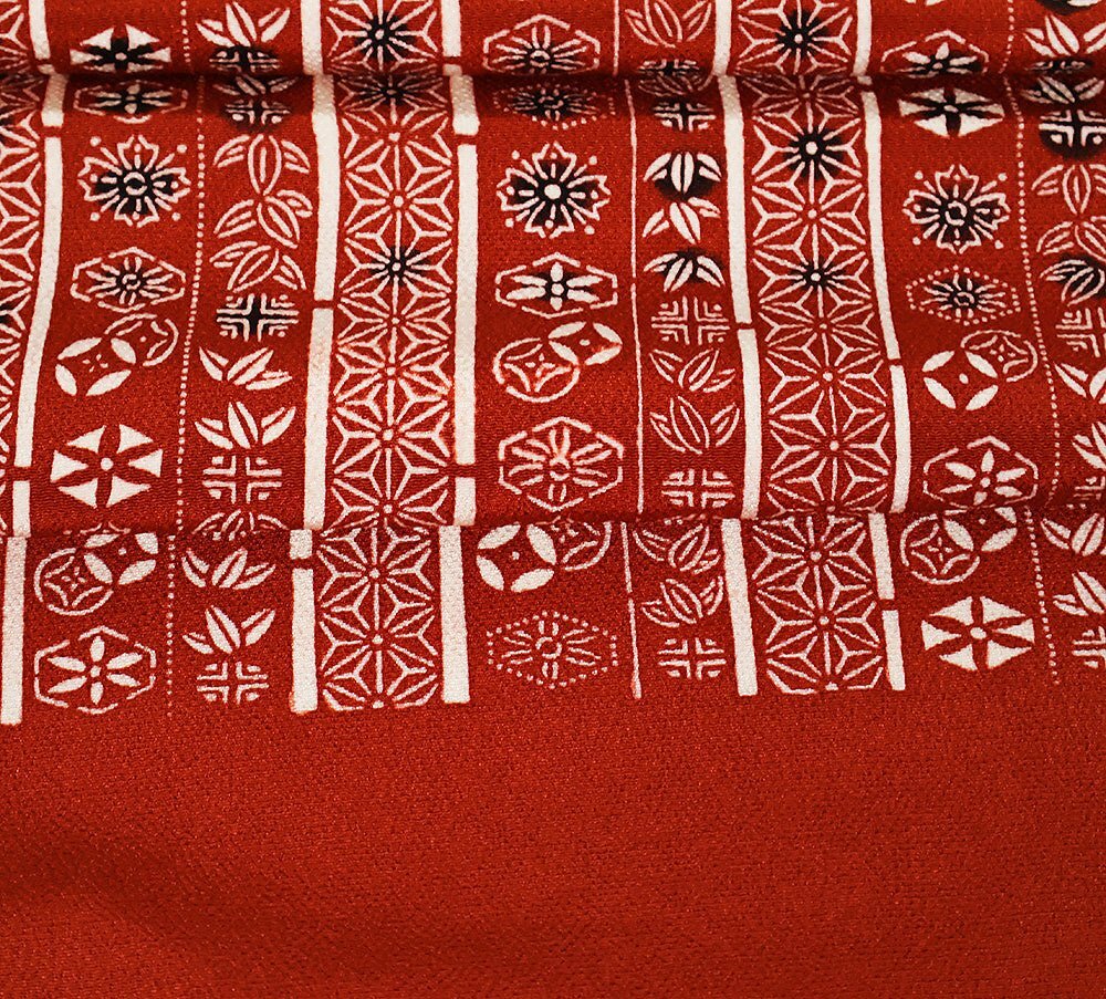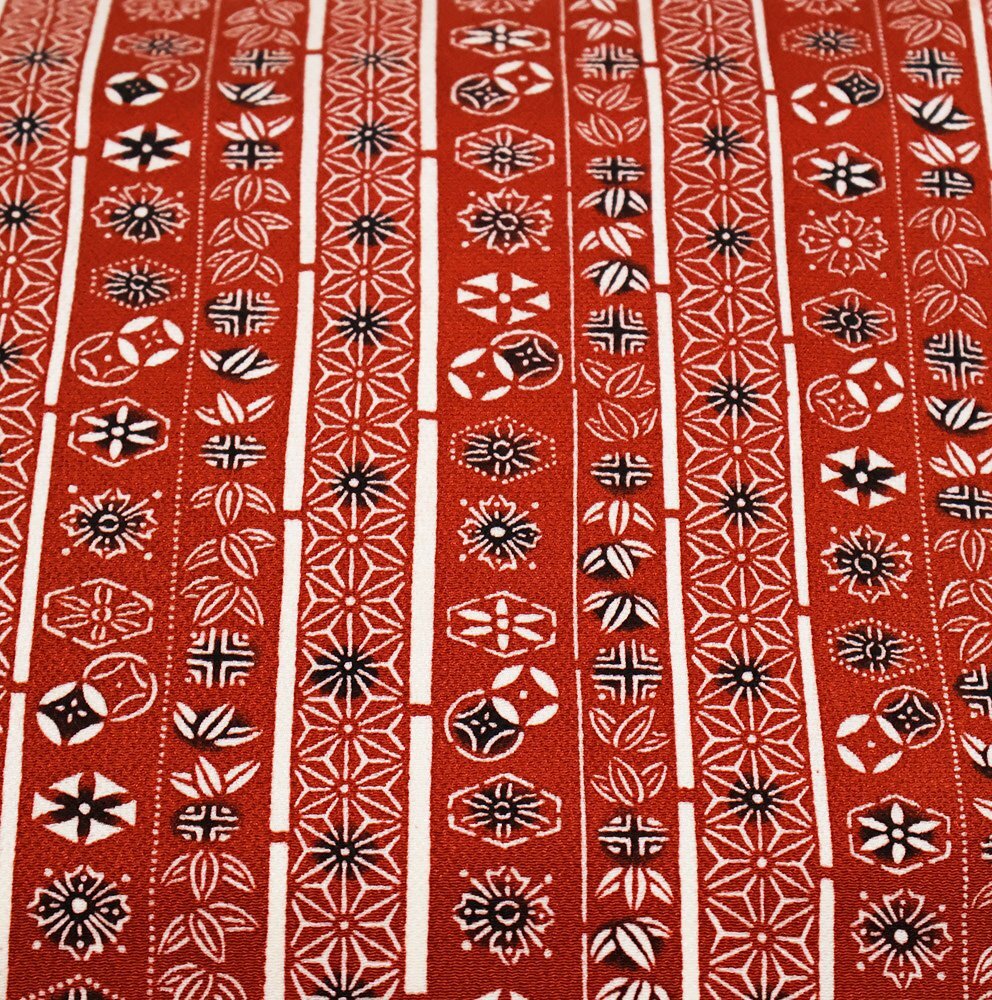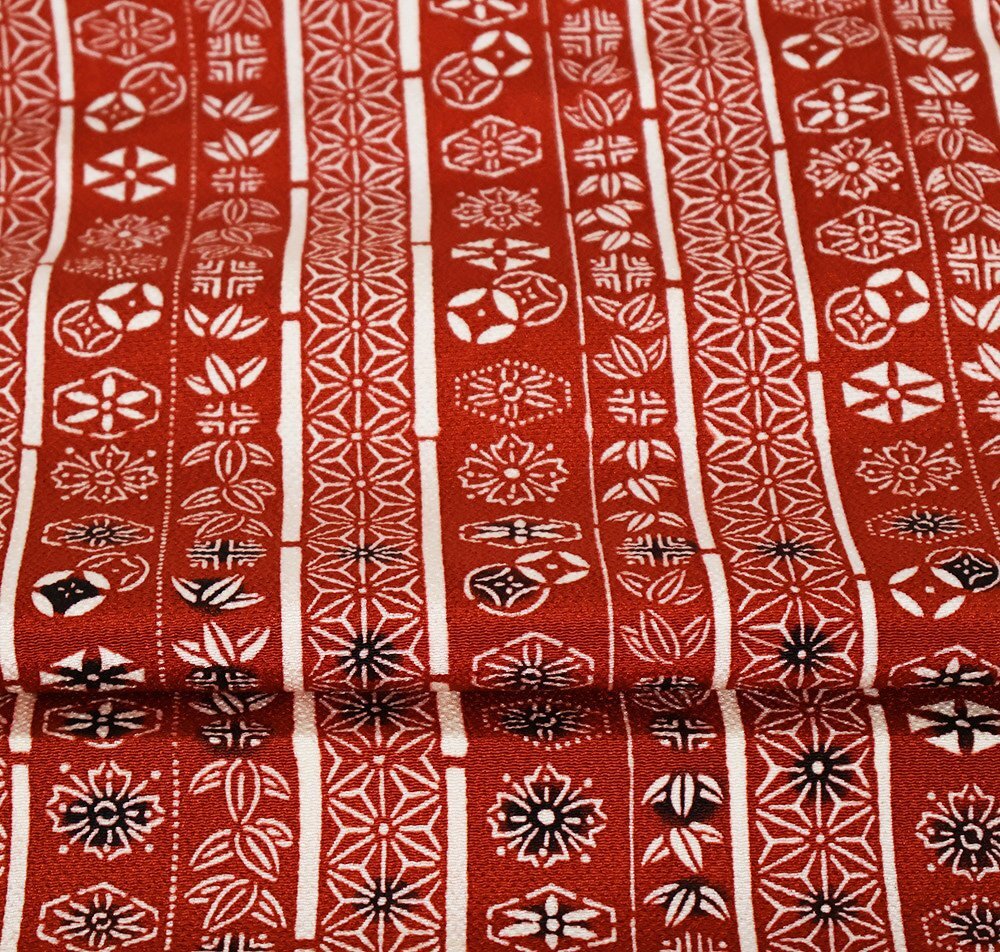 | 縮緬名古屋帯 草木染 赤茶地 型染・笹・麻の葉・花文様・縦縞 新品 仕立て上がり | |