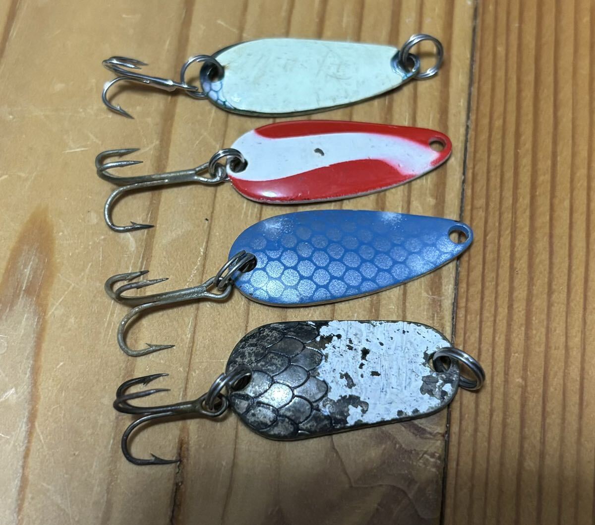 オールドスプーン4個セット。3〜5g。JAPAN製、USA製、たしかオリムピックのCONGERなど。商品名やカラーに間違えなどあるかもしれませんので、詳細や状態は画像にてご確認ください。気になる点はご質問ください。