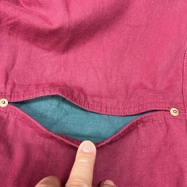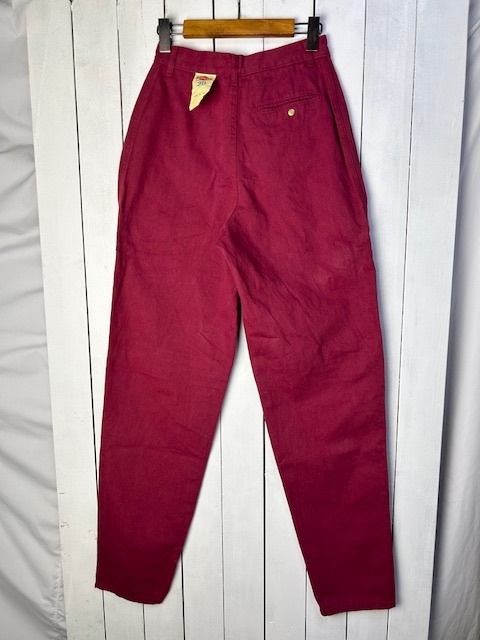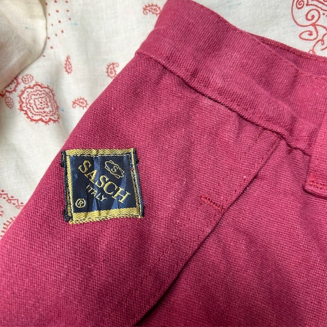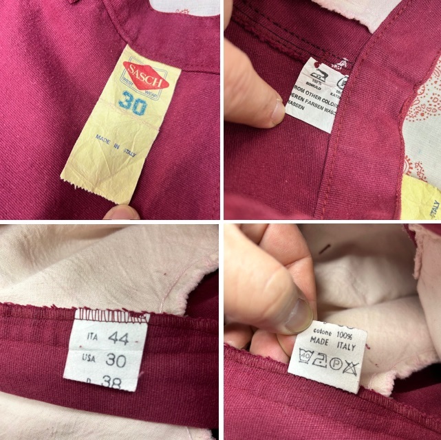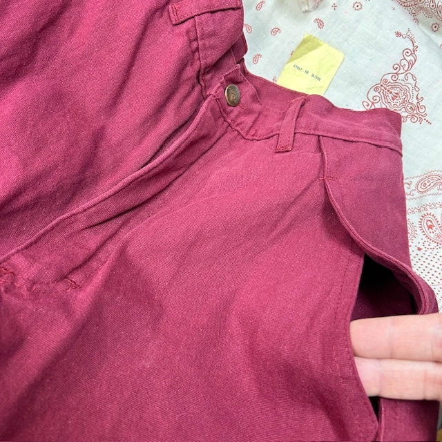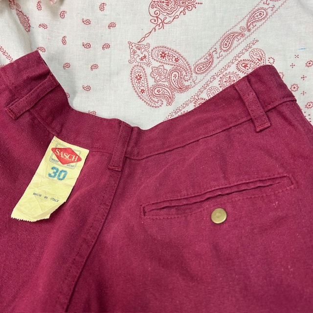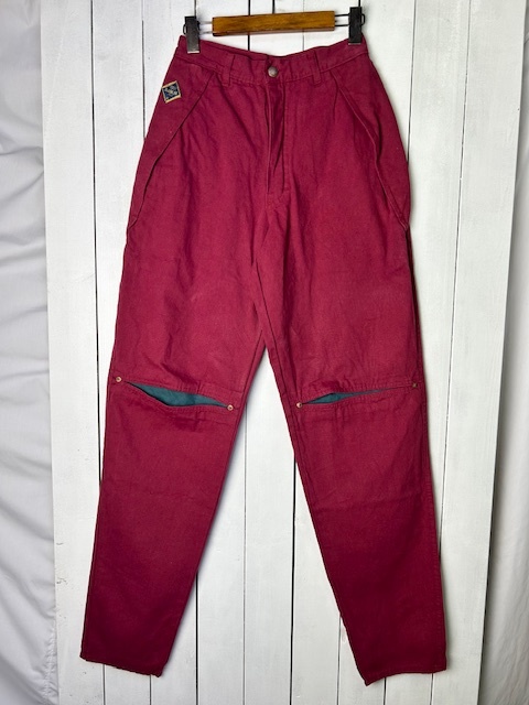●商品説明・・・アメリカ古着になります。70年代~80年代頃のオールド・ヴィンテージの強度のあるコットンダックキャンバス生地のデザインパンツです。3Dの立体的な膝や面白いポケット口のデザインの一着です。アウトドアやワークパンツっぽい雰囲気で、オールド物のローテクな素材の使いで、テック系というか機能的なデザインを取り入れた感じのデザインの一着です。シルエット的には股上やや深めのゆったりワイドな太股周りから裾にかけてテーパードした形で、ジッパーはYKKのピンロック式です。made in Italy (イタリア製)で、色はワインレッドというかやや明るめのエンジのような感じです。サイズはUSAの30で、70s物ですのでやや小しさめで、今のS~やや小さめM程度のサイズ感かと思います。