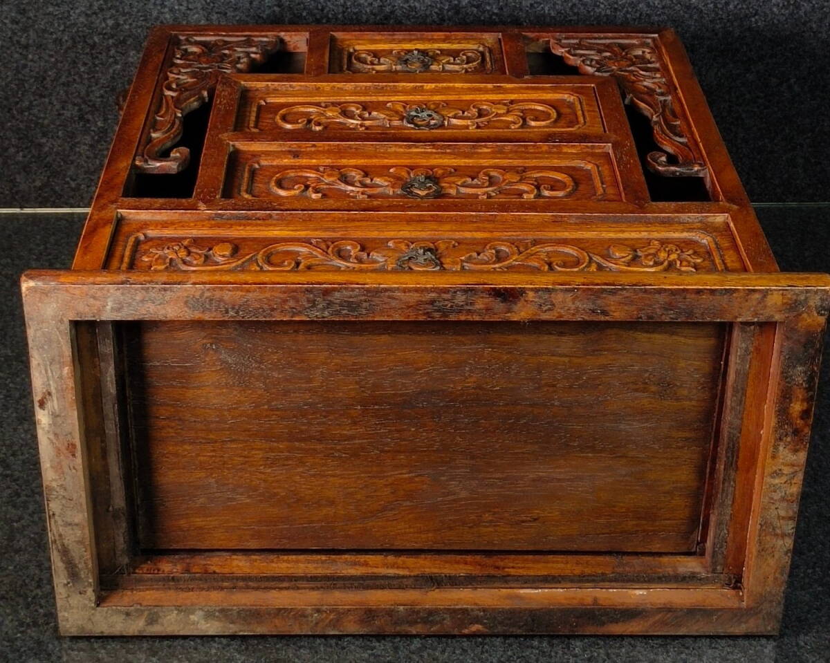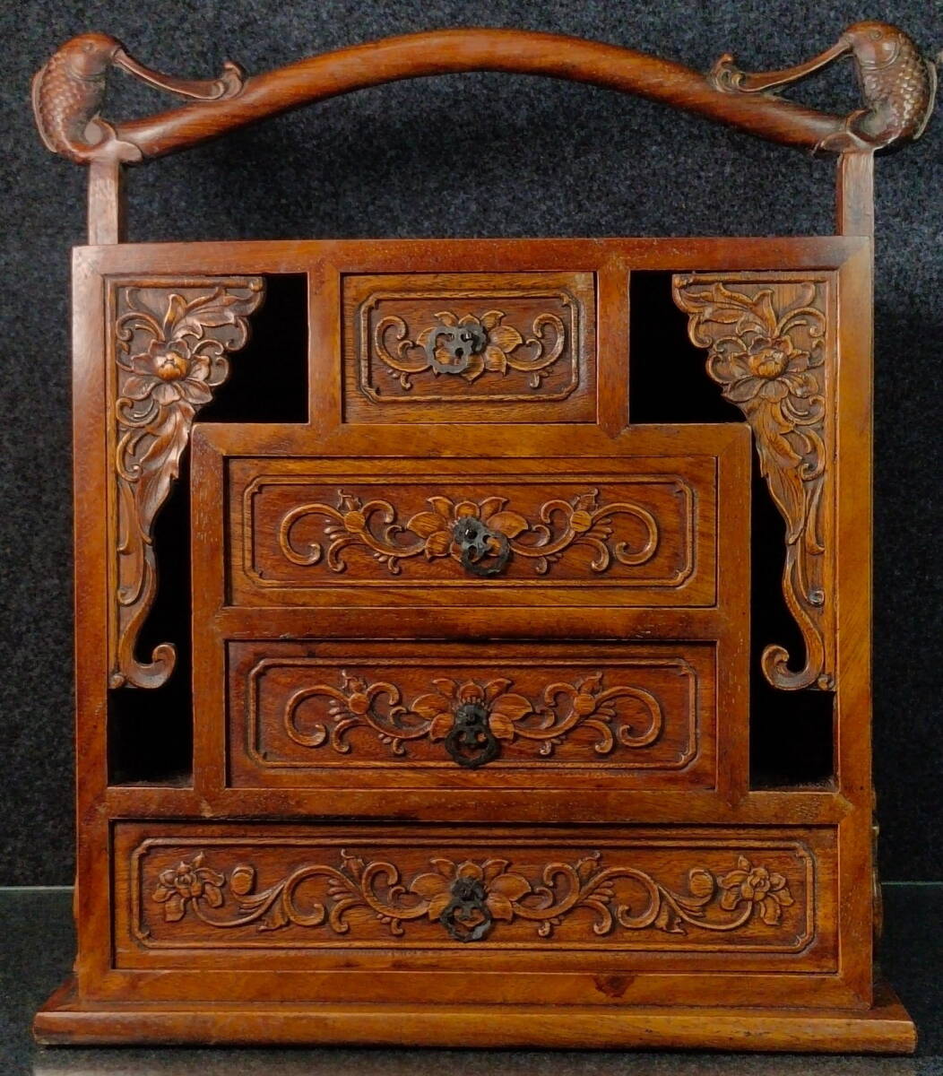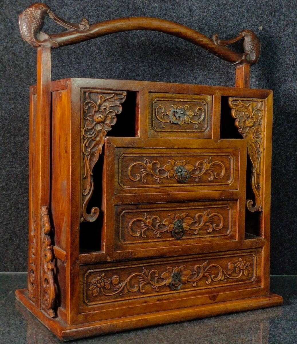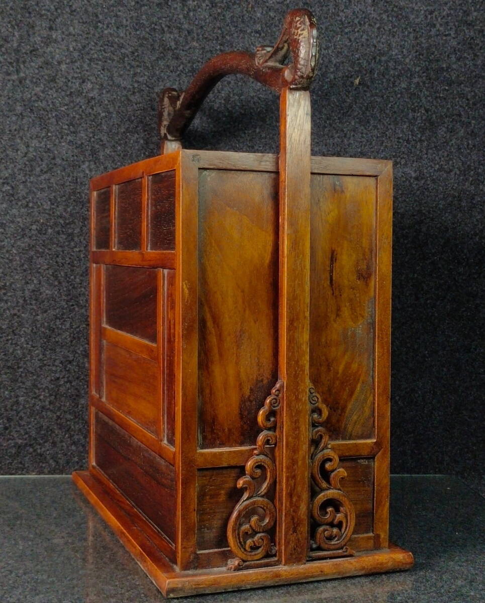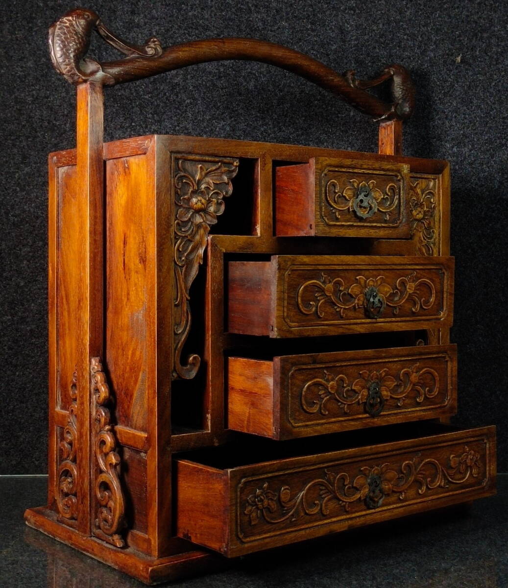 中国 古木彫り 花梨木榮華富貴抽拉手提箱 細密彫 時代物 中国古美術 極細工 古置物 古賞物 木彫り 唐物 ZJM34