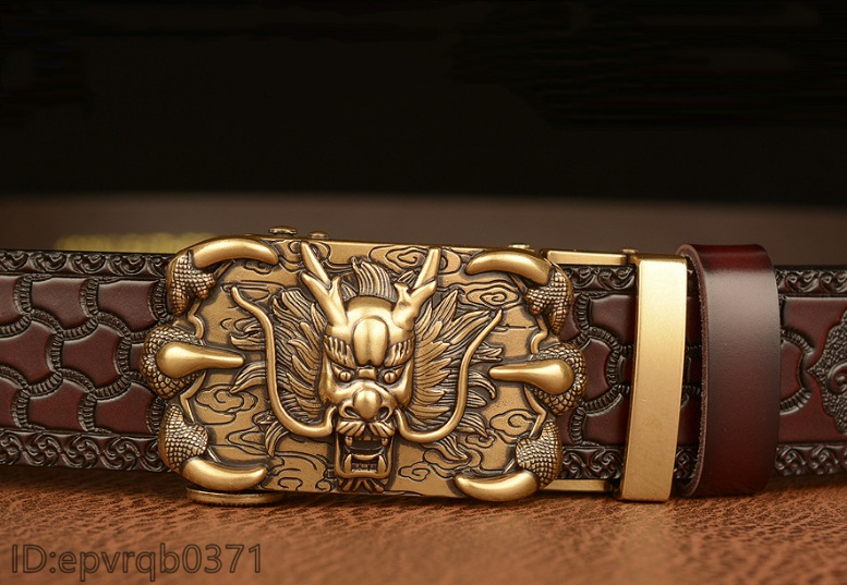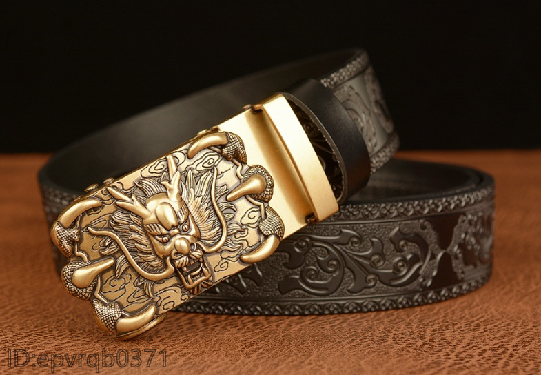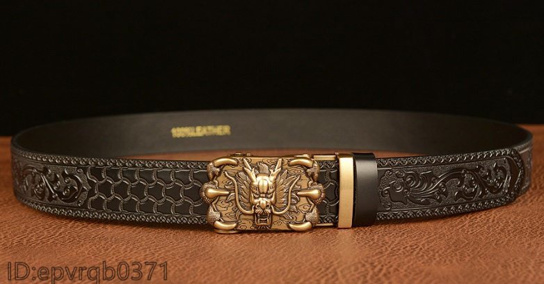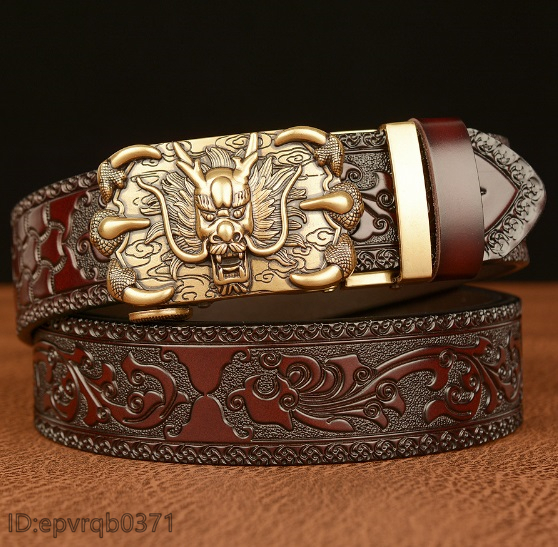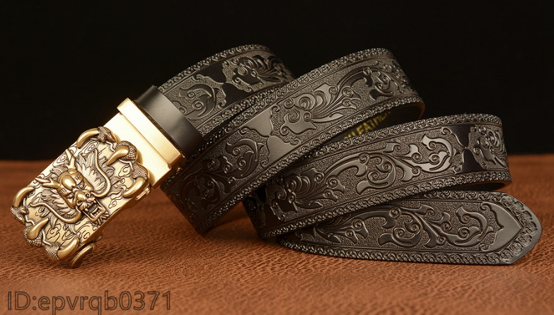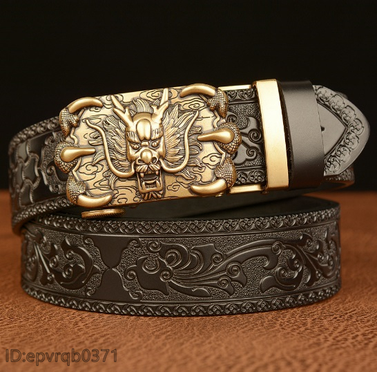 レザーベルト 新品 オートロック式 バックル ドラゴン 本革 メンズ ベル ト 幅3.5センチ 柄物 紳士 長さ調整可能 2色選ぶ/黒