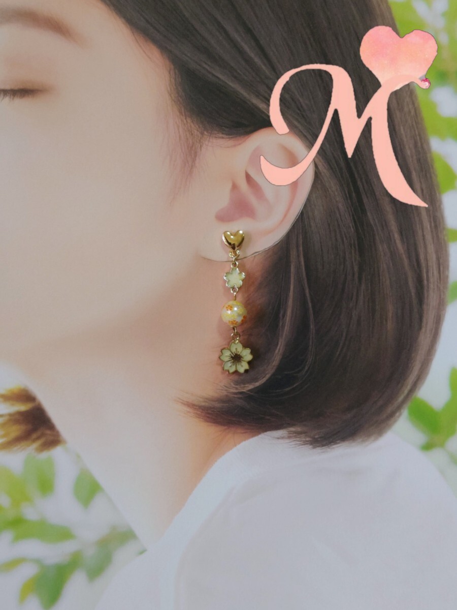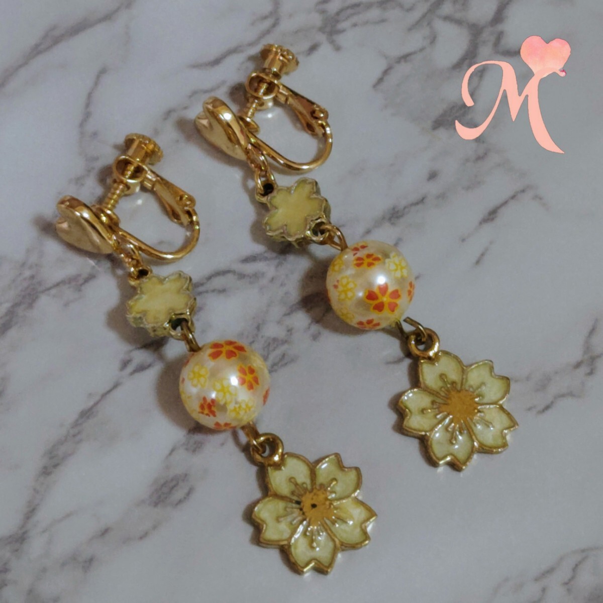 ハンドメイド アレルギー対応 イヤリング or チタン ピアス ハート 桜プリントビーズ 桜チャーム