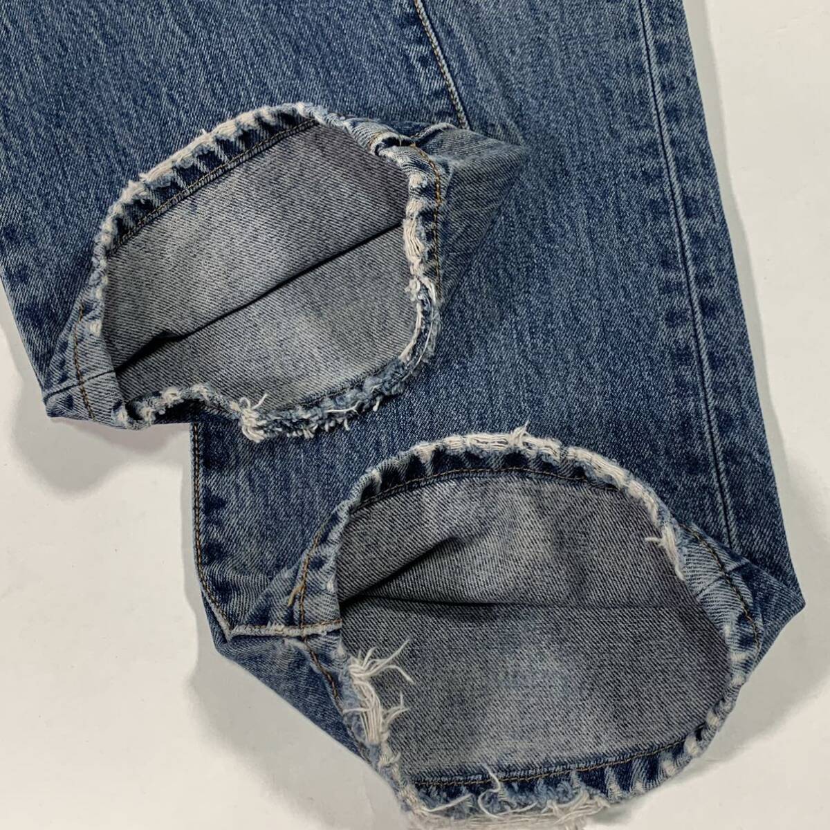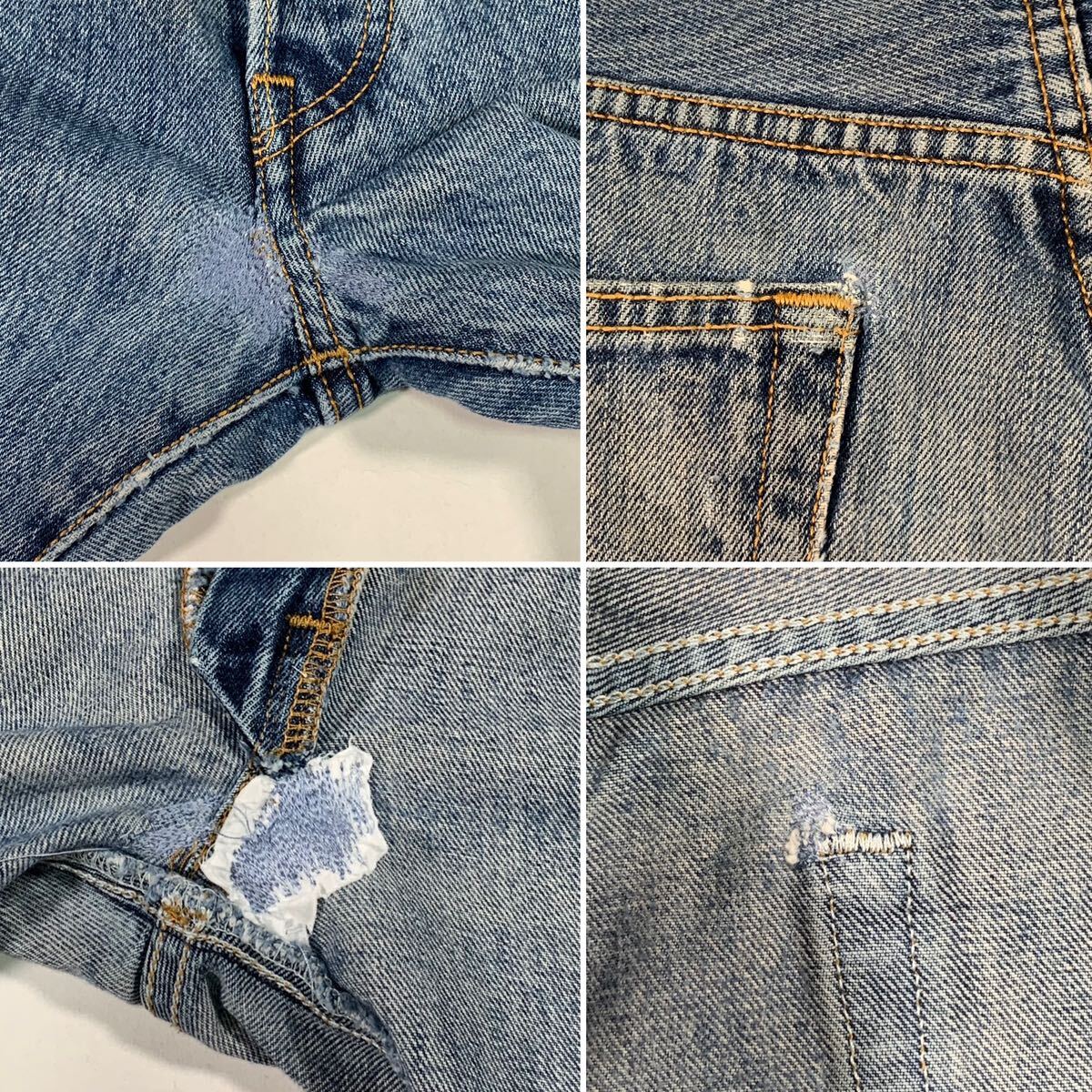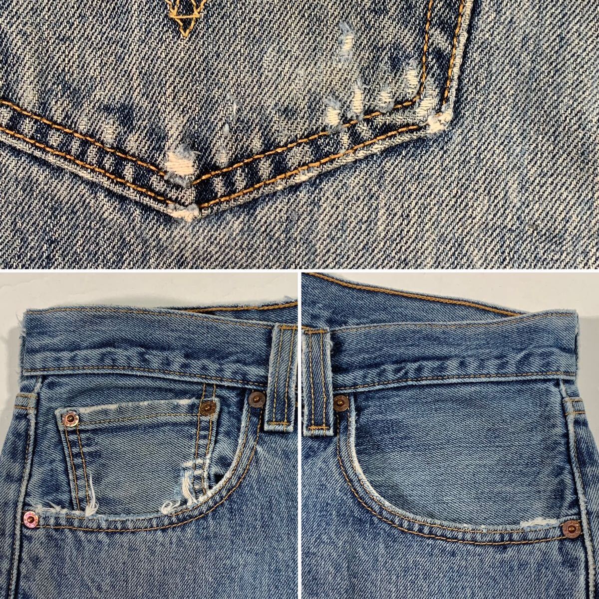 股部分にリペア跡があります。バック・サイドポケットや裾に擦れが見られますが、ビンテージならではの味わいがあると思います。