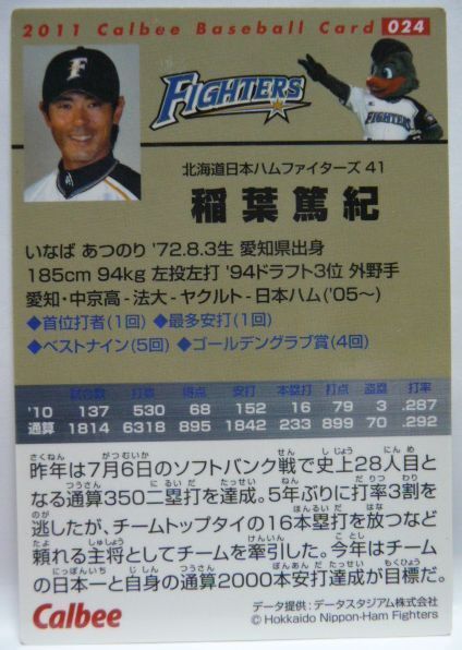 カルビープロ野球カード2011年#024【稲葉 篤紀(北海道 日本ハム ファイターズ)】平成23年チップスおまけ食玩トレーディングカード【中古】