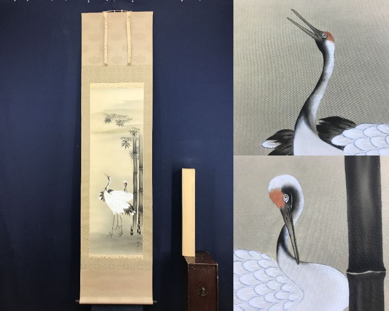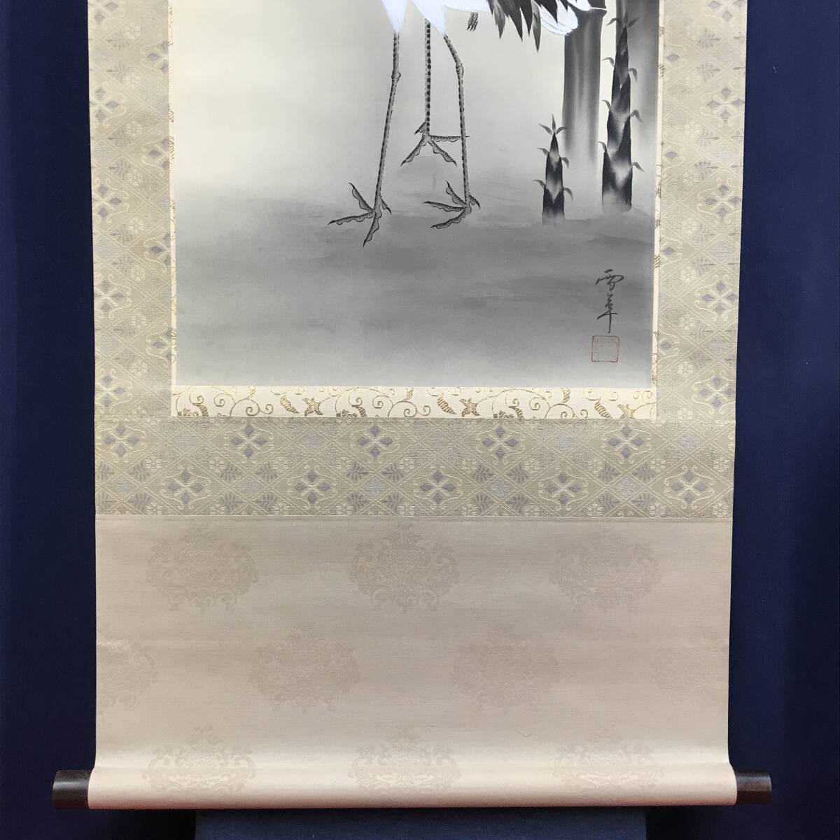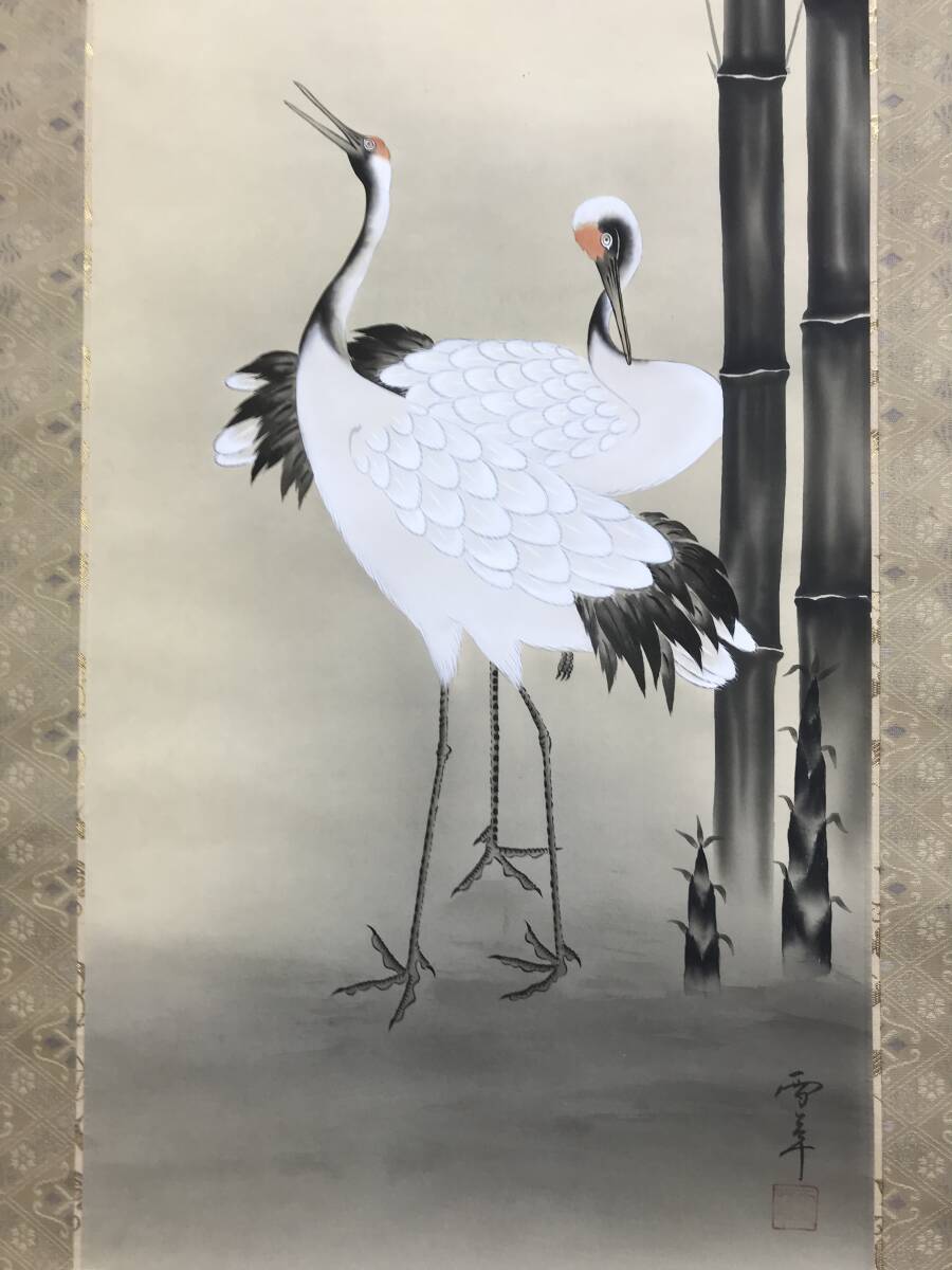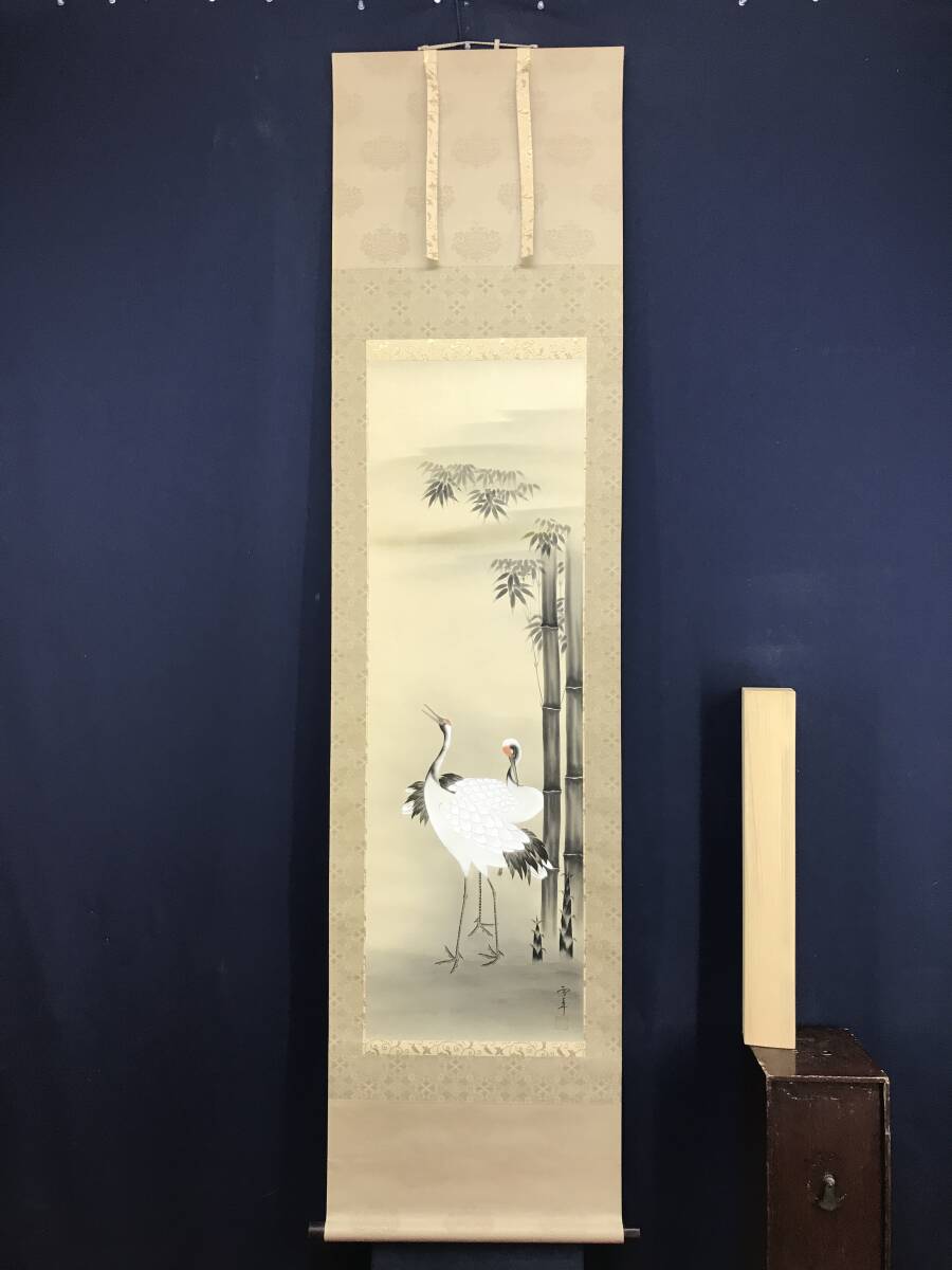 真作/雪草/竹に双鶴図/掛軸☆宝船☆AF-436
