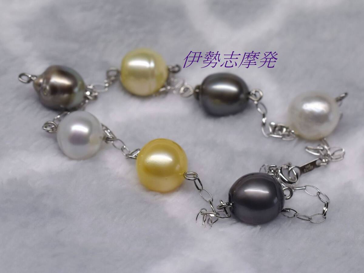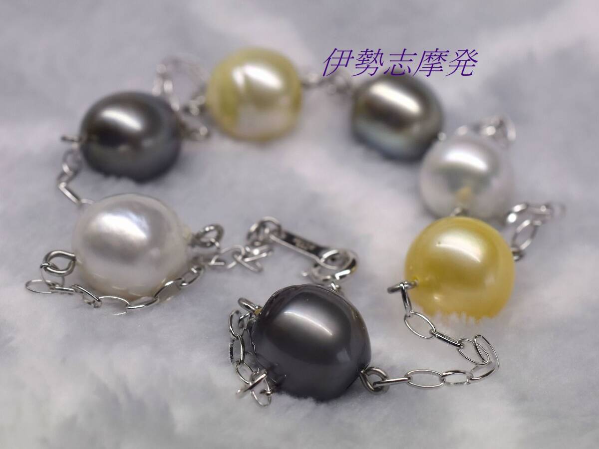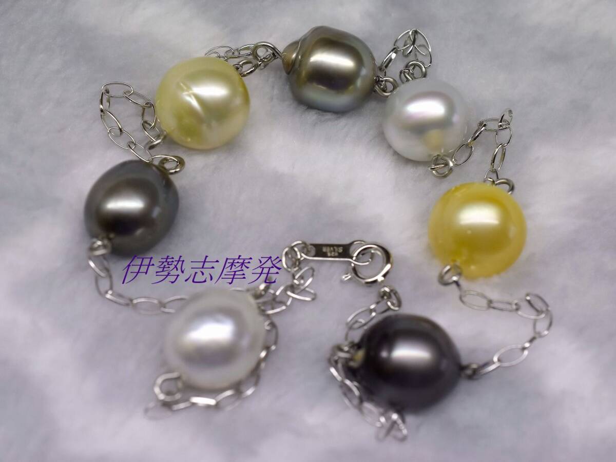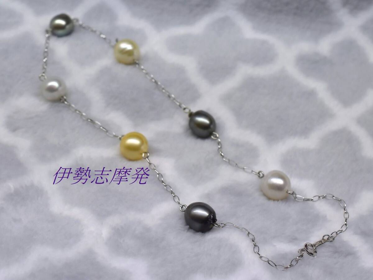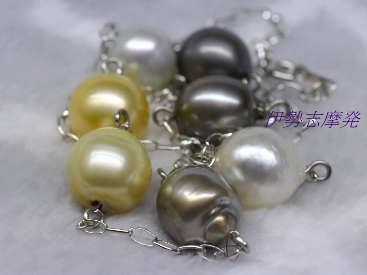 【真珠の種類】 南洋白蝶ゴールド・白蝶・タヒチ黒蝶真珠 【珠サイズ】 12,65㎜から11,76㎜ 【珠の形状】 形の綺麗なバロック珠 【色】 全て天然色ゴールド・シルバーホワイト・ブラック 【巻き】 非常に良い◎ 【照り】 非常に良い◎ 【キズ】 少ない・筋状の瑕 【エクボ】 ほとんど無し 【金具の材質】 ロジウムシルバー 【デザインの大きさなど】 全体45cm ◆ 豪華!強烈な巻きと照り&美しいお色の大粒ナチュラル珠!形の綺麗なセミラウンド珠とセミバロックの魅力が満載の、特大珠でお作りしましたとても美しいネックレスです。 ◆ つるっとした美珠で艶やか、とても細かなきめで姿までも映し込む強いミラータッチ!セミラウンドとセミバロックと形の綺麗な大珠で組み上げました。 大人の女性なら一本は持ちたい憧れの南洋真珠と黒蝶真珠で組み上げた、高貴な輝きと存在感は大人の女性の装いをワンランクもツーランクも上げてくれます。 品のある輝きと抜群の豪華さ!存在感と、魅力は計り知れません。ロジウムSV製のチェーン仕上げで全長45㎝です。 このチャンスに是非どうぞ。素晴らしいお色の大珠ネックレスは豪華で華や火♪結婚式やご入学にご卒業、パーティと色んなシーンで大活躍してくれます。 | ||||||||