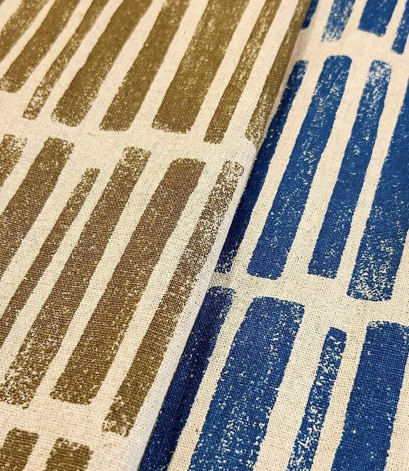 素材はコットン80%、リネン20%のキャンバス素材。ナチュラルカラー、素材そのものの地色の上に単色プリントされた幾何学的な模様。