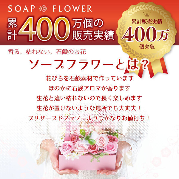 香る、かれない、せっけんのお花 生花やプリザーブドフラワーに代わる「第3のフラワーギフト」です。 ほのかな香りとボリューム感たっぷりで華やか、石けんで出来ているため枯れることなくお手入れ不要です。 ・大人気のカラフルブーケ。 華やかなラッピングで贈り物に喜ばれること間違いなし! ・ドット柄クリアバック入り。 ★シャボンフラワーってどんなもの? ・花びらを石鹸素材でつくっています。 ・ほのかに石鹸アロマが香ります。 ・生花と違い枯れないので長く楽しめます。 ・生花が置けないような場所でも大丈夫! ・プリザーブドフラワーより、かなりお値打ち! ※実際の商品と画像の色合い・パーツなどの配置、イメージ等、異なることがございます。 ※予告なく箱の色、ラッピングの仕様が変わることがあります。 個装サイズ:185X290X185mm 個装重量:約310g 内容量:1個 製造国:中国 【発売元:株式会社ポピー名古屋】 【シャボンフラワー】 観賞用 【サイズ】 全長約26cm、花幅約30cm 【注意事項】 ・手洗いできません。 ・洗顔等できません。 ・お風呂や洗濯で使用できません。 ・石鹸で出来ていますが、洗濯・洗顔を目的とした物ではない為、洗濯・洗顔に使用しないで下さい。 ・食べられません。 ・香りに多少の強弱がある場合があります。 ・素材の性質上ひび割れがある場合があります。 ・太陽光などに長時間あてると色が変色する場合があります。 ・保存の際は高温多湿、特に水のある場所にご注意ください。 ・だんだんと変色(若干の色抜け)はしますが、負荷を掛けない限り花びらが崩れたりする事は稀です。 注意事項 予告なく成分・パッケージが変更になることがございます。 予めご了承ください。 *予告なく成分・パッケージが変更になることがございます。予めご了承ください *ダンボールを使用して発送する場合には、入数以下の個数の場合、 中古ダンボールを使用する場合があり、ご注文の商品とは異なるダンボールになる場合があります。 あらかじめ、ご了承ください。 |