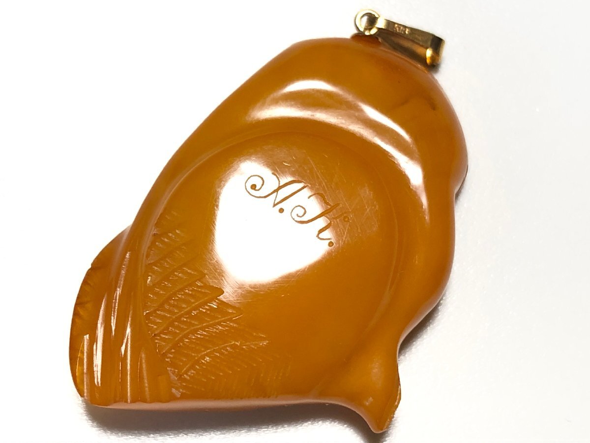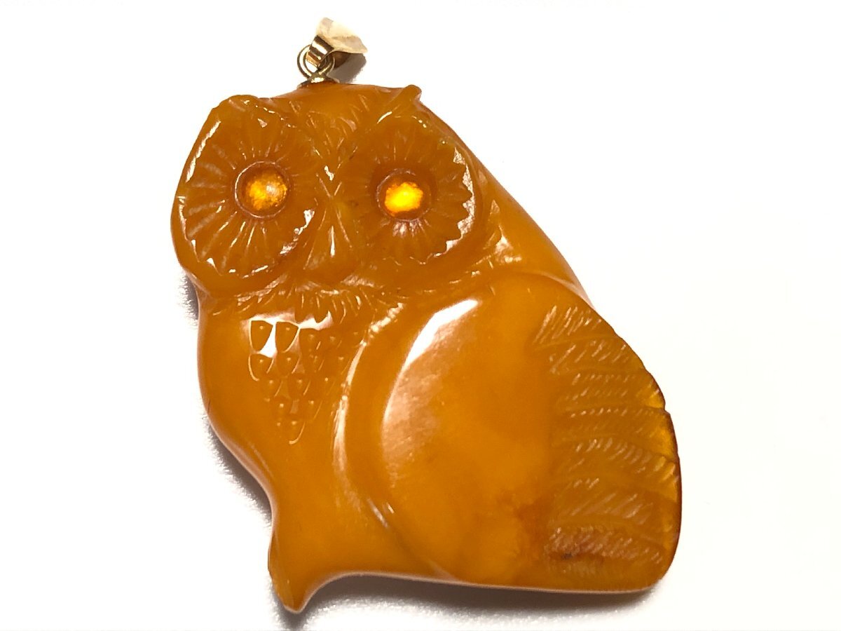 アンティークのロイヤルアンバー、本琥珀、K18を使用した、梟デザインのペンダントトップです。作者、A.K.の刻印、金具部分にはK18の刻印があります。美品です。