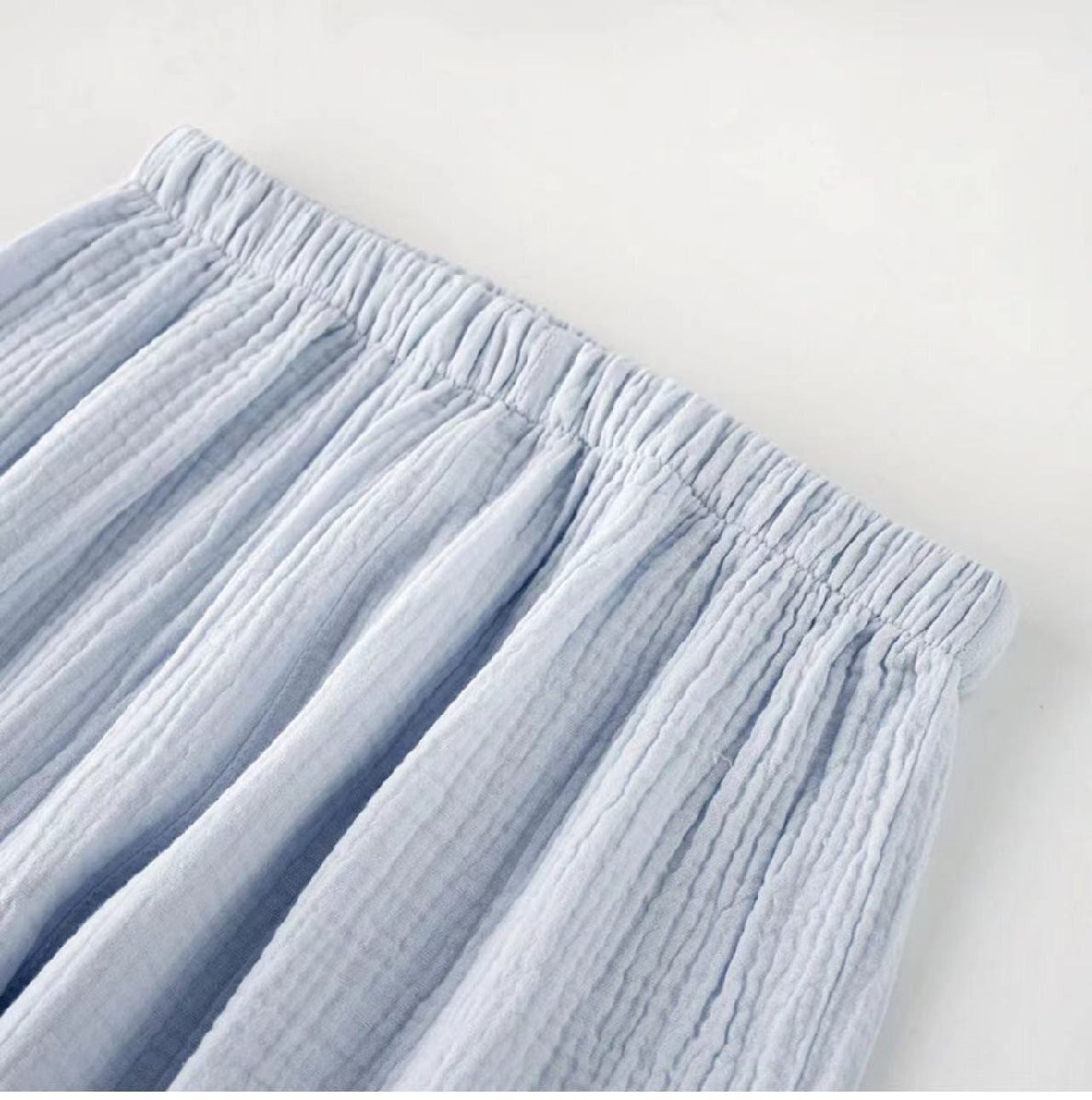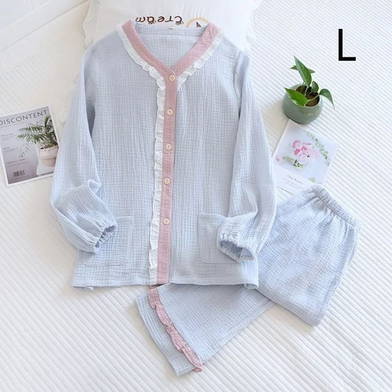 ルームウェア パジャマ レディース 二重ガーゼ 綿100% 前開き 長袖 半袖 長ズボン 春 夏 秋 可愛い ブルーL