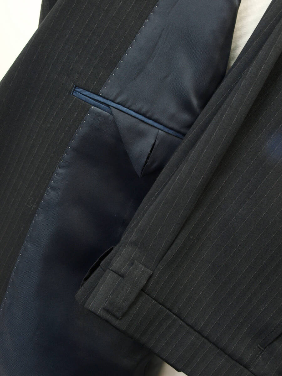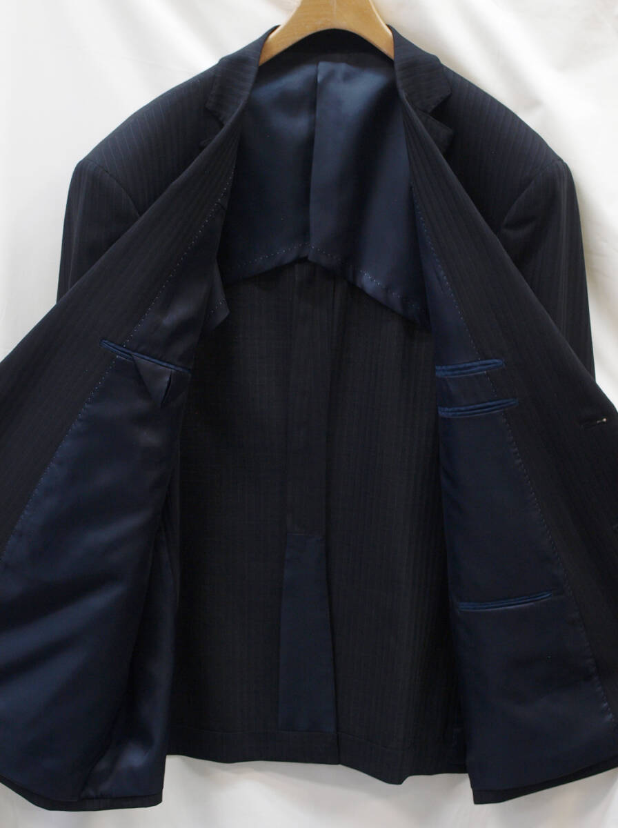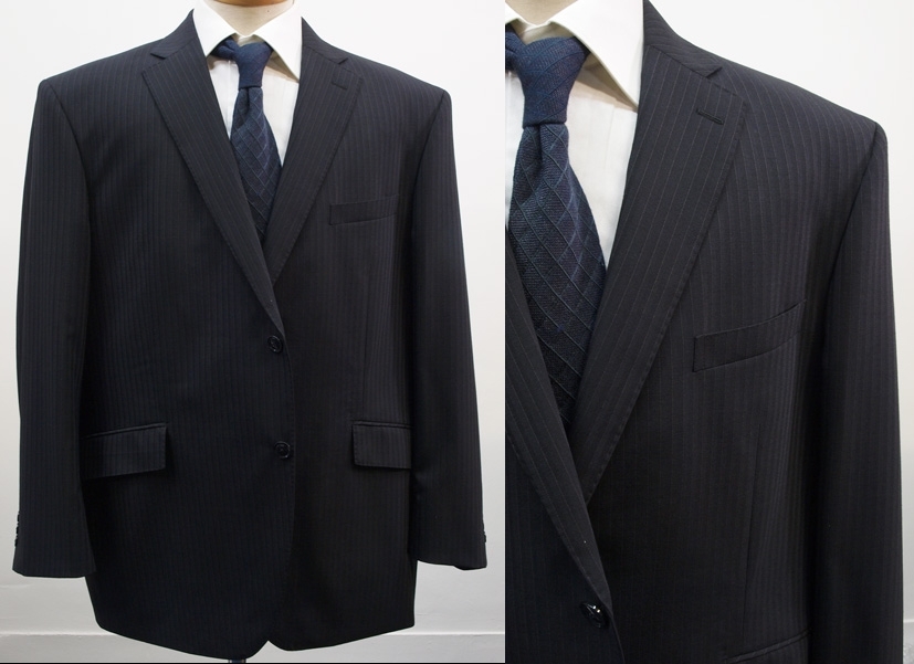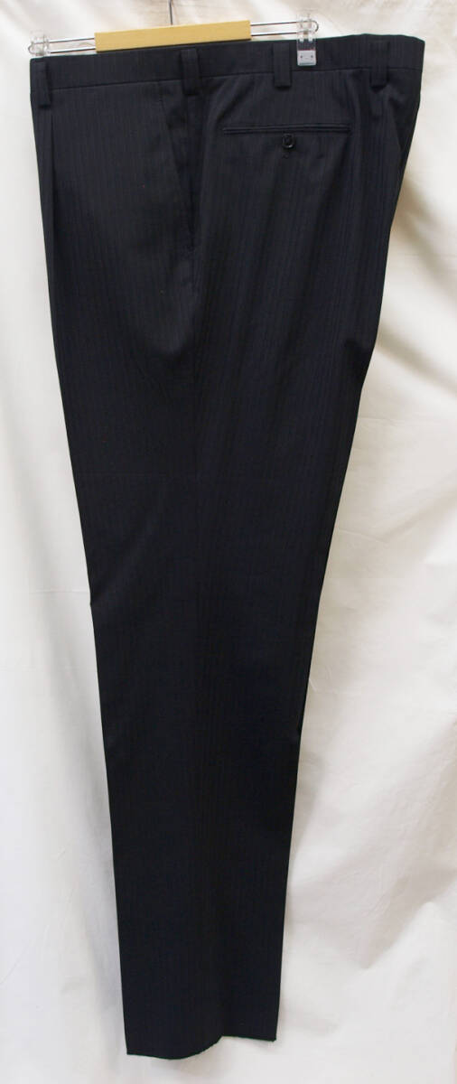 【サイズ】 3M (K5号相当) 目安の体型 身長165cm~175cm、ウエストサイズ105cm **** ご着用には問題ございませんが、1着のみのサンプル商品で素材、サイズ、洗濯表示等がついておりませんことをご了承下さい。 **** 【ジャケット実寸】 肩幅52.5cm 着丈74.5cm 袖丈61.5cm 脇下部分65cm 身幅62cm 【パンツ実寸】 ウエスト(胴回り実寸) 106cm わたり幅39.5cm(股下10cmの部位で36cm) 裾幅22.7cm 脇股上28cm 前股上32cm 股下90cm(裾上げしていない状態/新品) 【素材】 表地:ウール50% ポリエステル50% 裏地:胴裏/ポリエステル100% 袖裏/ポリエステル100% 春~夏~秋にかけて春夏メインのシーズン対応商品 【色】 黒色 【柄】 ストライプ柄 真夏向け素材より厚みのあるやや薄手、春夏用紳士スーツ向けウールブレンド素材を使用 【デザイン】 ゆとりのある着心地のシングル2つボタンスーツ、レギュラーフィットビジネススーツ新品、裾上げしていない状態です。 ・ジャケットはシングル2つボタンでベーシックレギュラーモデル ・パンツはゆとりをもたせたシルエット、レギュラーフィット、ワンタックパンツ 【縫製仕様】 ・ジャケット:シングル2つボタン、ノッチドラペル、襟縁等AMFステッチ入り、袖口ボタン3つ、センターベント、内ポケット4つ(小ポケット2つ含む)、背抜き(春夏用) ・パンツ:1タック、膝裏当て付き、脇ポケット斜め付け、後ろポケット両玉縁で左のみボタン付き、フロントはファスナーでホック仕様/うちかけボタンあり きちんとしたビジネススーツの縫製仕様で仕上がっております。