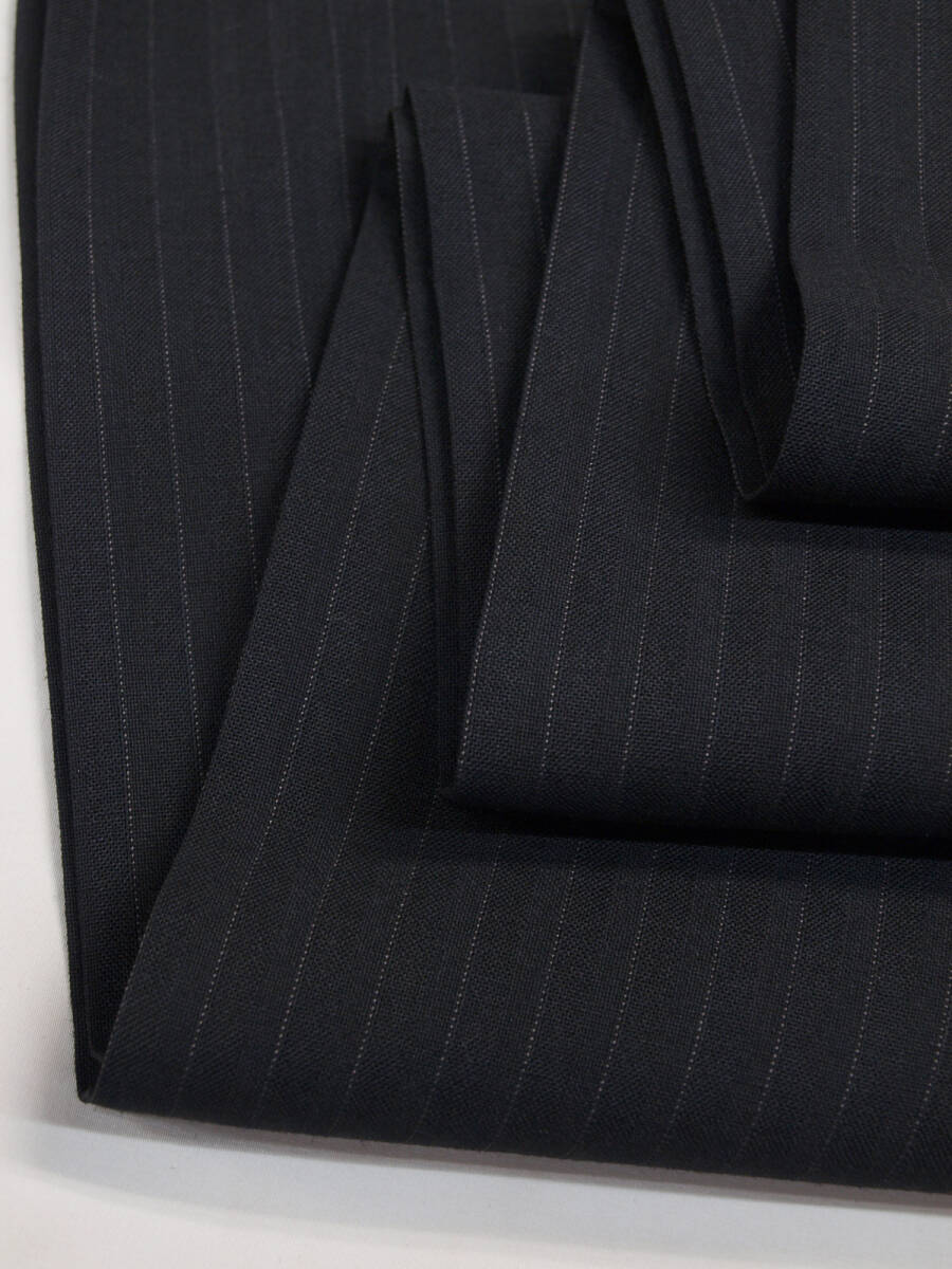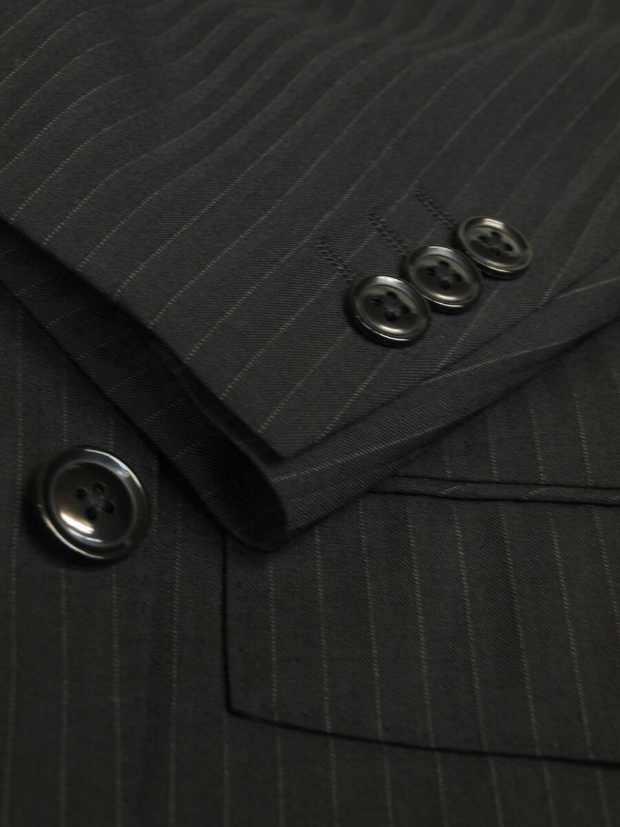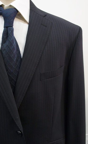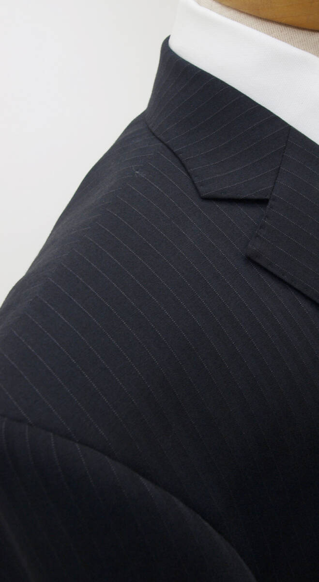 【サイズ】 3M (K5号相当) 目安の体型 身長165cm~175cm、ウエストサイズ105cm **** ご着用には問題ございませんが、1着のみのサンプル商品で素材、サイズ、洗濯表示等がついておりませんことをご了承下さい。 **** 【ジャケット実寸】 肩幅52.5cm 着丈74.5cm 袖丈61.5cm 脇下部分65cm 身幅62cm 【パンツ実寸】 ウエスト(胴回り実寸) 106cm わたり幅39.5cm(股下10cmの部位で36cm) 裾幅22.7cm 脇股上28cm 前股上32cm 股下90cm(裾上げしていない状態/新品) 【素材】 表地:ウール50% ポリエステル50% 裏地:胴裏/ポリエステル100% 袖裏/ポリエステル100% 春~夏~秋にかけて春夏メインのシーズン対応商品 【色】 黒色 【柄】 ストライプ柄 真夏向け素材より厚みのあるやや薄手、春夏用紳士スーツ向けウールブレンド素材を使用 【デザイン】 ゆとりのある着心地のシングル2つボタンスーツ、レギュラーフィットビジネススーツ新品、裾上げしていない状態です。 ・ジャケットはシングル2つボタンでベーシックレギュラーモデル ・パンツはゆとりをもたせたシルエット、レギュラーフィット、ワンタックパンツ 【縫製仕様】 ・ジャケット:シングル2つボタン、ノッチドラペル、襟縁等AMFステッチ入り、袖口ボタン3つ、センターベント、内ポケット4つ(小ポケット2つ含む)、背抜き(春夏用) ・パンツ:1タック、膝裏当て付き、脇ポケット斜め付け、後ろポケット両玉縁で左のみボタン付き、フロントはファスナーでホック仕様/うちかけボタンあり きちんとしたビジネススーツの縫製仕様で仕上がっております。
