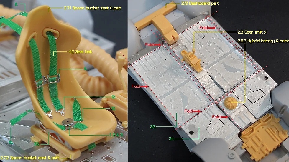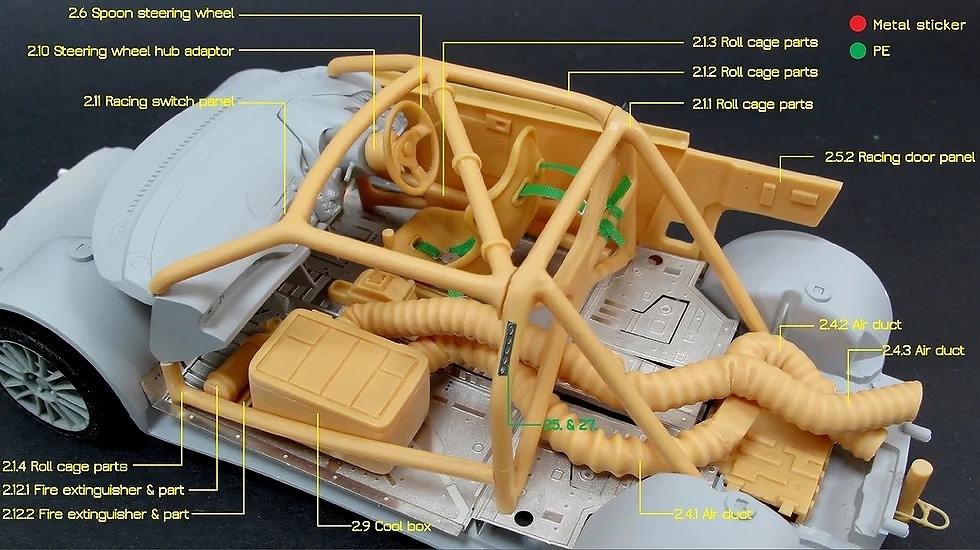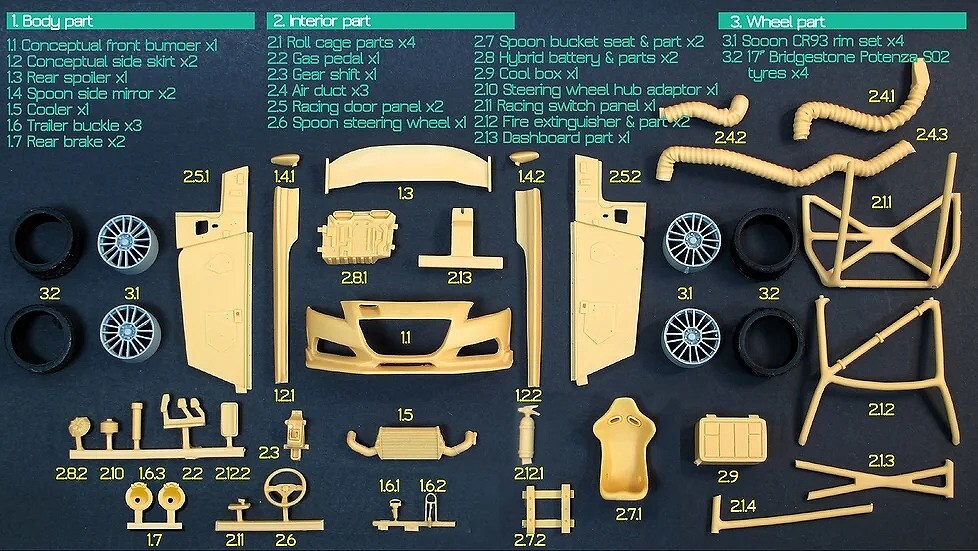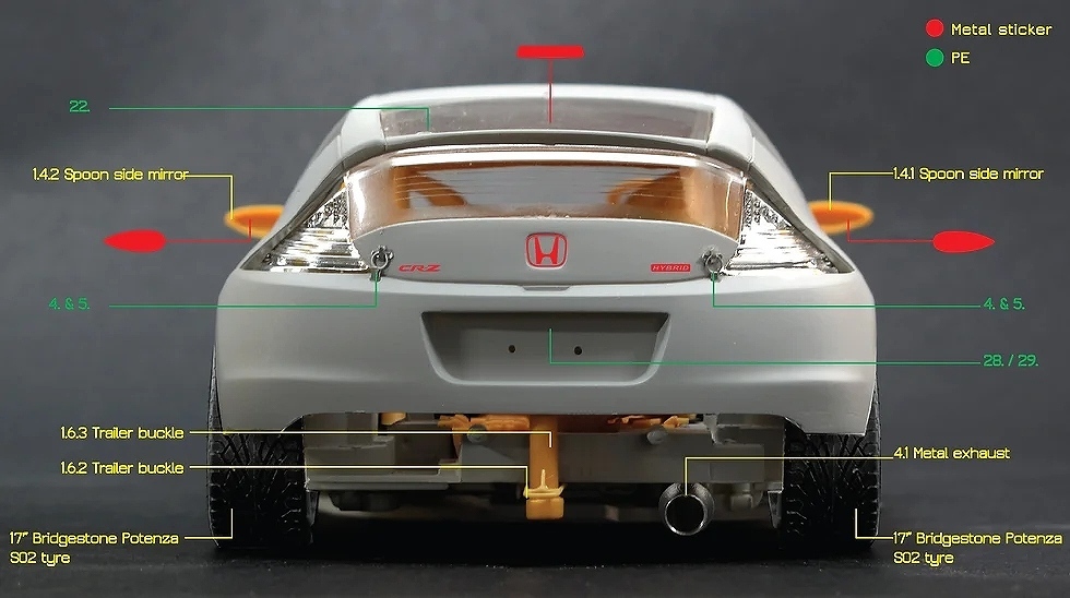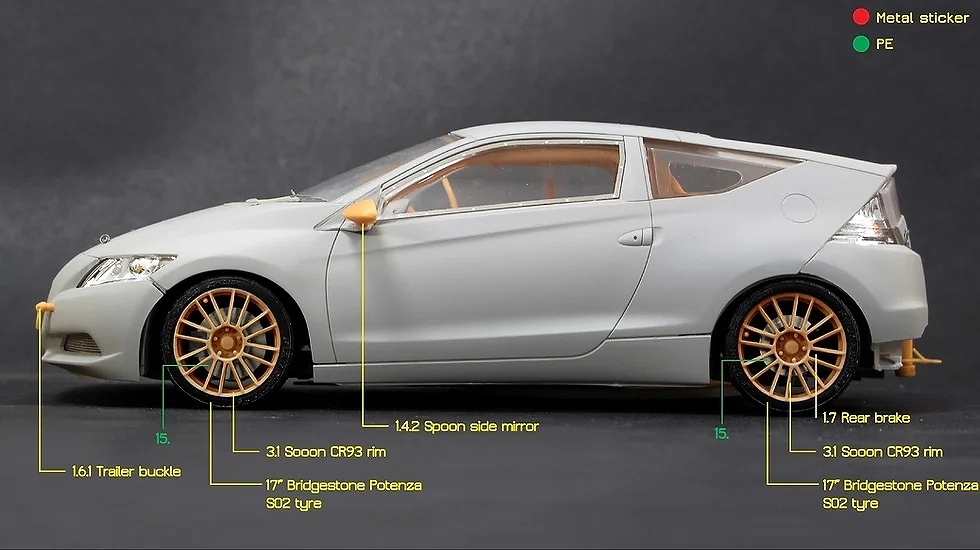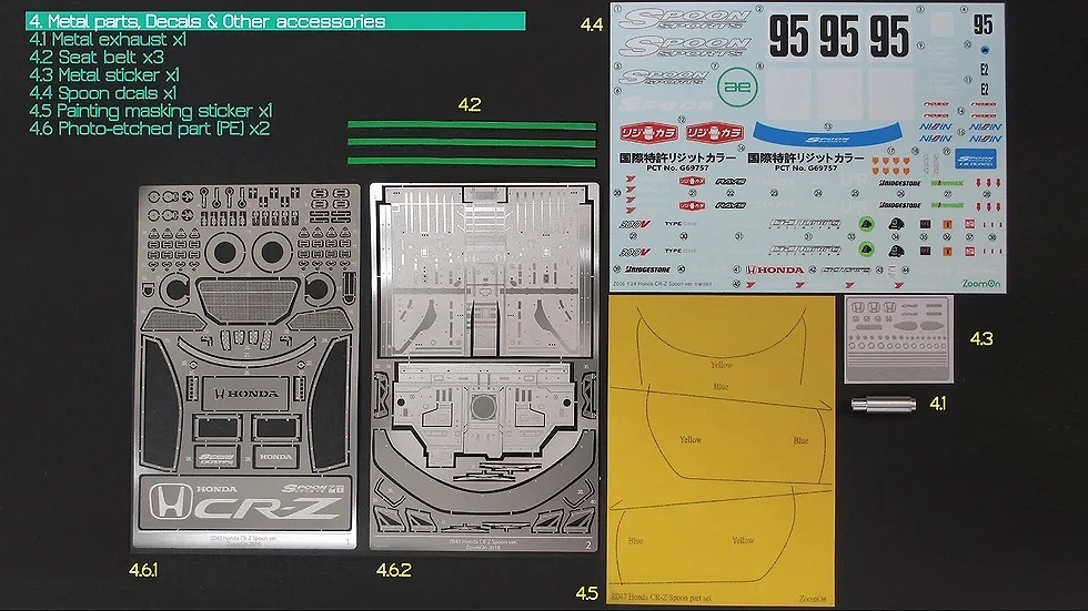 ZoomOn 1/24 Honda CR-Z Spoon part set - Designed for Fujimi 1/24 kit. -- 1.1 Conceptual front bumoer -- 1.2 Conceptual side skirt -- 1.3 Rear spoiler -- 1.4 Spoon side mirror -- 1.5 Cooler -- 1.6 Trailer buckle -- 1.7 Rear brake -- 2.1 Roll cage parts -- Gas pedal -- 2.3 Gear shift -- 2.4 Air duct -- 2.5 Racing door panel -- 2.6 Spoon steering wheel -- 2.7 Spoon bucket seat & part -- 2.8 Hybrid battery & parts -- 2.9 Cool box -- 2.10 Steering wheel hub adaptor -- 2.11 Racing switch panel -- 2.12 Fire extinguisher & part -- 2.13 Dashboard part -- 3.1 Sooon CR93 rim set -- 3.2 17'' Bridgestone Potenza S02 tyres set -- 4.1 Metal exhaust -- 4.2 Seat belt -- 4.3 Metal sticker -- 4.4 Spoon dcals -- 4.5 Painting masking sticker -- 4.6 Photo-etched part (PE)