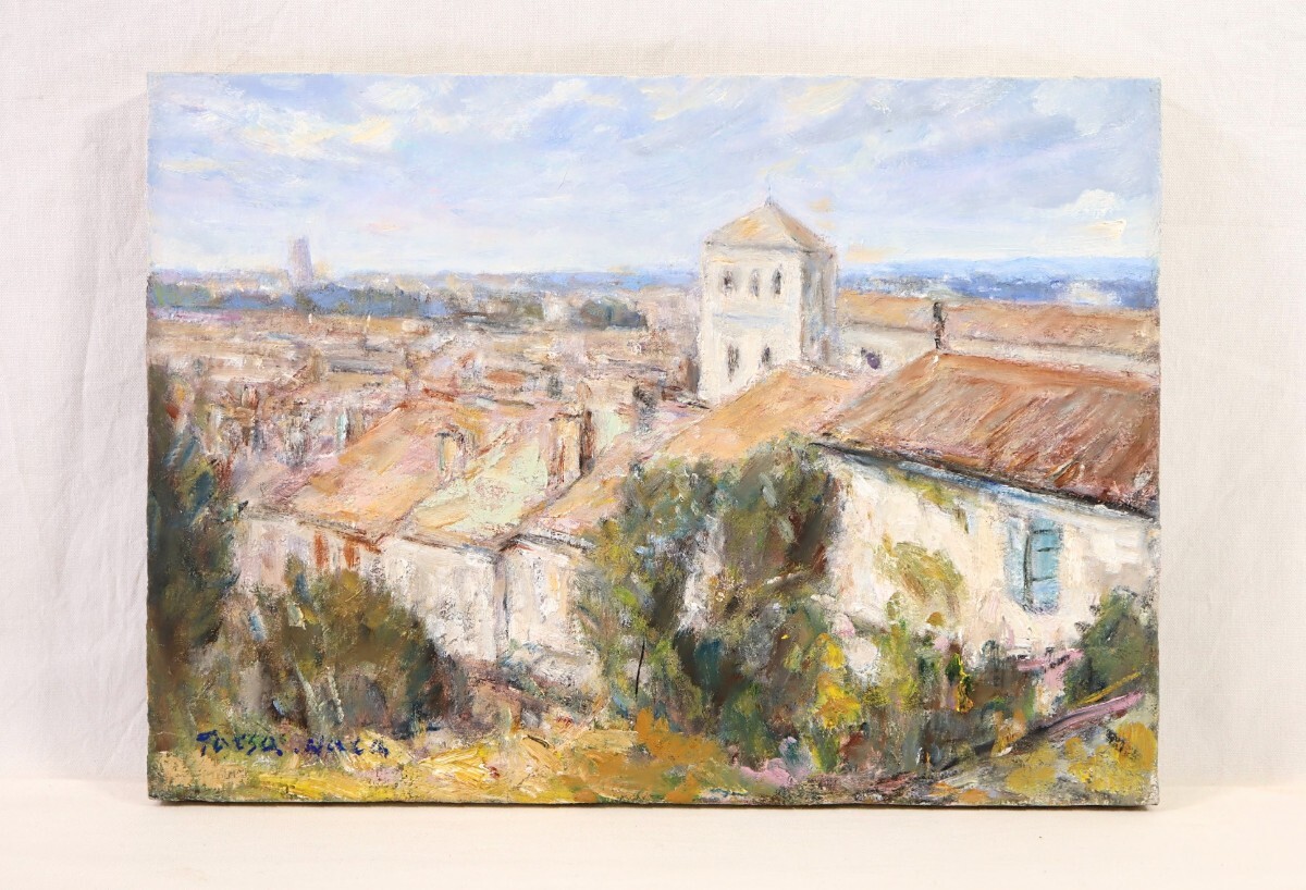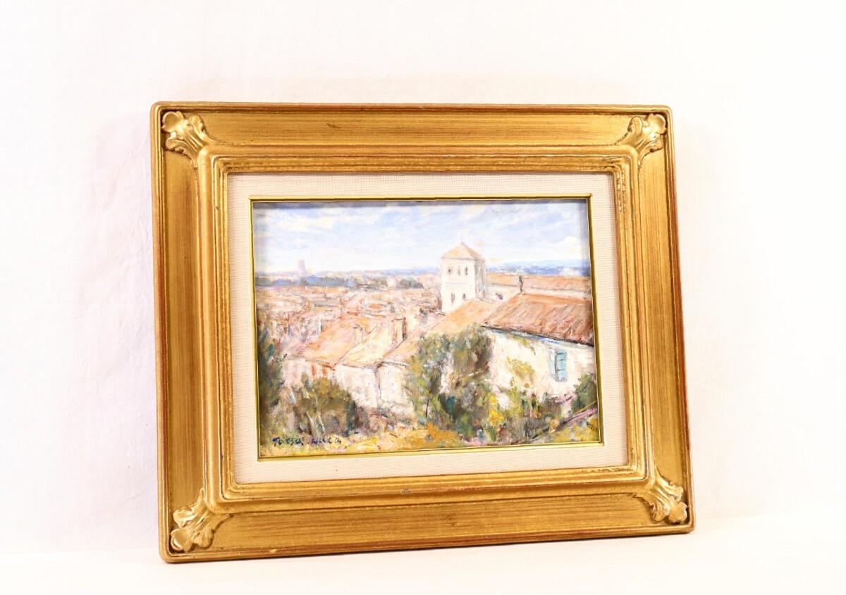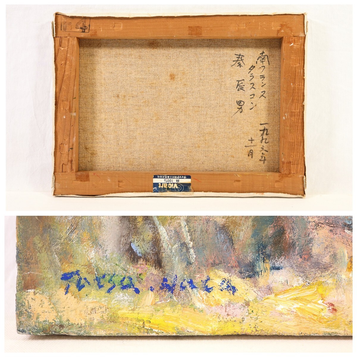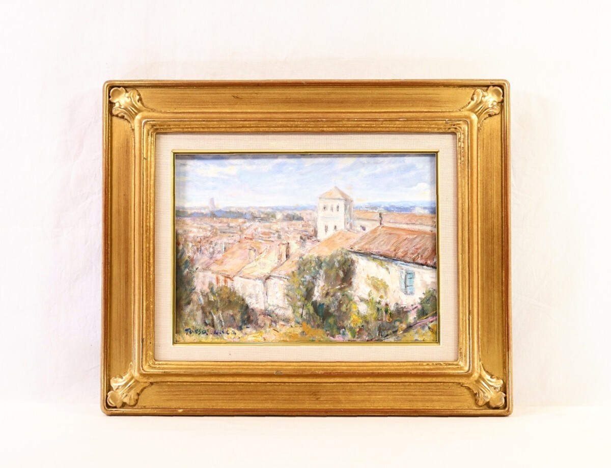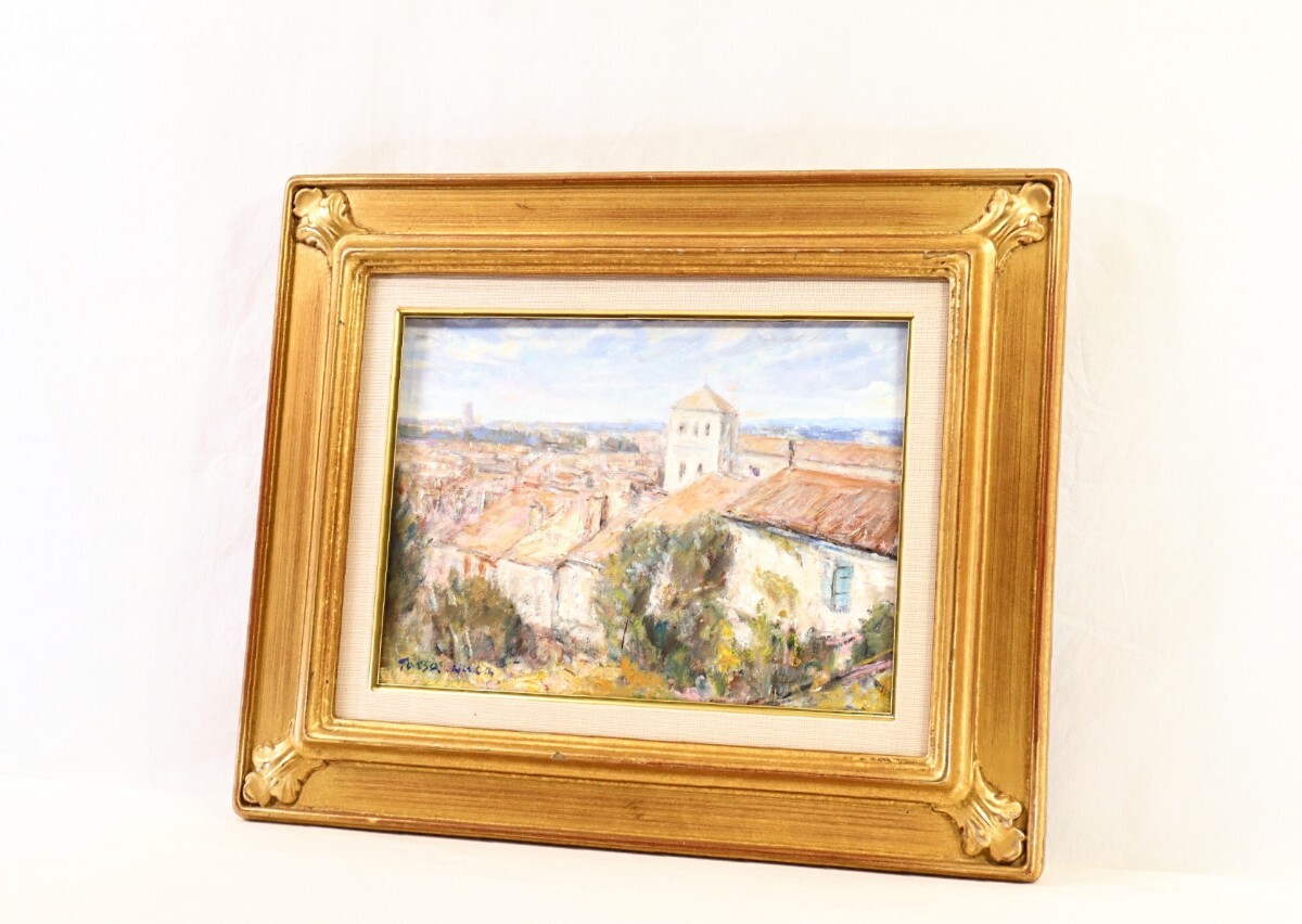 真作 秦辰男 1996年油彩「南フランス タラスコン」画寸F4 島根県出身 日本美術会会員 赤松麟作 須田国太郎に師事 高台から望む町並み 9133