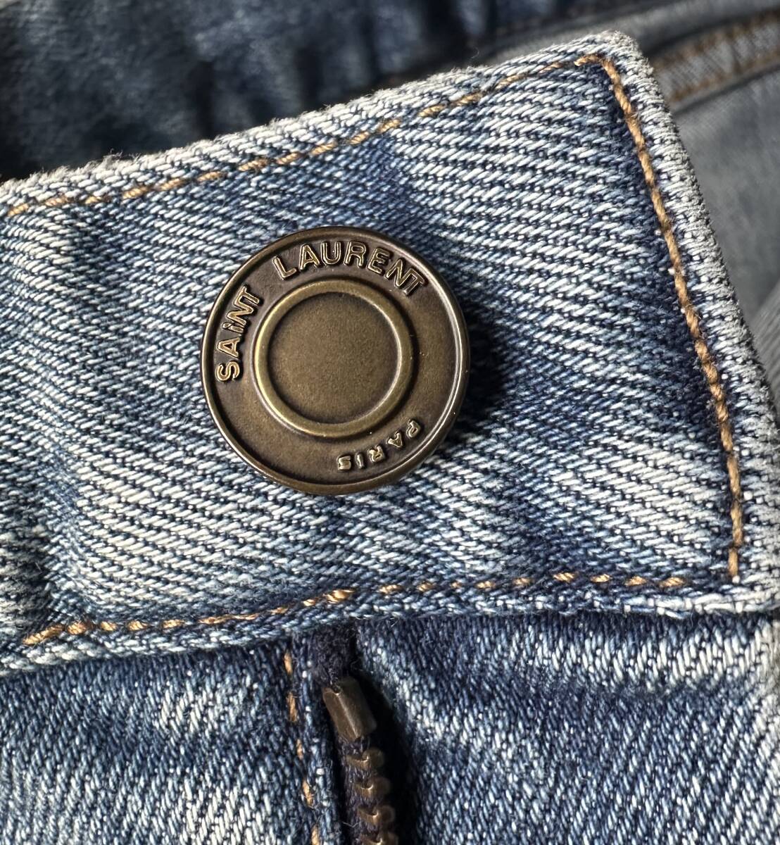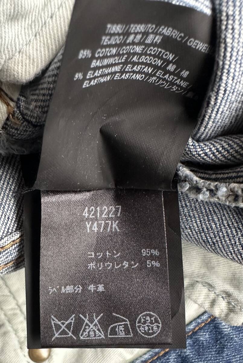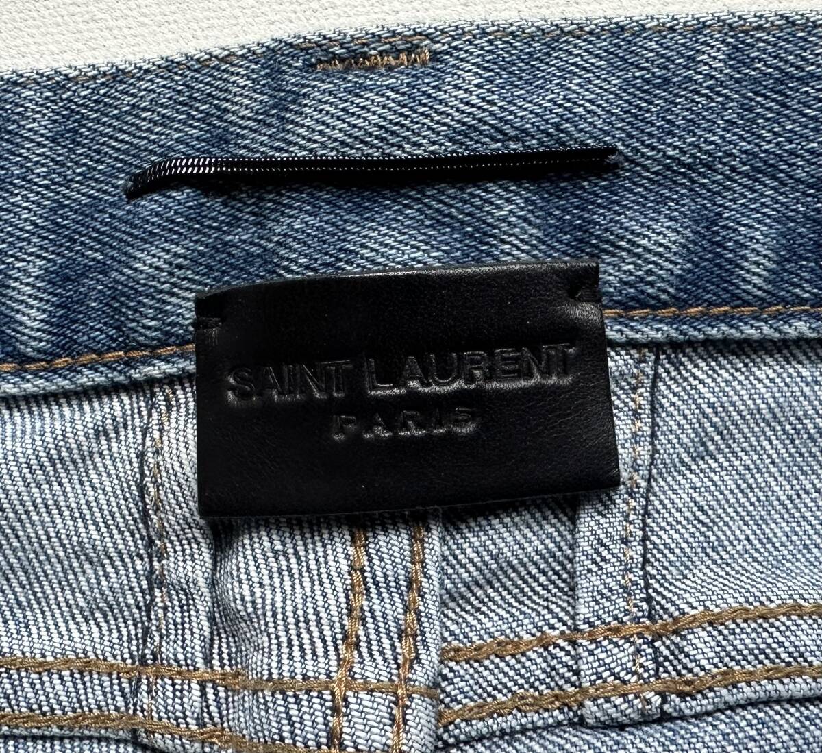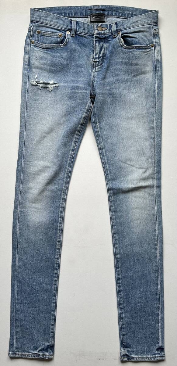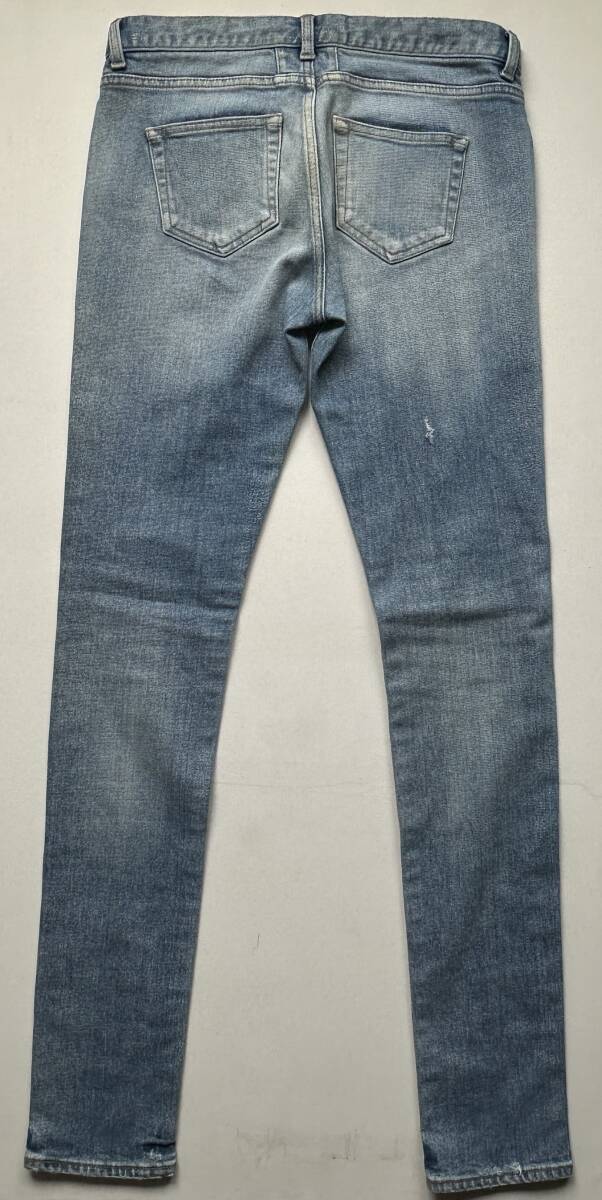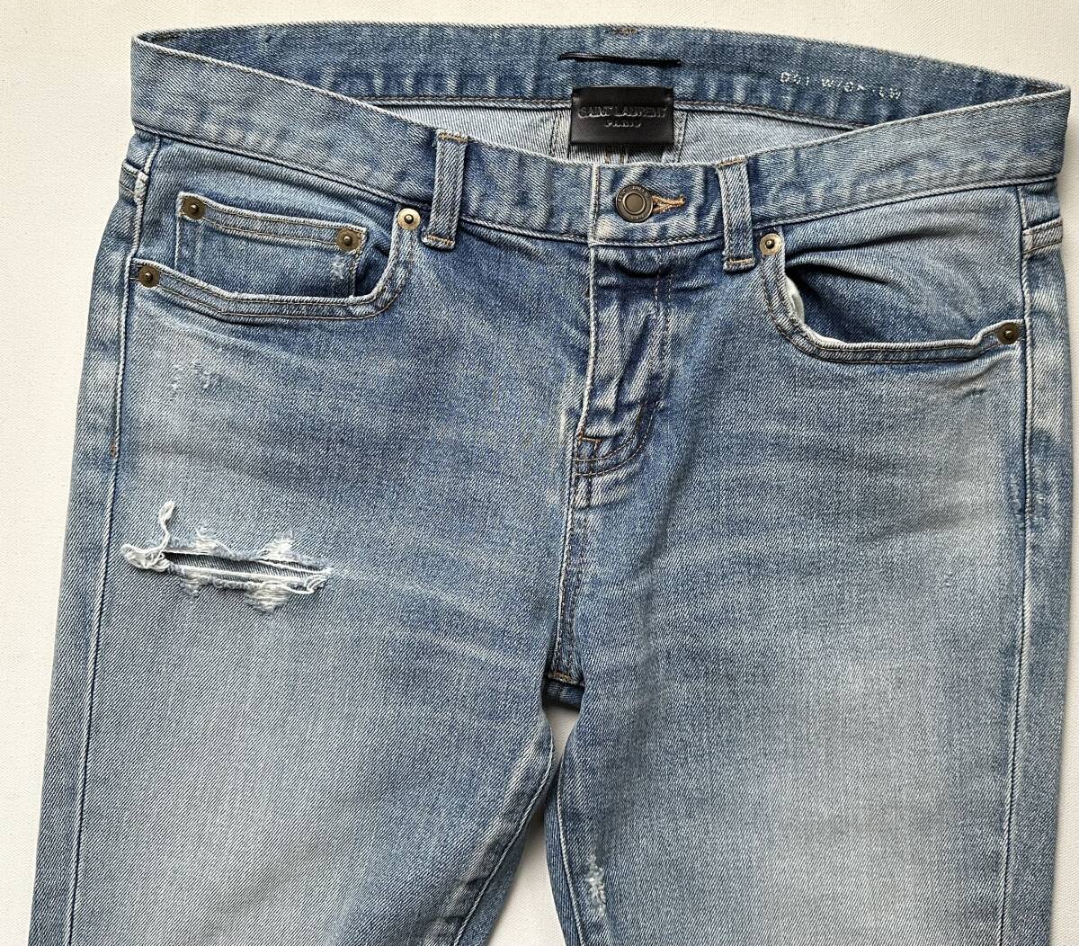 SAINT LAURENT PARIS サンローランパリ16AW ダメージブルージンズ28 美品です。サイズ:28 ウェスト80cm。股上( 前22cm・後28cm )股下82cm。ヒップ44cm。ワタリ幅23cm。裾幅14cm。マテリアル:コットン95%+ポリウレタン5%。日本製。ケリングジャパン日本語品質表示タグ付き。元々洗い加工や一部にダメージ加工が施されています。ロゴタグのチェーンの色はブラックでエディ最後のサンローランコレクションです。状態は10段階で8位です。エディ・スリマンファンやコレクターの方でご理解頂ける方のみノークレーム・ノーリターンでお願いします。