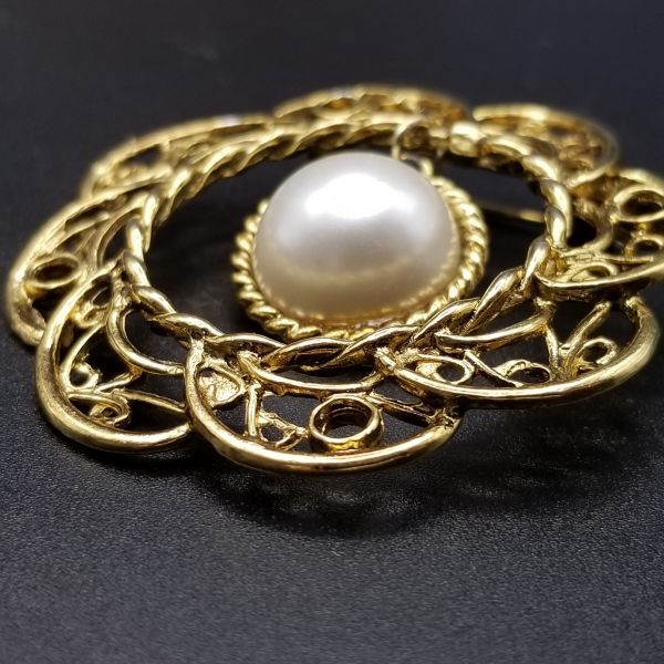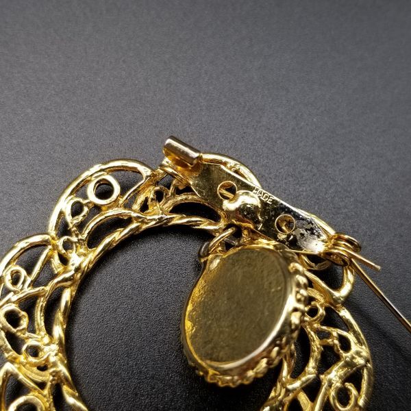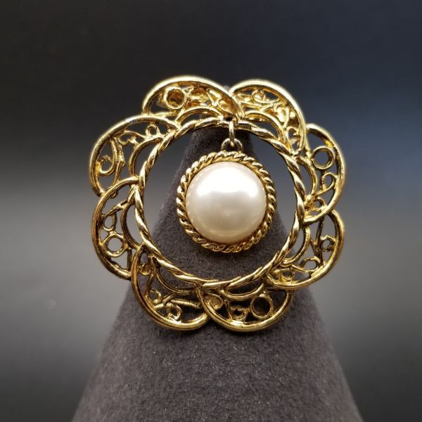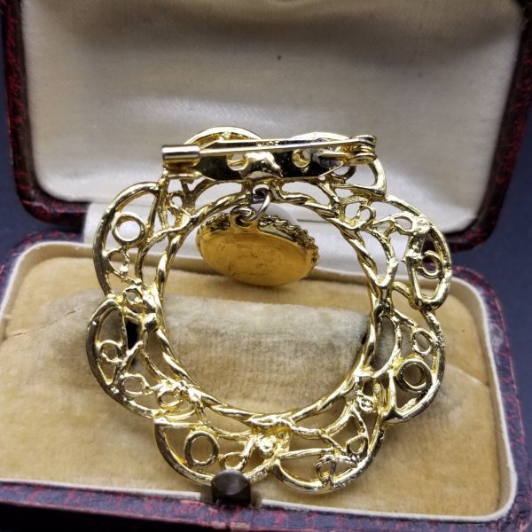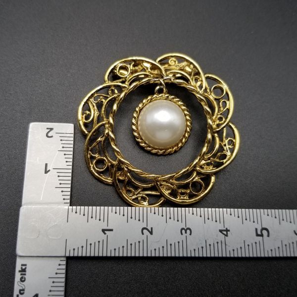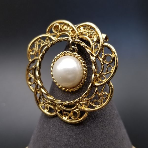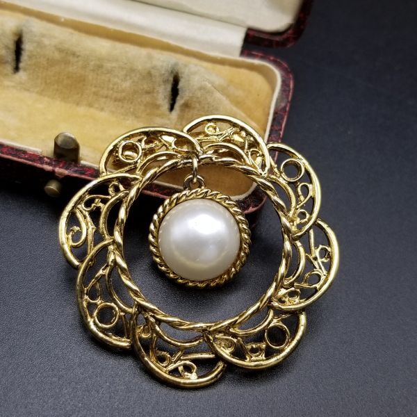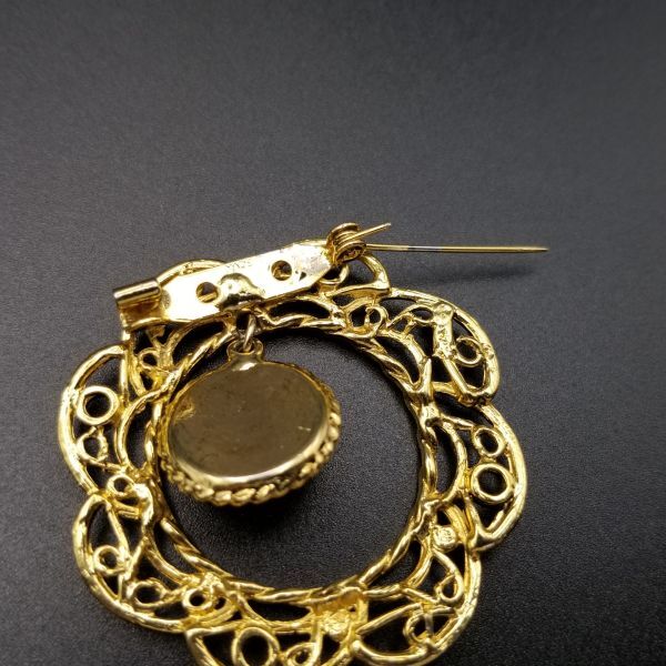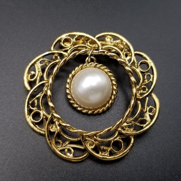パール装飾 リースフレーム ヴィンテージ ブローチ ゴールドトーン 揺れるチャーム 上品 クラシカル エレガント YAU74