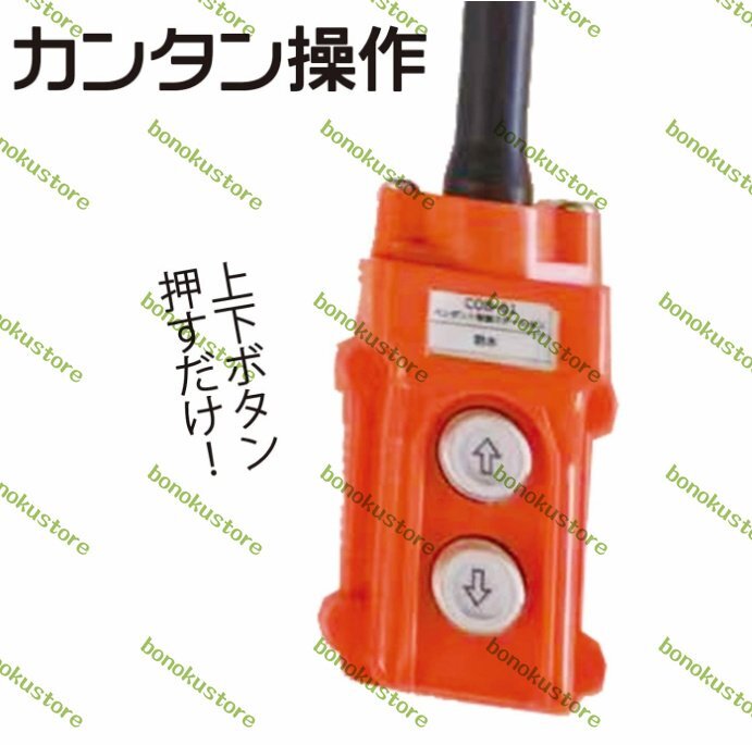 【三種類制御方式対応】有線タイプのリモコンだけでなく、無線タイプのリモコンも用意しており、障害物がなければ約60mの操作距離を持っています。さらに、本体のハンドルに昇降を操作するボタンも付きで、作業環境に応じて制御方式を自由に選べて、とても便利です。
