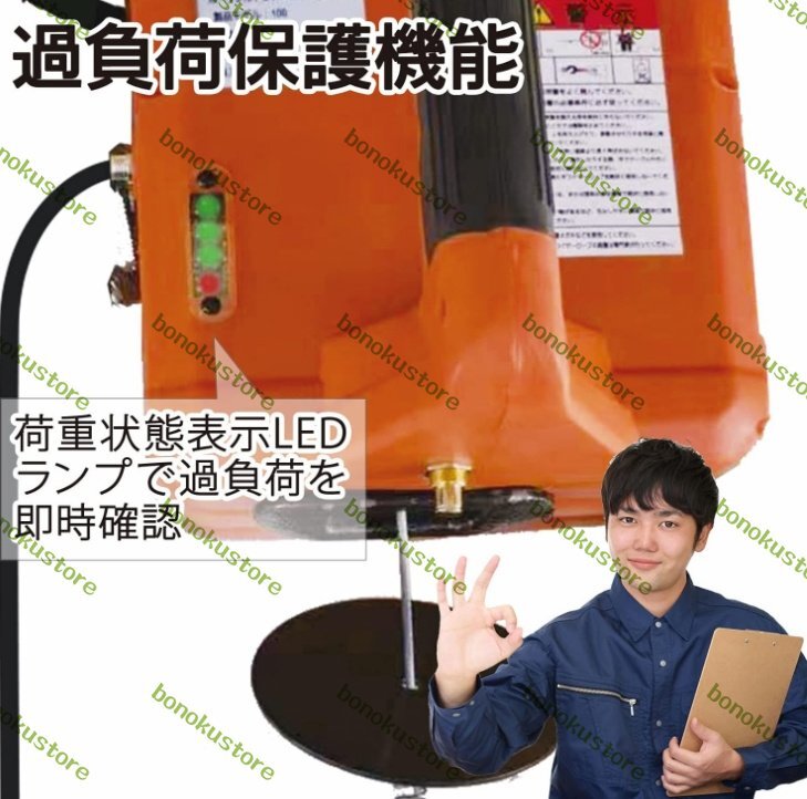 【商品詳細】本体重量:9.5KG、サイズ:20x22x16CM、電圧:110V、最大出力:1500W、定格荷重:500KG、リフト高さ:7.6M。