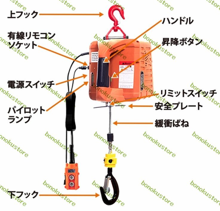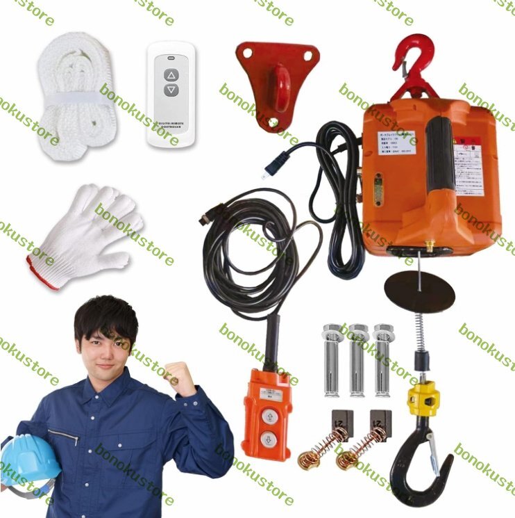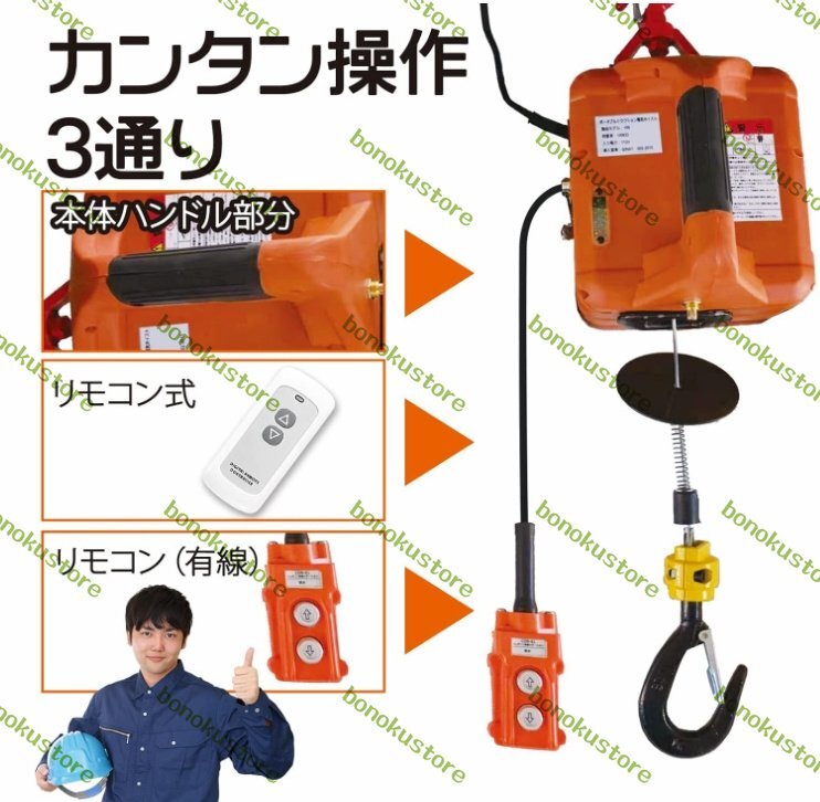 電動ウインチ 電動ホイスト 小型クレーン 巻き上げ機 吊り上げ能力500kg 1500W ワイヤレスリモコン制御+ワイヤ制御+手動制御 110V 高さ7.6M