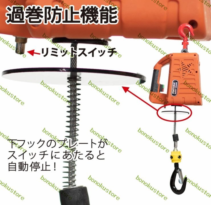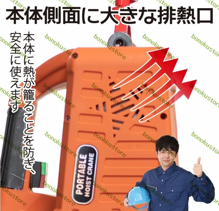 【安全性抜群】過巻き防止リミットスイッチ付き、下フックの安全プレートが本体のスイッチに当たった場合、モーターは自動的に停止し、ワイヤロープの過巻きを防止できます。本体側面に排熱穴がたくさん開けられており、使い過ぎによる部品を焼損する心配はありません。