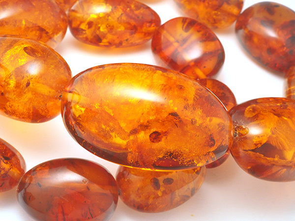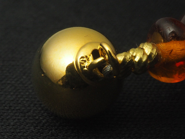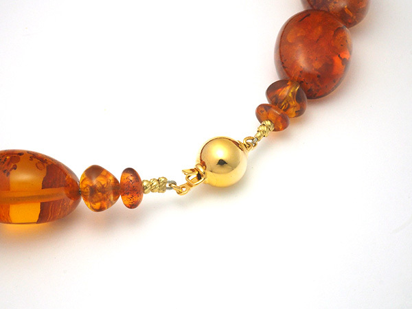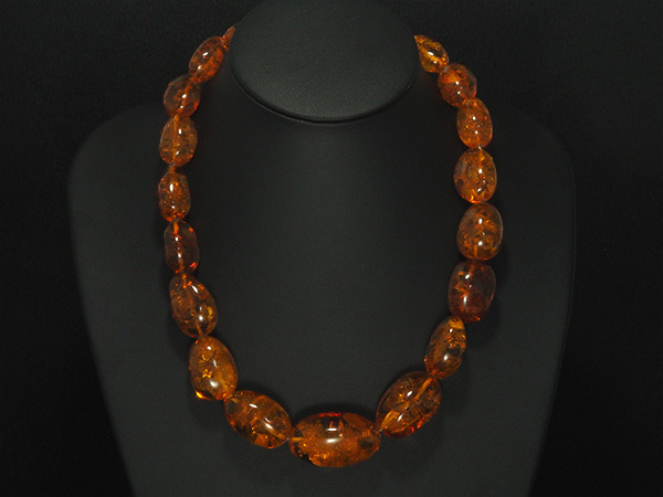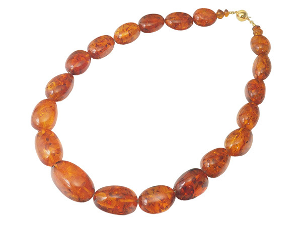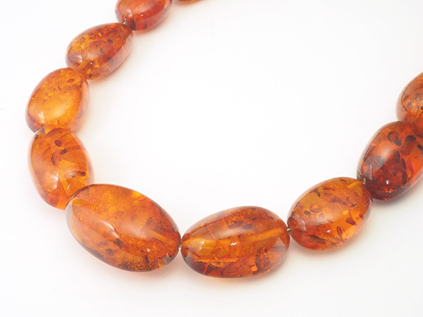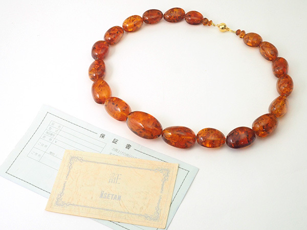 備考:太古の樹木が分泌した樹液が地中に埋もれ化石化した樹脂がコハクです。厄災から持ち主を守る石として人気のコハクを全周にセットしたネックレスです。コハク表面に薄い傷とへこみが見られますが、大きく目立つような傷は無く、良い状態のお品となっております。