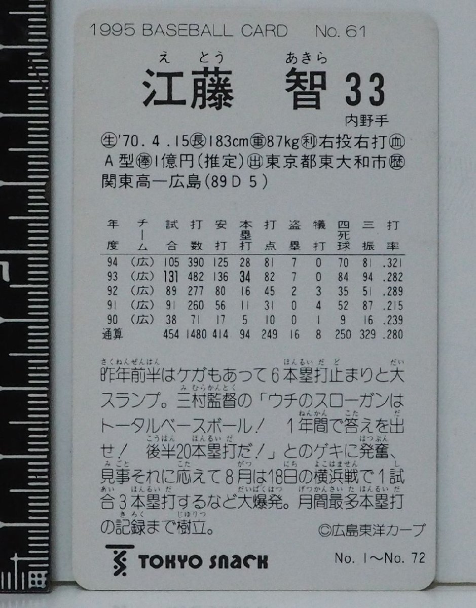 95年カルビー東京スナック プロ野球カードNo.61【江藤 智 内野手 広島東洋カープ】平成7年 1995年 当時物Calbeeおまけ食玩BASEBALL 中古