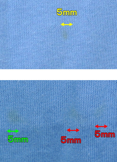 黄色い丸:5ミリ、みどりの丸:5ミリ、赤の丸:5ミリ(左)と1センチ(右)