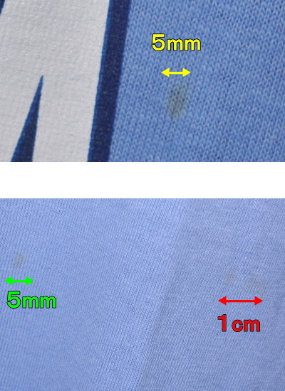 フロントと裏、それぞれにオレンジ色の濃淡のシミが複数ございます。詳細は下記をご参照ください。