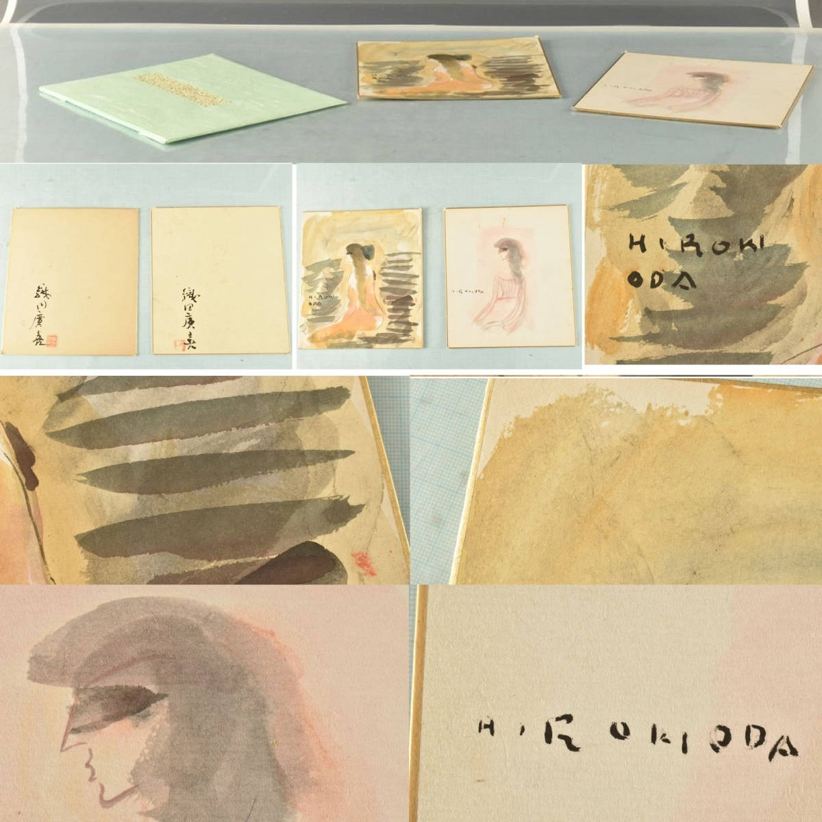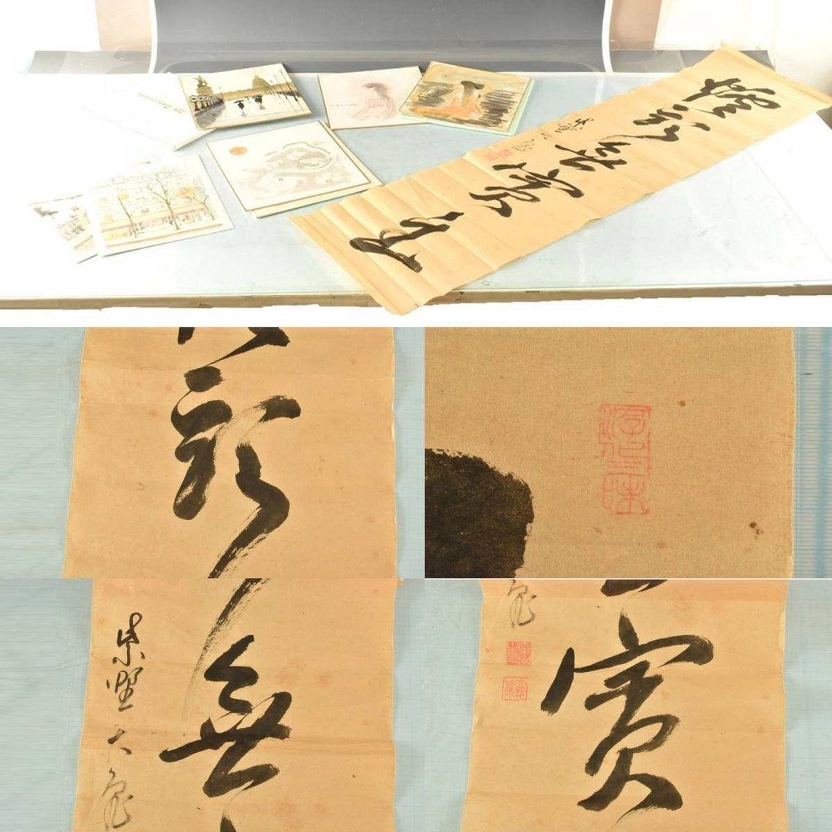 状態:紙本・肉筆。書は本紙に焼け・染み・折れ、破れ、所々に穴あり。色紙などは染み・汚れ、角に傷みあり。他、大体良好。各在銘。箱無し。【色紙】縦:27.2センチ 横;24.2センチ。