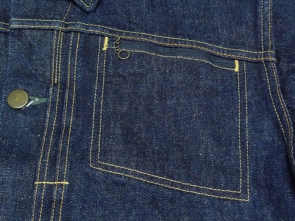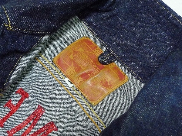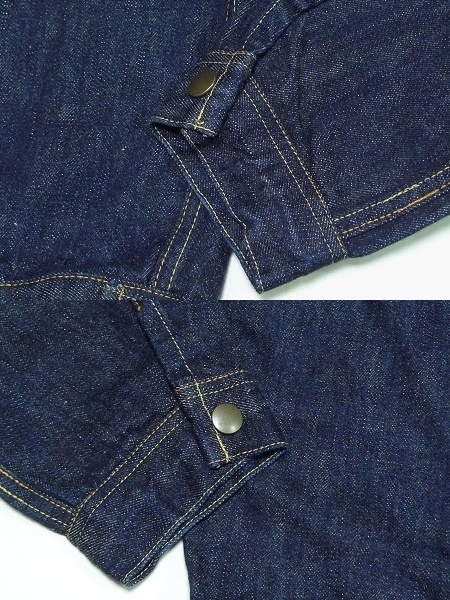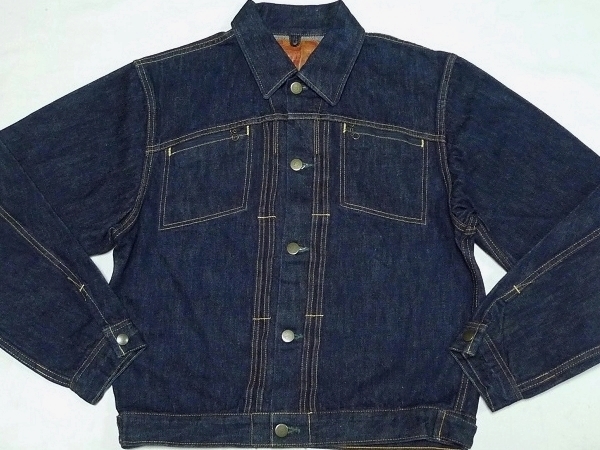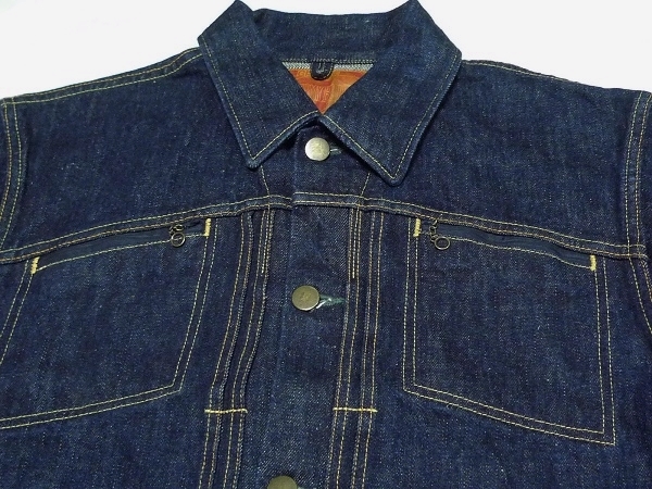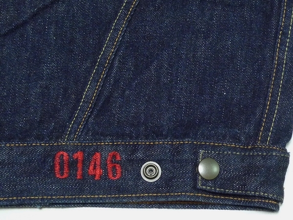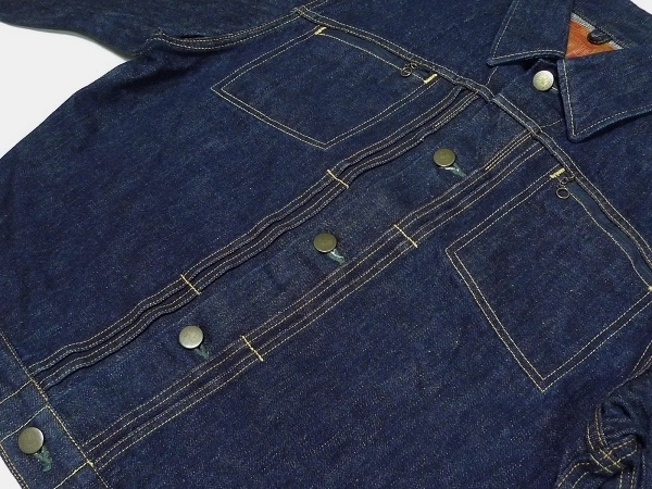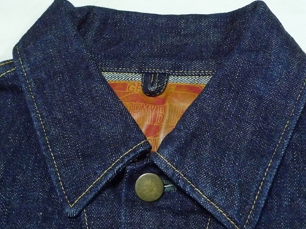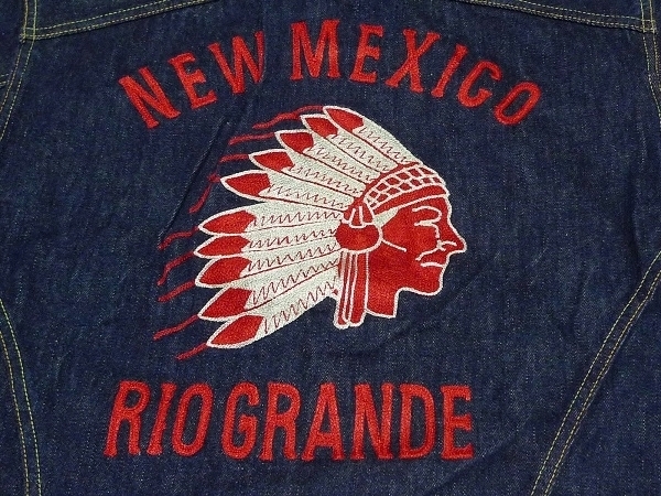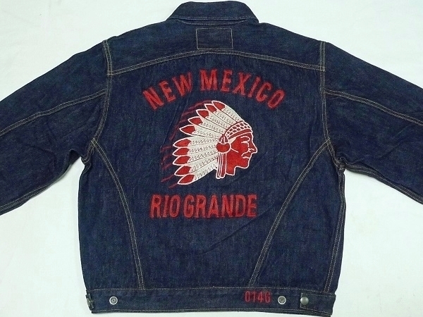 「フェローズ L.PHERROW」のアメリカン・カジュアルライン「STORMY BLUE ストーミー・ブルー」の2000年記念に製造、限定販売された「SBR-2-JL RIO GRANDE」の38(M相当)になります。(定価35,800円、税込み39,380円)。シリアルナンバーは「0146」、カラーはインディゴでソフトな風合いに仕上げたリンス・ウォッシュ加工がほどこされています。アメリカン・ヴィンテージの歴史の中でもマニアックなデニム・ジャケットとなる「シアーズ・ローバック」モデルをモチーフに再現したデニム・ジャケットの背面にネィティブ・モチーフの刺繍を施したモーターサイクル・テイストな刺繍カスタムが施されたフェローズによるオリジナル・デニム・ジャケットになります。でフロントはボタン・フロント、両胸に斜めに取り付けられたジップ付の胸ポケット、フロント・プリーツ、オレンジとイエローの縫製ステッチ、右綾13.75ozセルビッチ・デニム(ピンク耳)を使用、ボタンは首ふりボタン、スナップ類は「SCOVILL」社製のブラス・スナップ、「STORMY BLUE」表記のレザーラベルといったヴィンテージな雰囲気を再現したこだわりの仕様となります。状態はウォッシュ加工モデルで全体に洗いざらした感じに仕上がっています。実際の着用による使用感の殆ど無い非常にきれいな状態で色落ちもほとんど無く、保管時の刺繍部分の糸のホツレや変色などのダメージのある箇所も無いほぼ未使用の非常に良い状態になると思います。実寸は着丈(衿下より)約58cm、肩幅(直線で)約46cm、身幅(腋下で)約52cm、袖丈(肩口から先まで)約59cmとなります。(素人採寸ですので多少の誤差はお許し下さい。)日本製。2000年に数量限定で販売された「フェローズ L.PHERROW」のプレミアム・モデルで現在では入手が困難な非常にレアなモデルとなります。**画像にある背面のシワは保管時の畳しわで着用時には消えると思います。** | |||