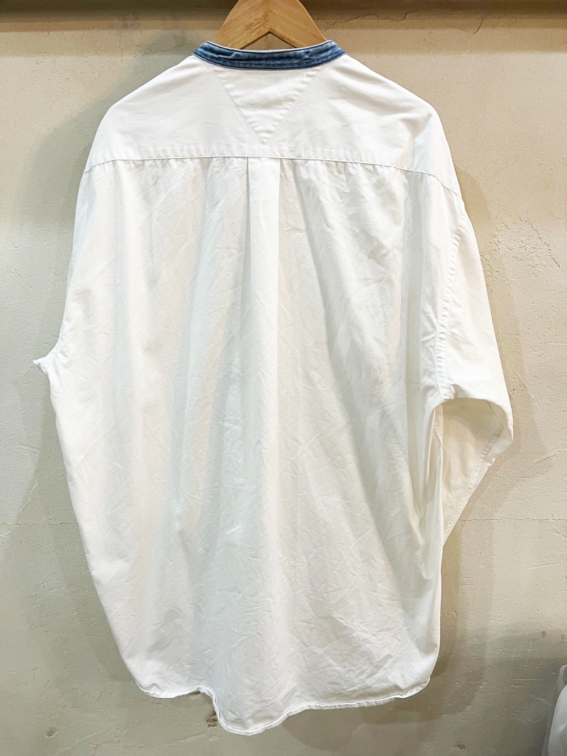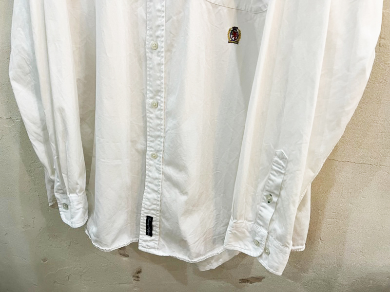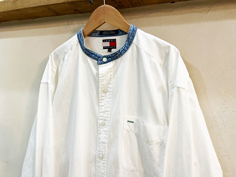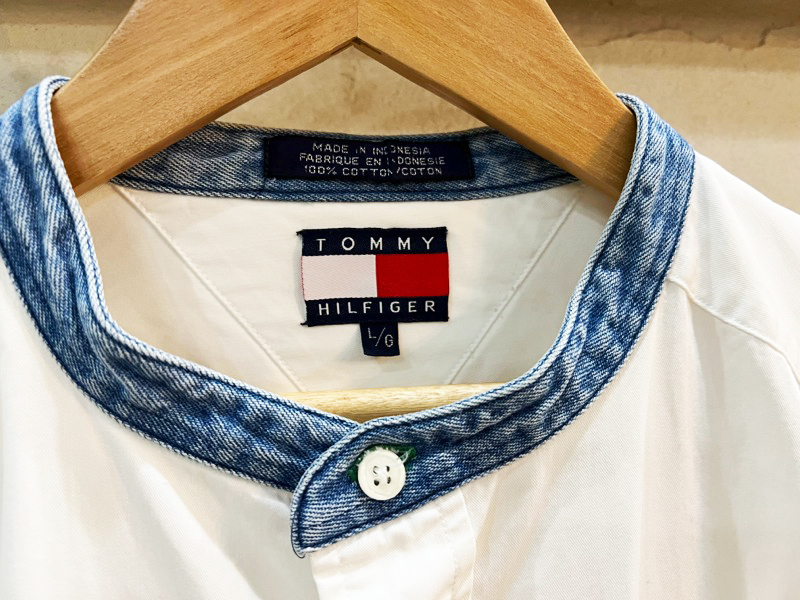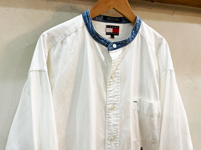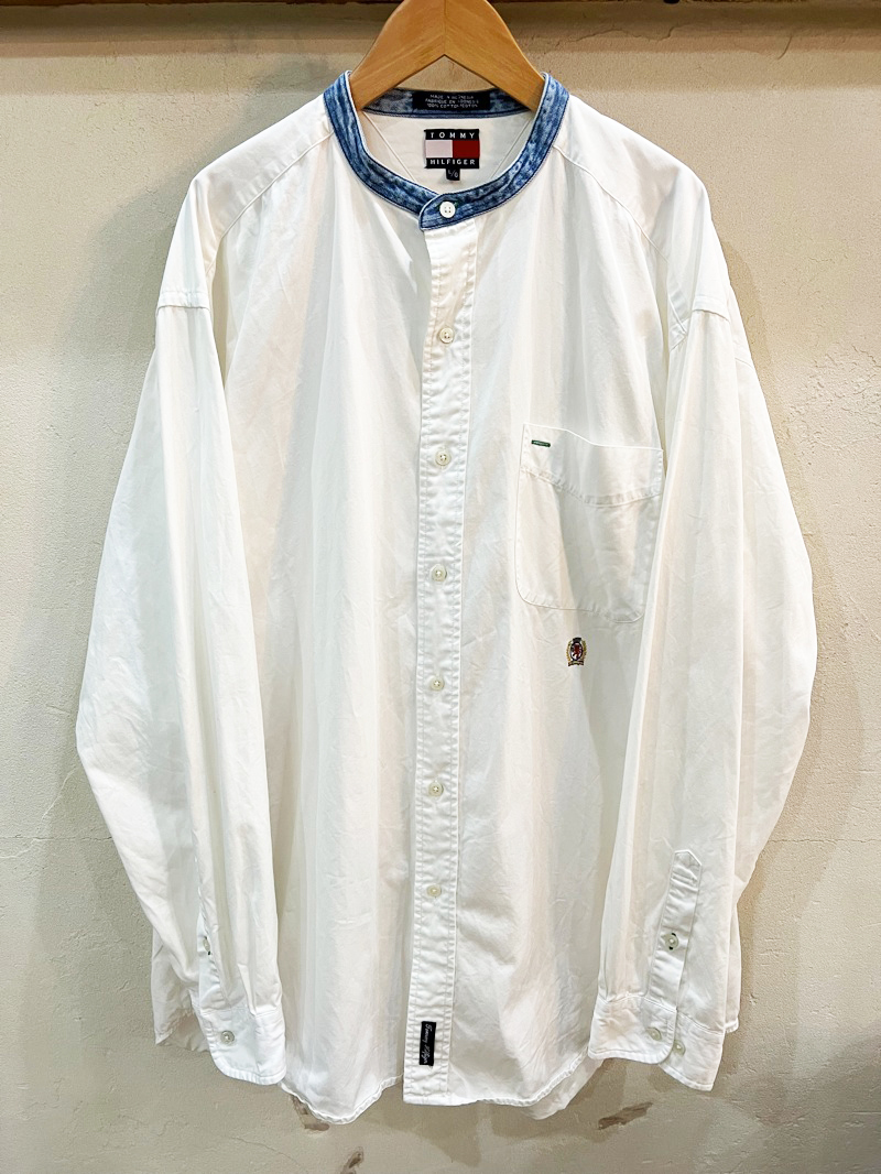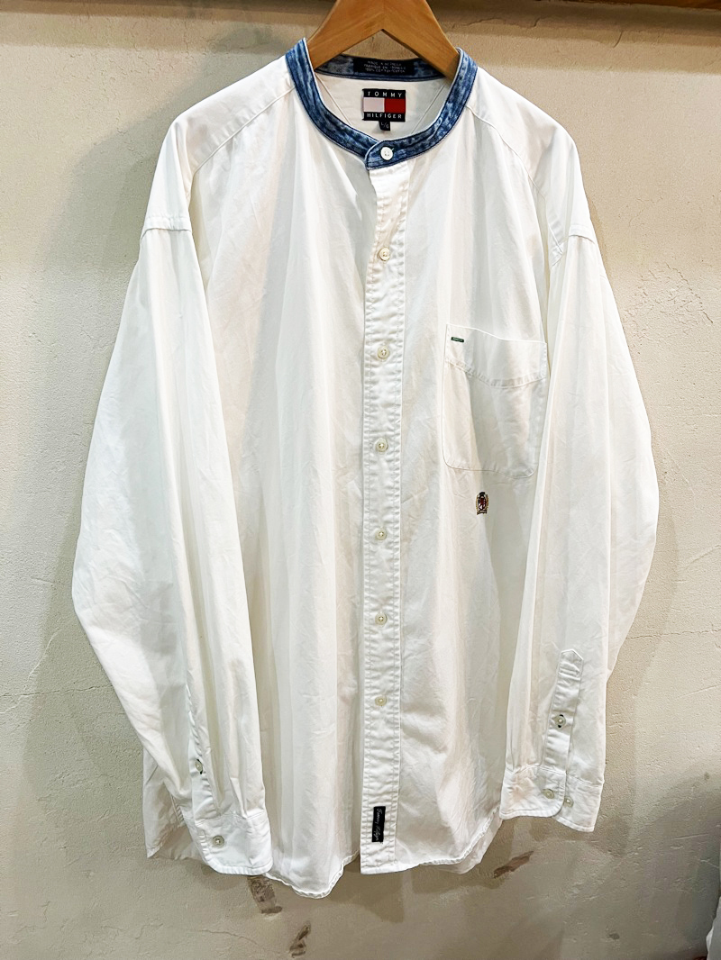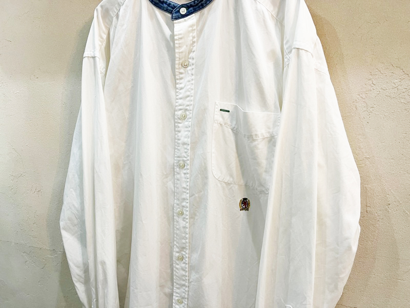 2157★TOMMY HILFIGRE/トミーヒルフィガー ノーカラーエンブレム刺繍コットンシャツ メンズ 長袖シャツ Lサイズ 90's 古着 USED ★