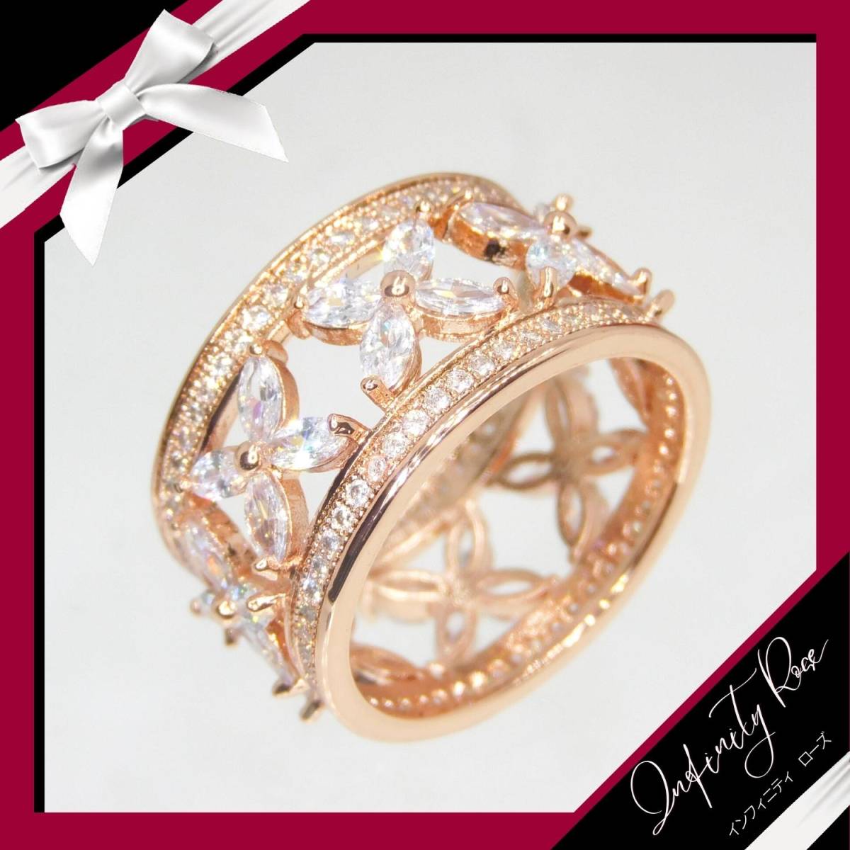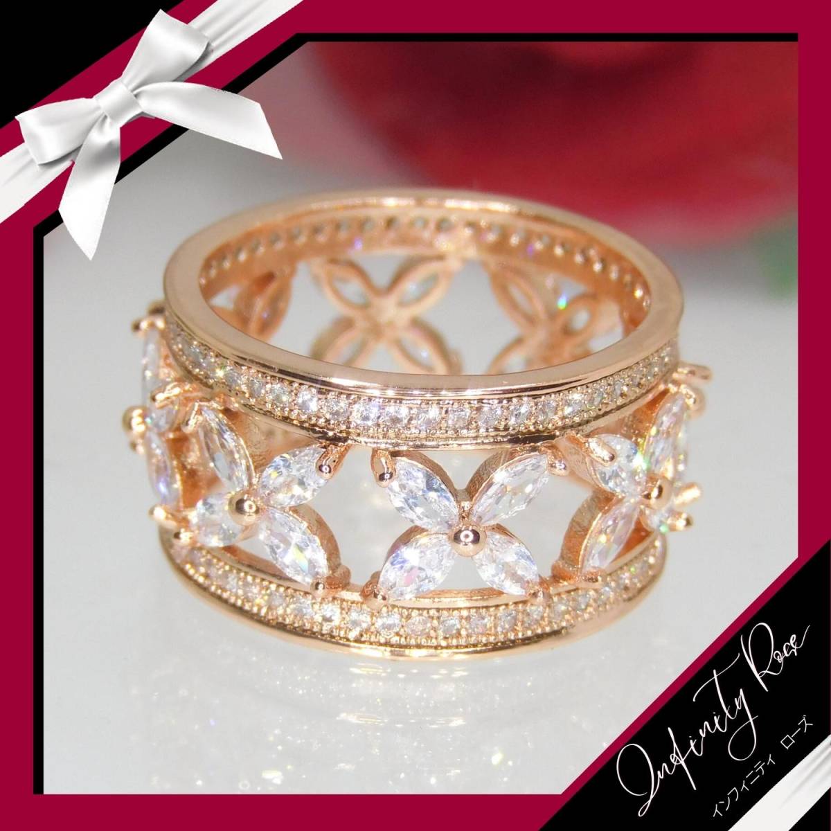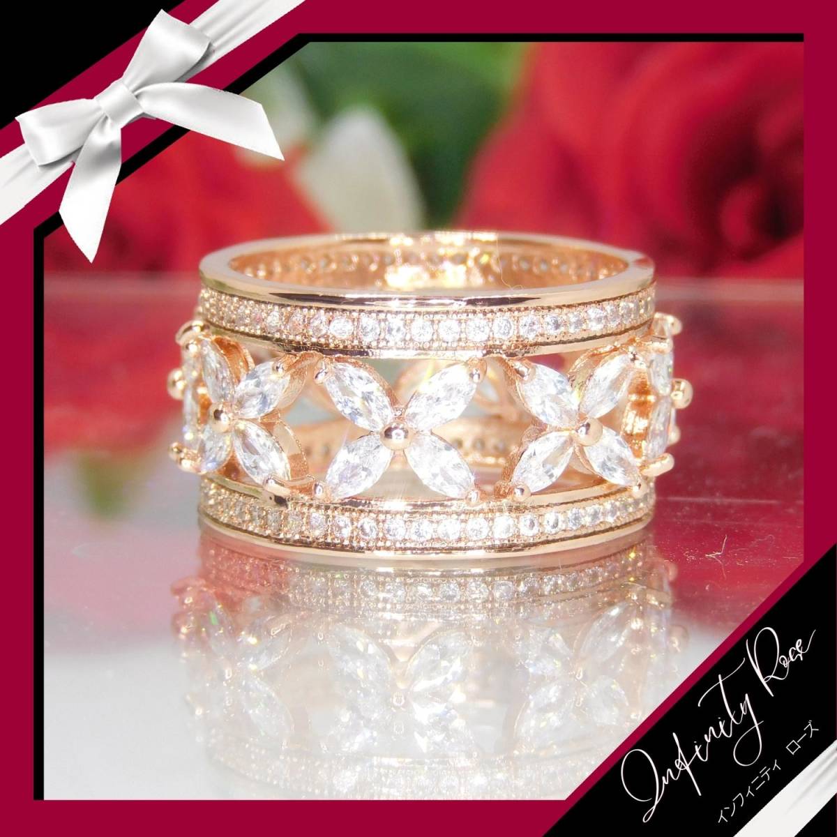 (1228)16号 ピンクゴールド豪華無数のフラワーワイドリング高品質 指輪 指輪 スワロフスキー製クリスタル使用