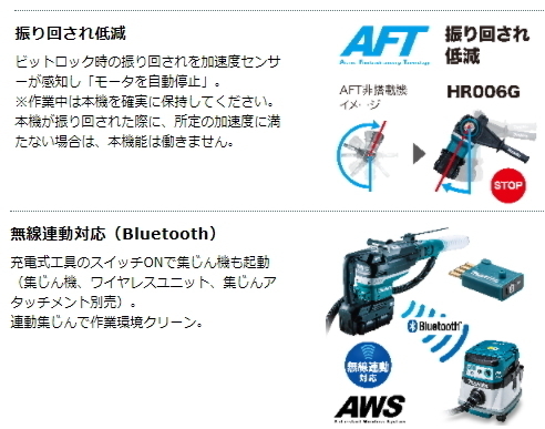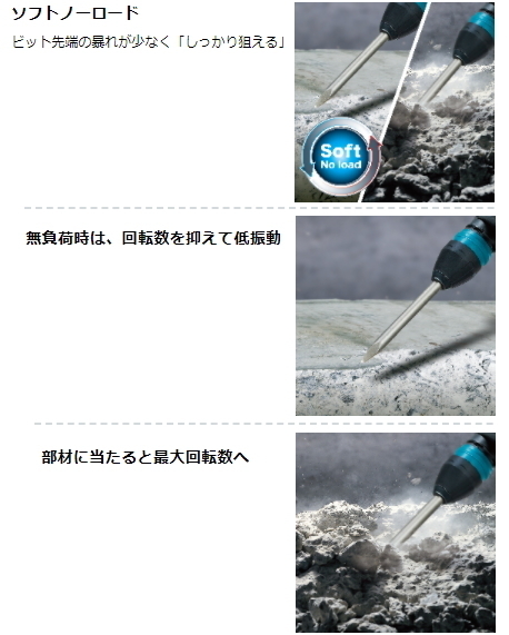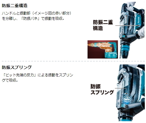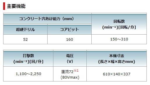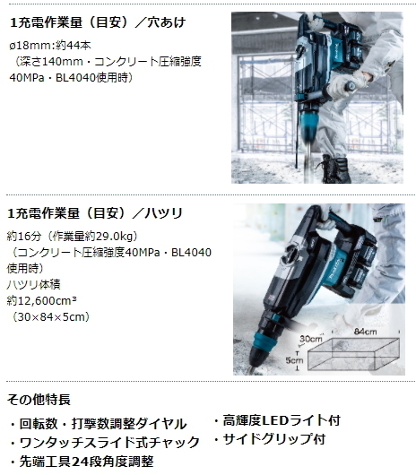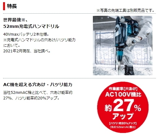 マキタ52mmAC機と比べて、穴あけ能率約27%、ハツリ能率約20%アップ。