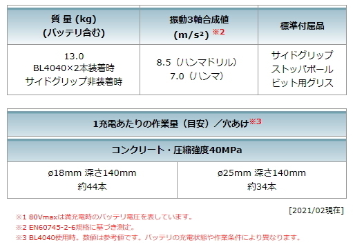 40Vmaxバッテリ2本仕様。※充電式ハンマドリルの穴あけ/ハツリ能力において。2021年2月現在、マキタ調べ。